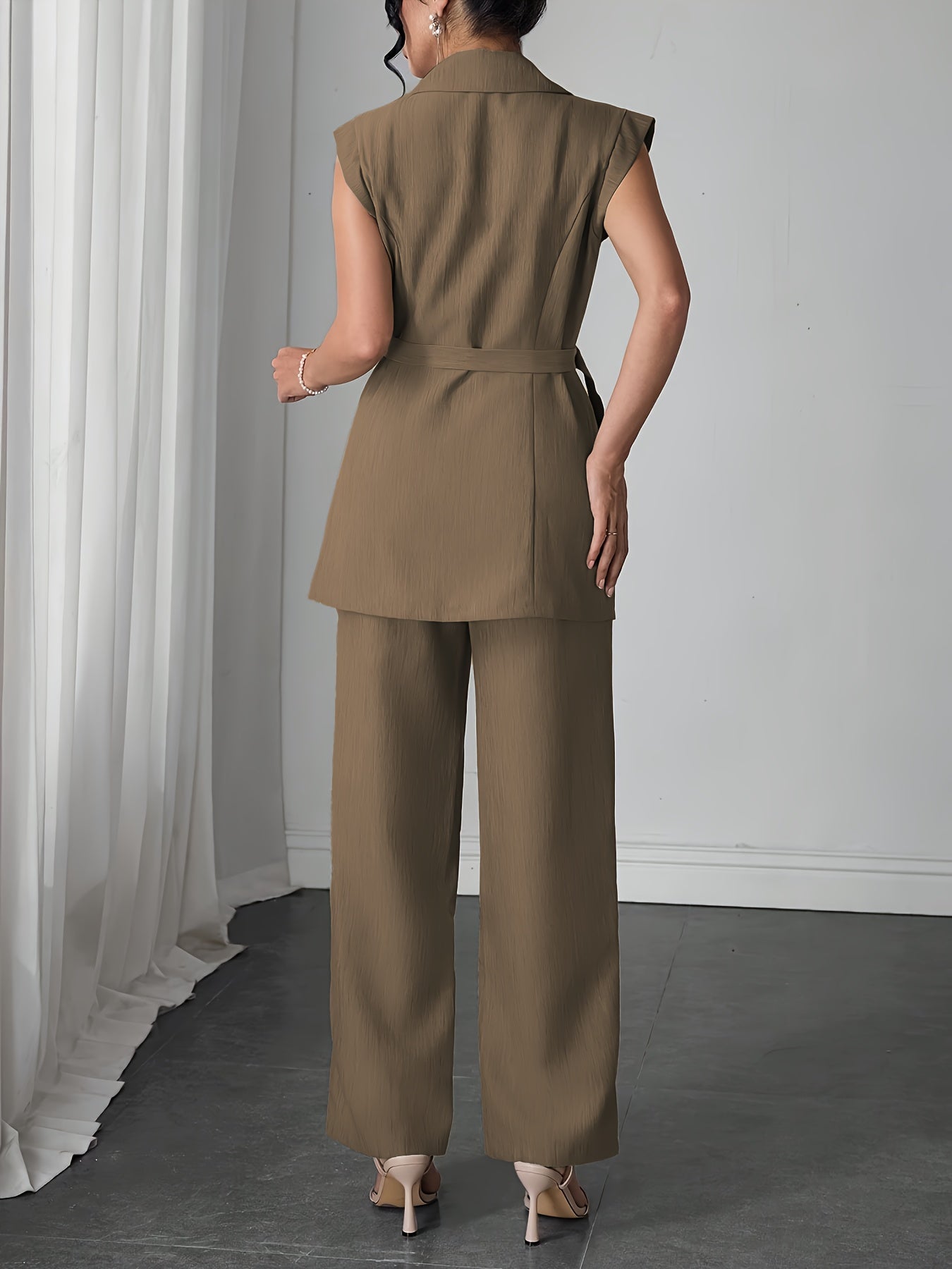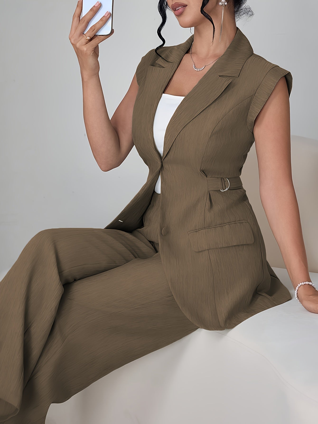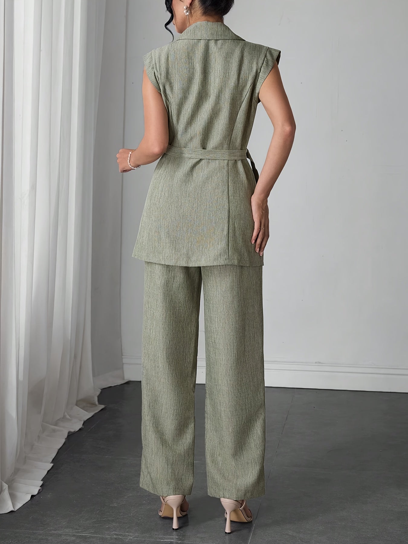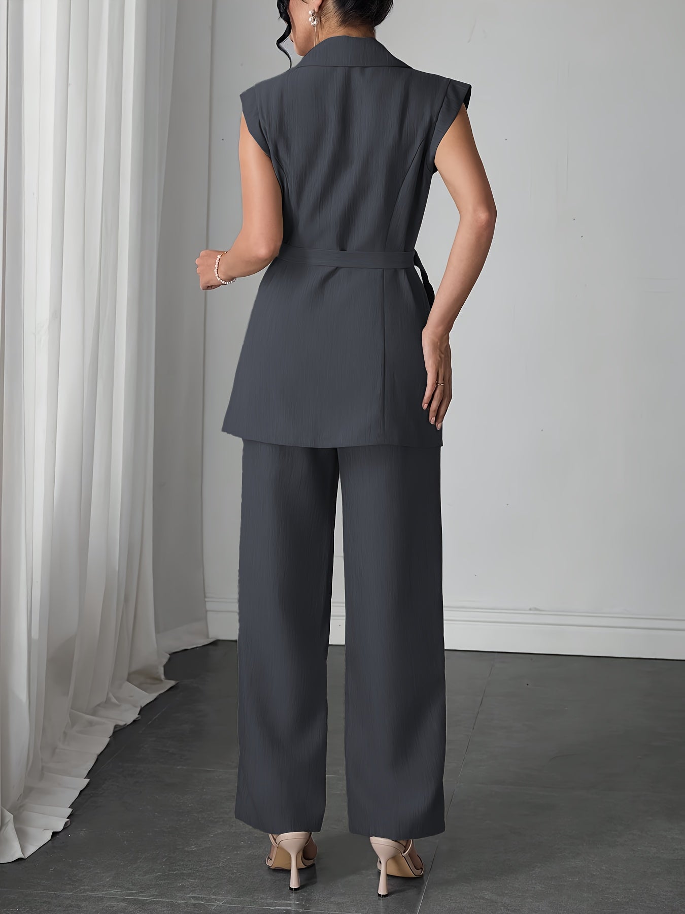 Գարուն/ամառվա նորաձև կանացի, էլեգանտ, ժամանակակից, երկկտոր հավաքածու՝ կողային գոտկատեղի դիզայնով, միագույն անթև բաճկոն և տաբատ