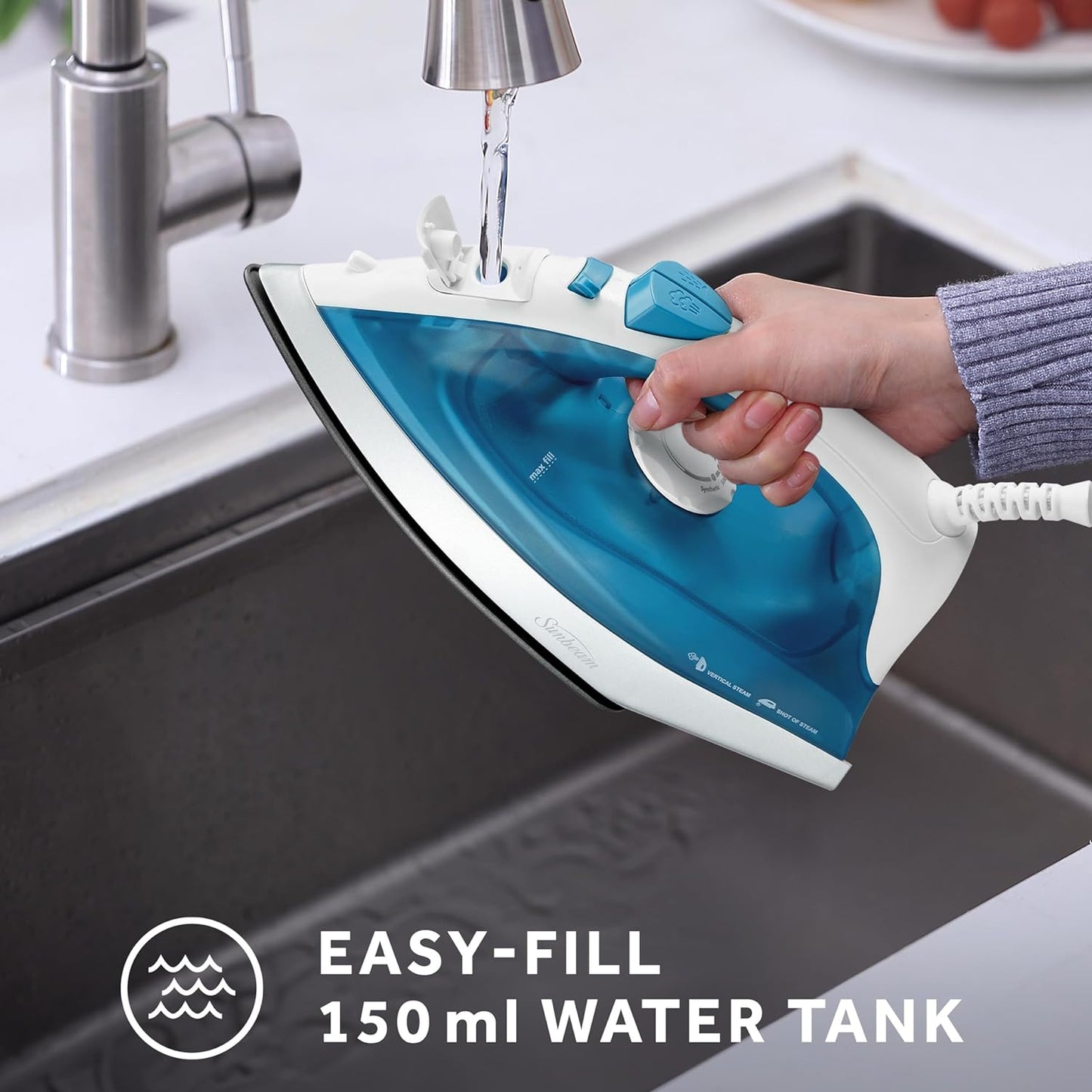Sunbeam կոմպակտ գոլորշու արդուկ, 1200 Վտ, չկպչուն թիթեղ, գոլորշու հզոր կրակոց, հորիզոնական կամ ուղղահայաց, մառախուղ, ճշգրիտ ծայր, սպիտակ/կապույտ