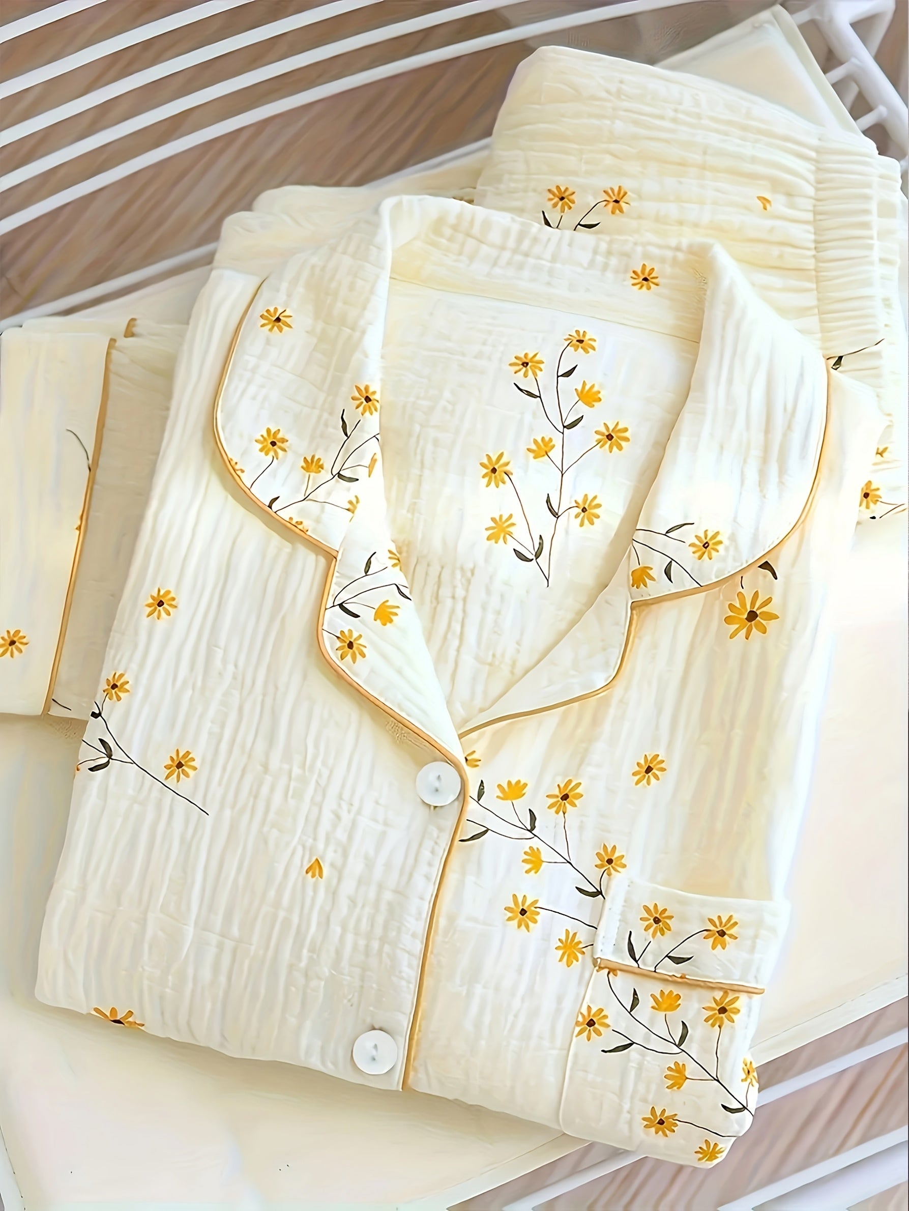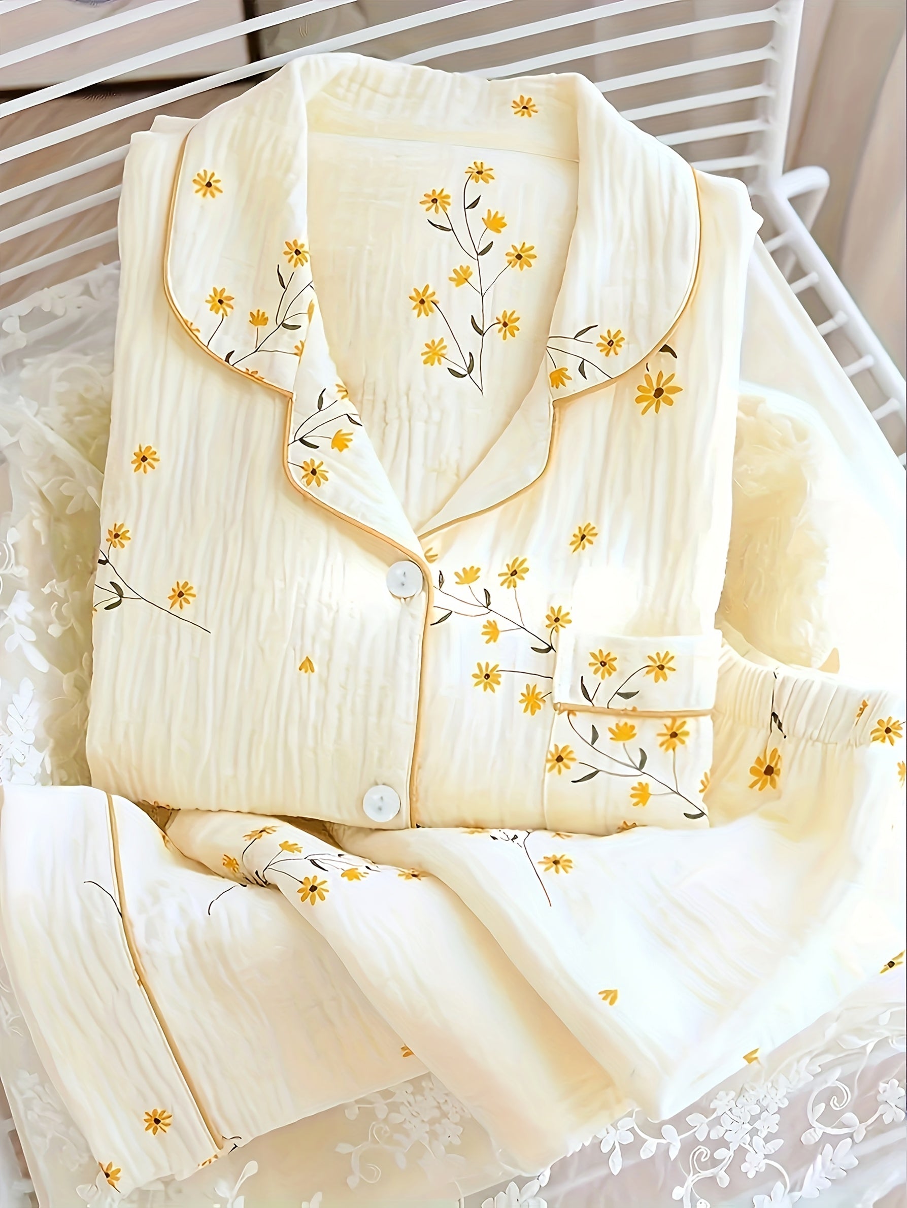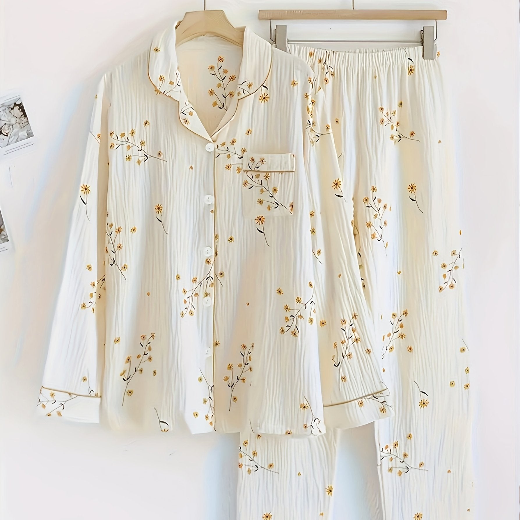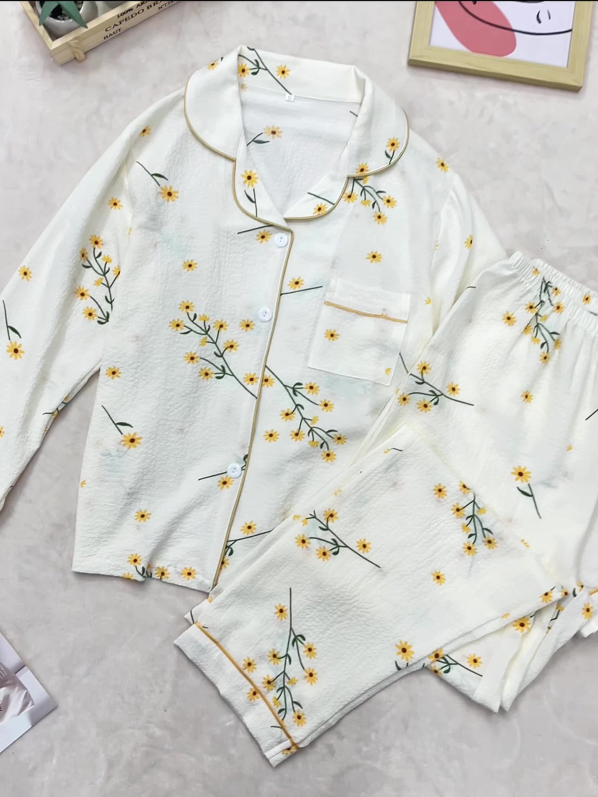 Աշնանային և ձմեռային քաղցր ծաղկային նախշերով տեքստուրային պիժամայի հավաքածու, երկար թևքերով, կոճակներով, օձիքով վերնաշապիկ և առաձգական տաբատ, կանացի գիշերային և տնային հագուստ