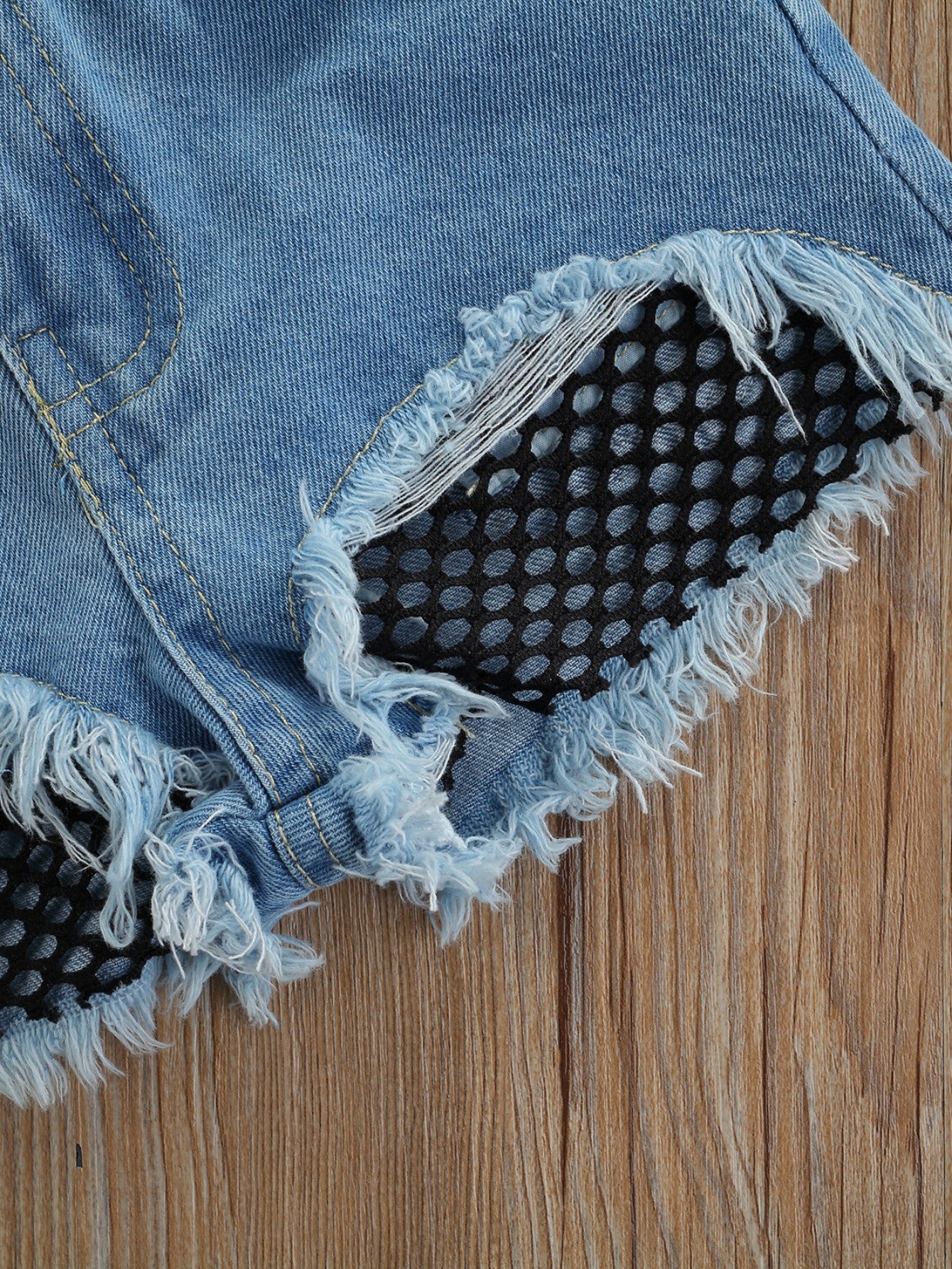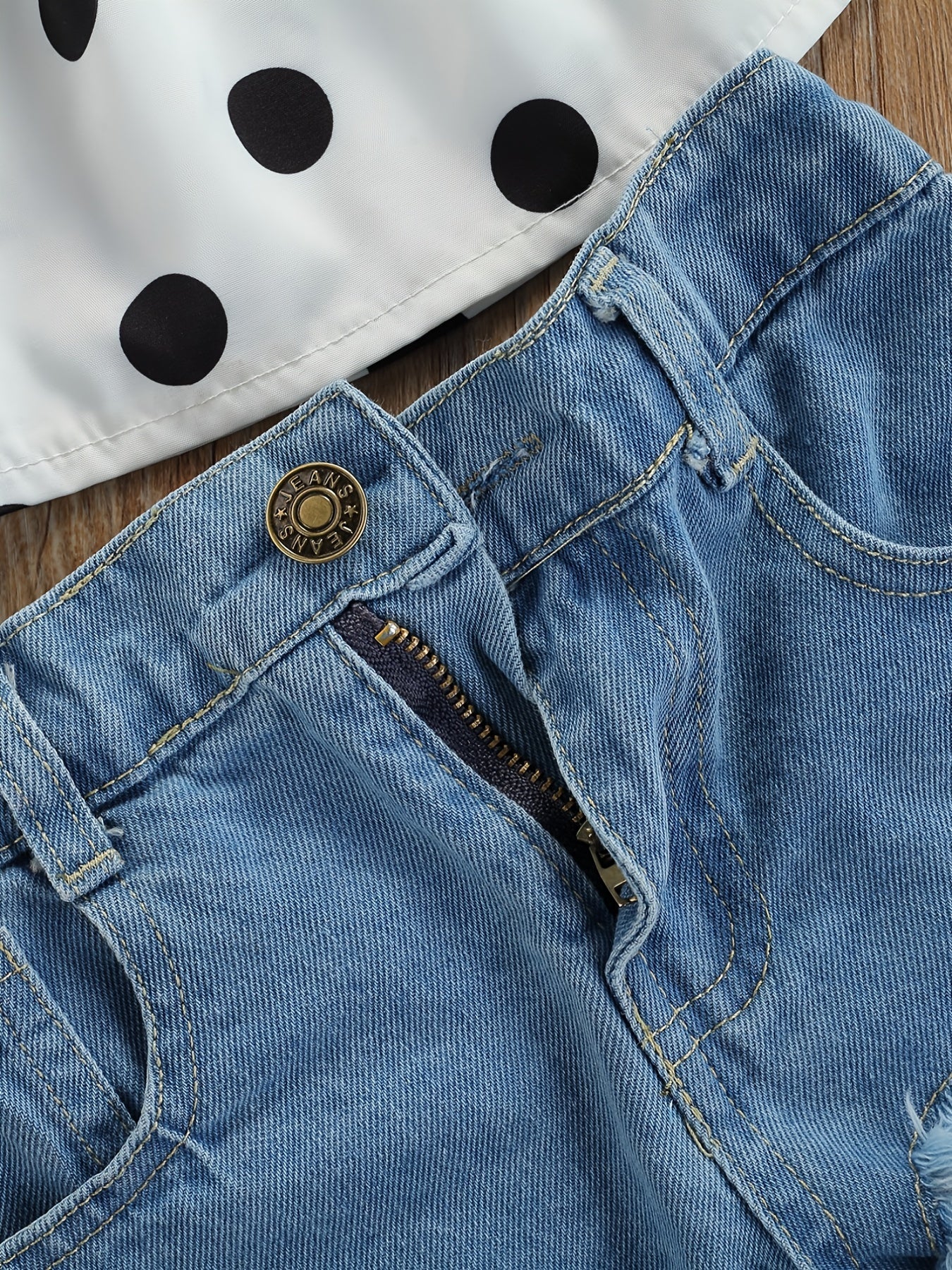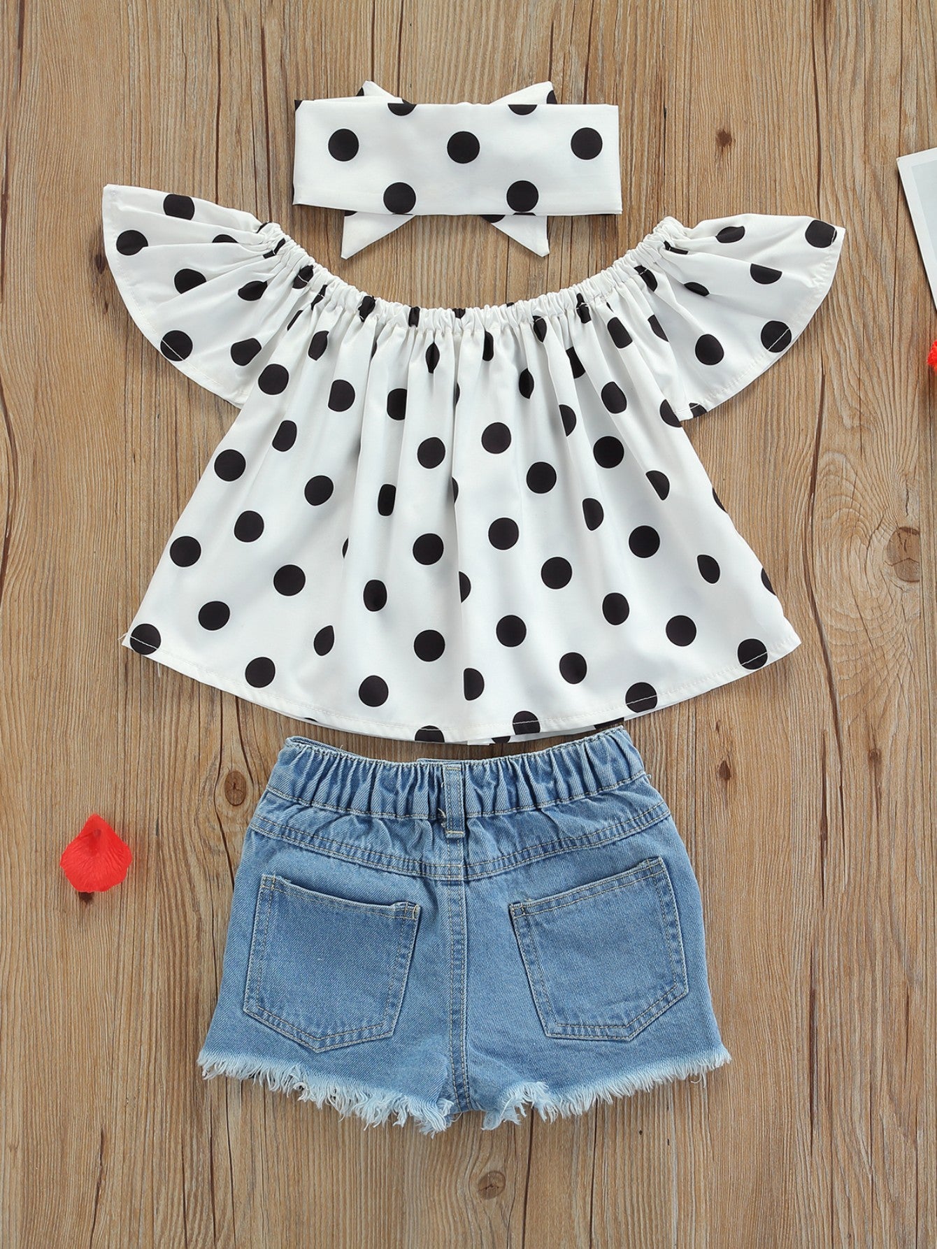 Փոքրիկ մանկական աղջիկների պոլկա կետերը ուսերին վերև և ջինսե կարճ և գլխաշոր Մանկական հագուստի հավաքածու Ամառային բացօթյա հանդերձանք
