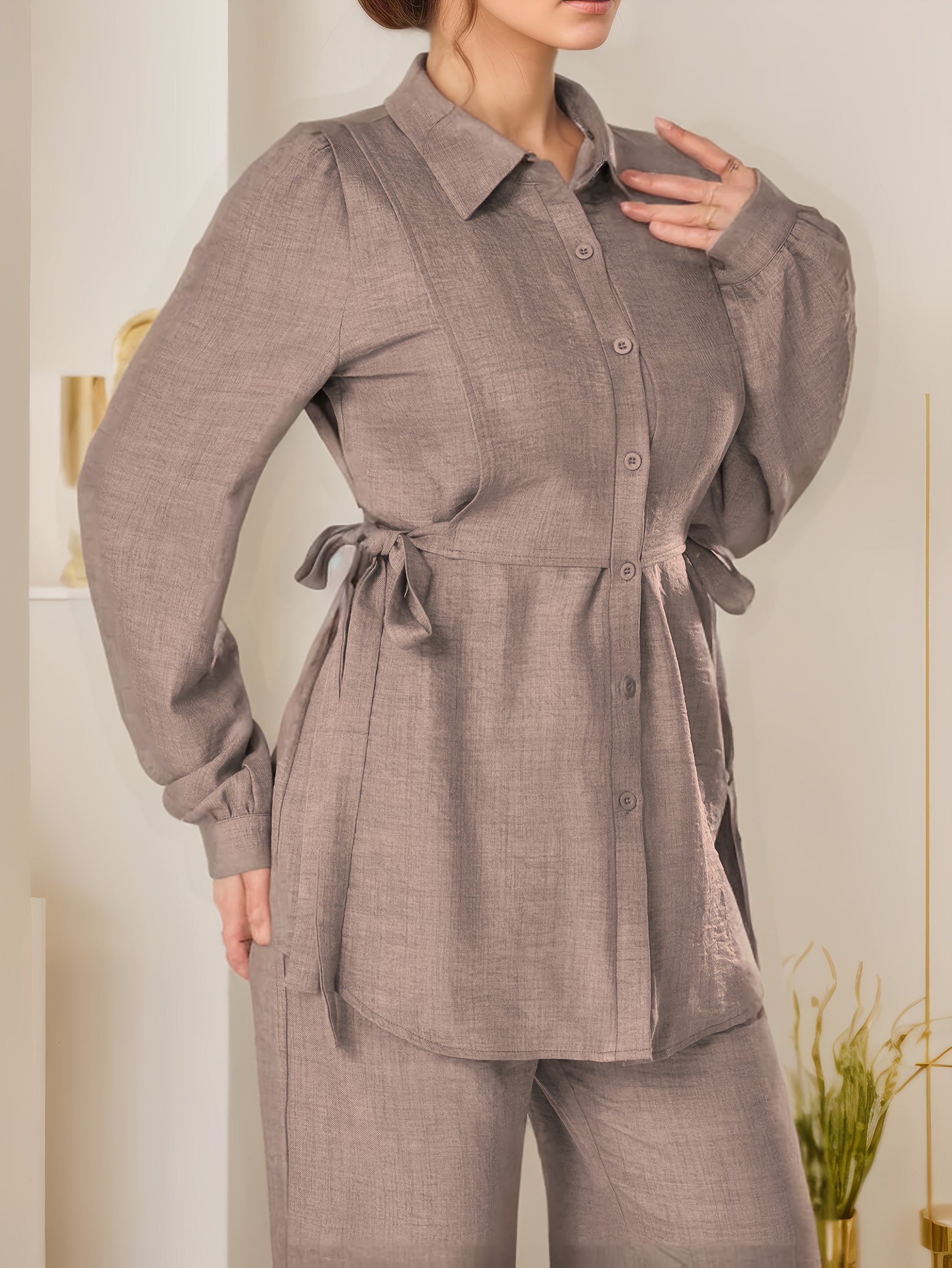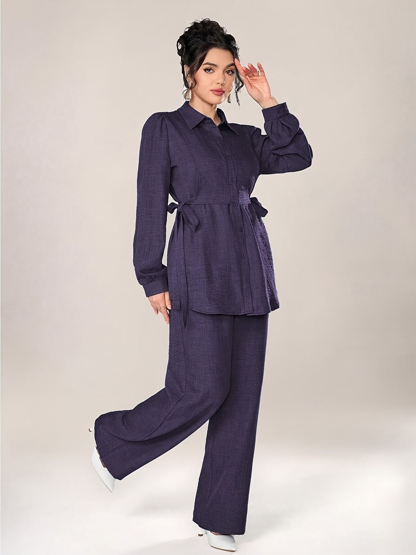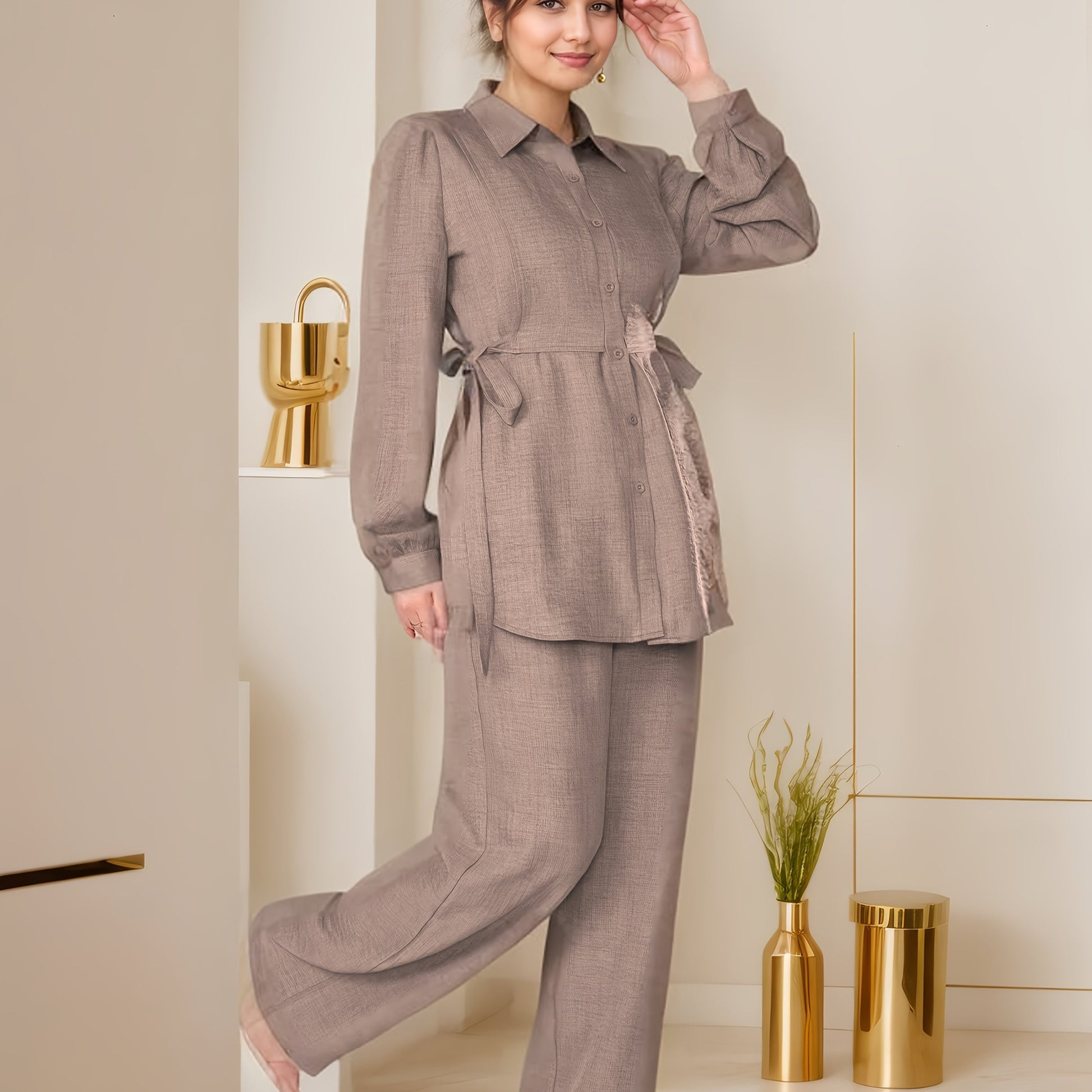 Երկու կտոր աբայայի հավաքածու լայն տաբատով, երկար թևքերով դիզայնով և մեջքի կապով, հարմար է գրասենյակի և առօրյա հագուստի համար, փափուկ և ձգվող գործվածք, էլեգանտ մերձավորարևելյան ոճով, հարմարավետ, լվացվող մեքենայով, գործնական և նորաձև