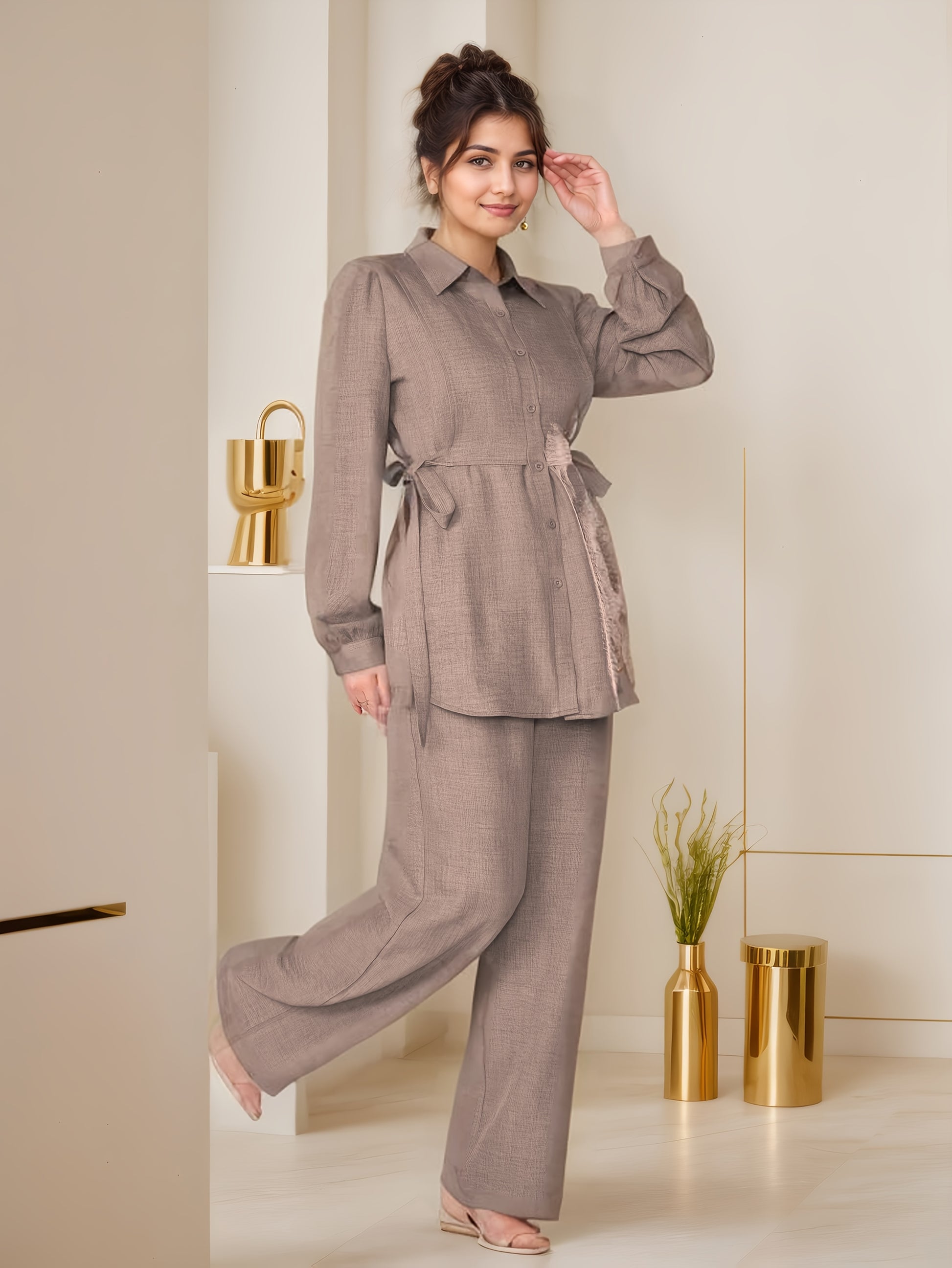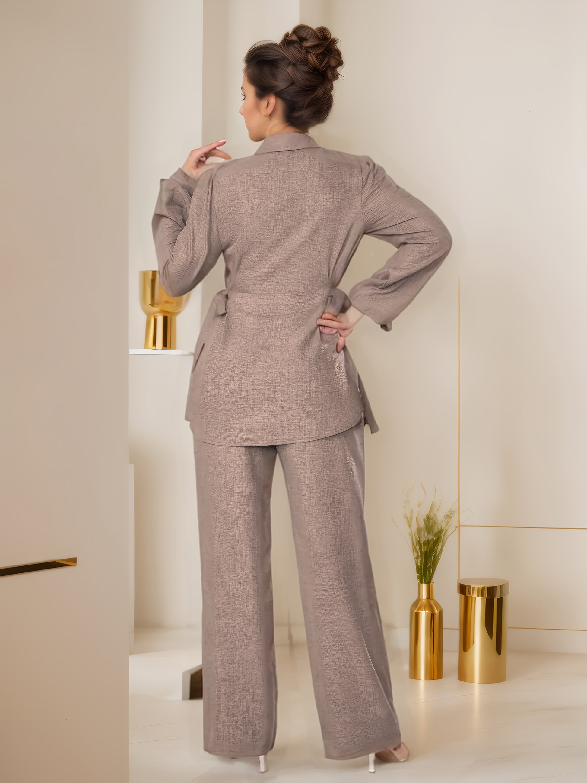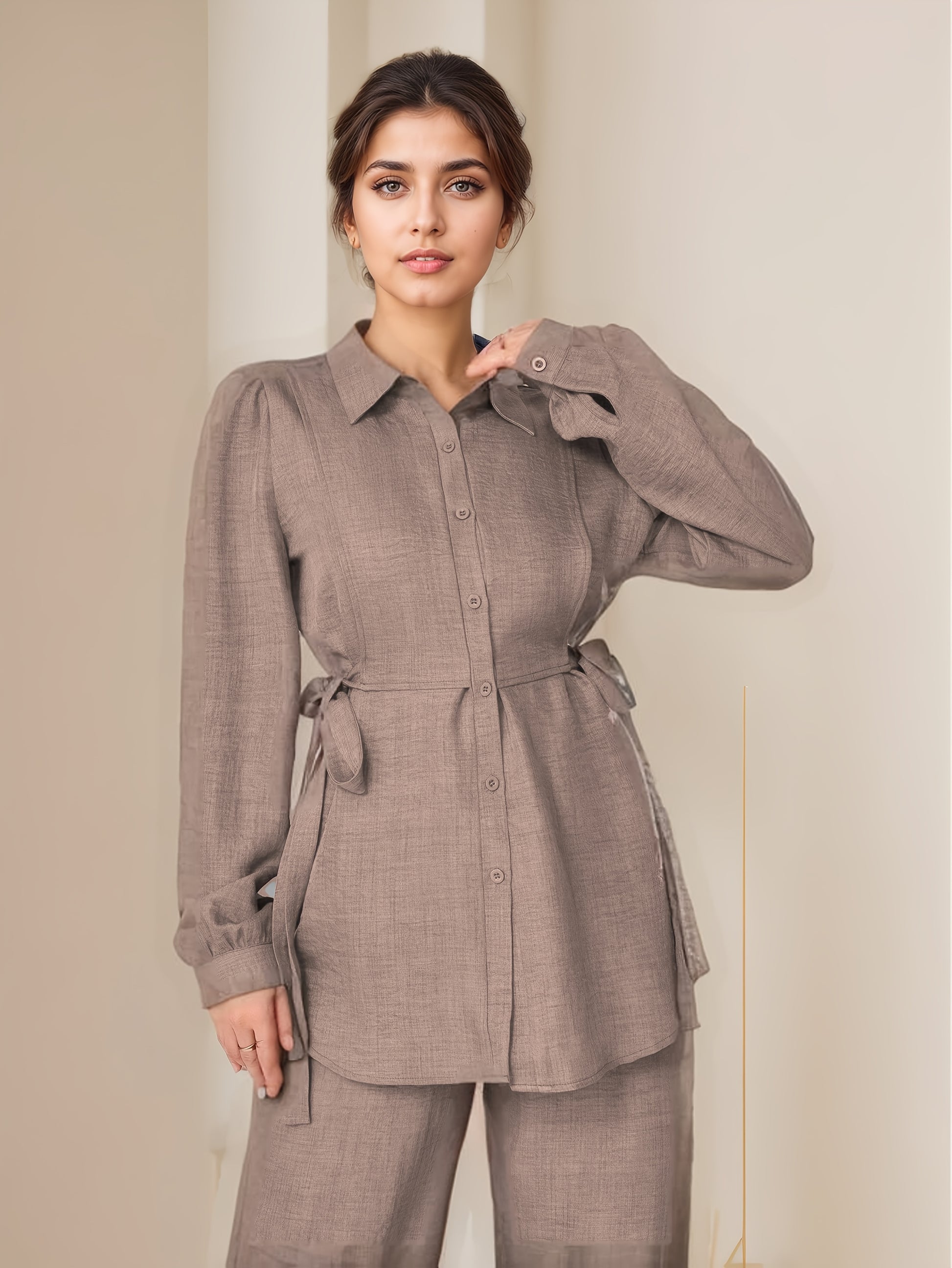 Երկու կտոր աբայայի հավաքածու լայն տաբատով, երկար թևքերով դիզայնով և մեջքի կապով, հարմար է գրասենյակի և առօրյա հագուստի համար, փափուկ և ձգվող գործվածք, էլեգանտ մերձավորարևելյան ոճով, հարմարավետ, լվացվող մեքենայով, գործնական և նորաձև