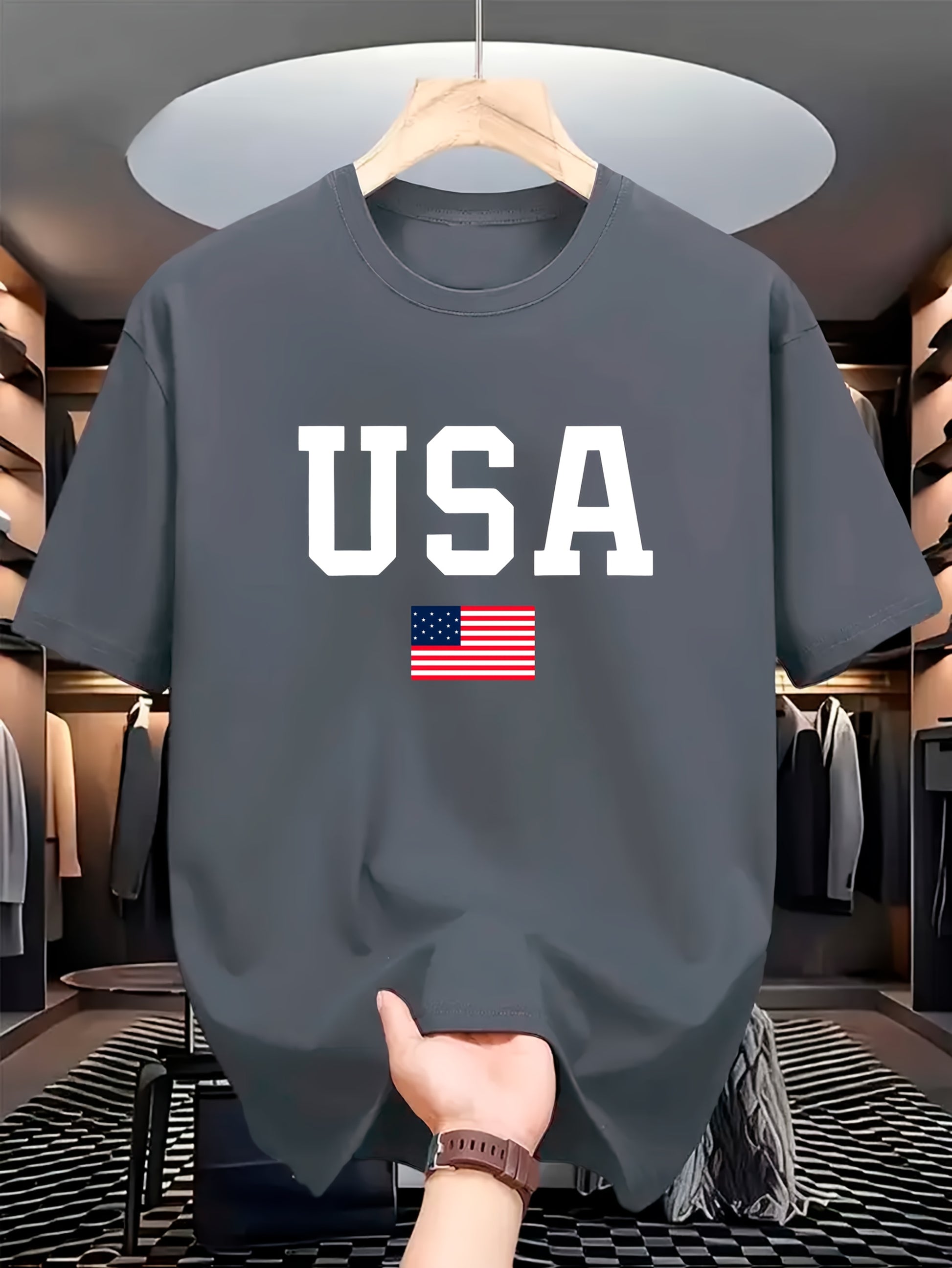 USA Flag Print Crew պարանոցի վերնաշապիկ, սովորական պոլիեսթեր տրիկոտաժե թիկնոց, թեթև ձգվող, այբուբենի ձևանմուշ, տրիկոտաժե դետալ, տղամարդկանց համար, ամառային կարճաթև շապիկ