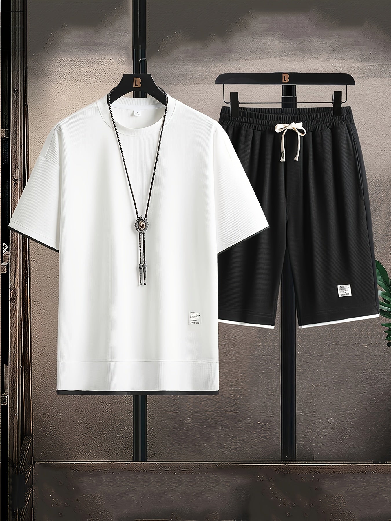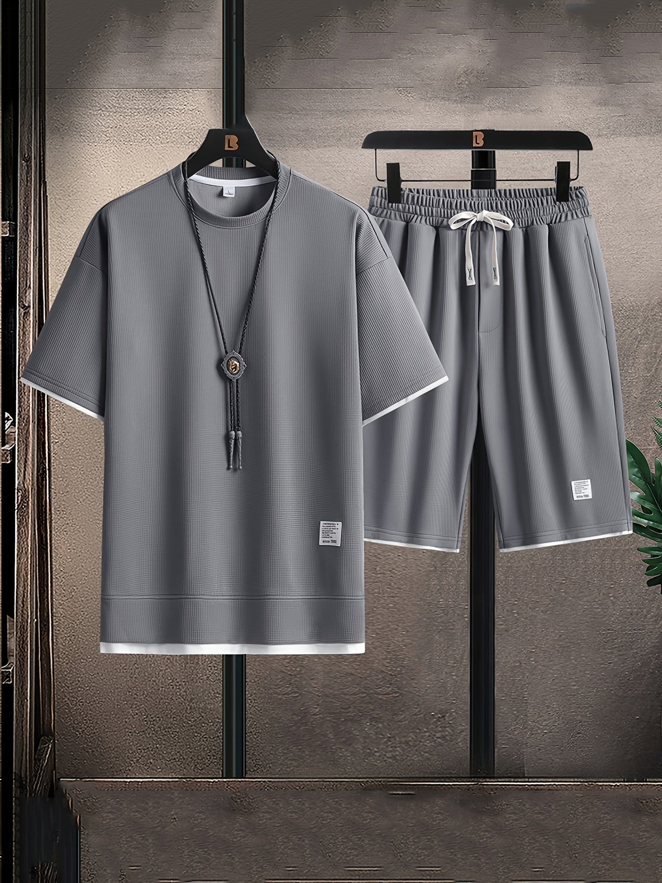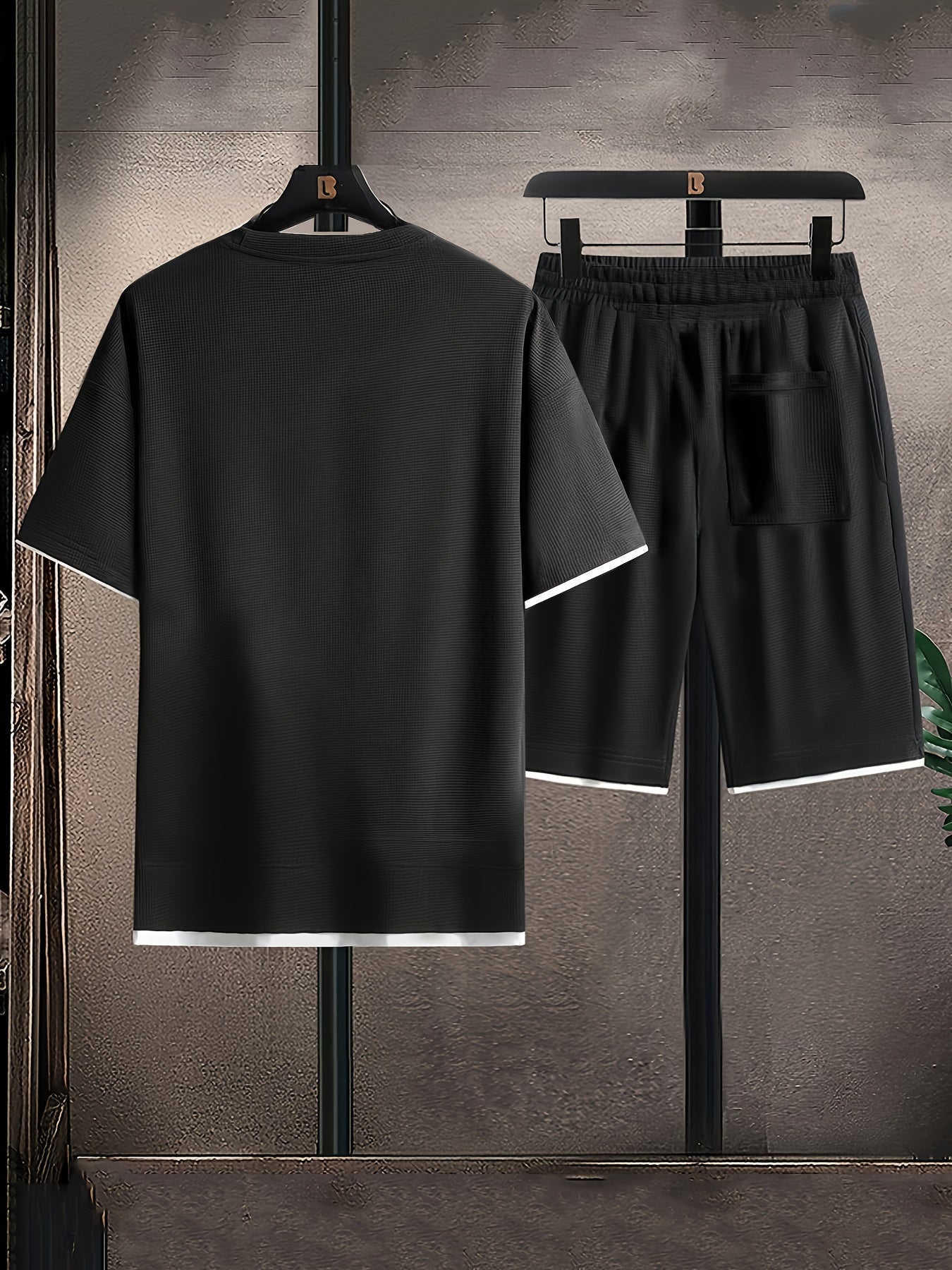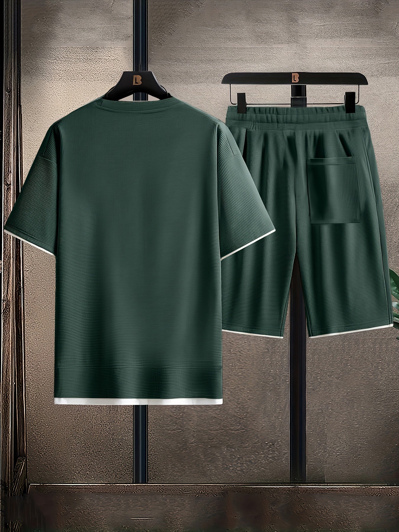 Waffle Grid տղամարդու նորաձև կլոր վզնոցով շապիկ, շնչող, առօրյա սպորտային կոստյում, երկմասանոց հավաքածու