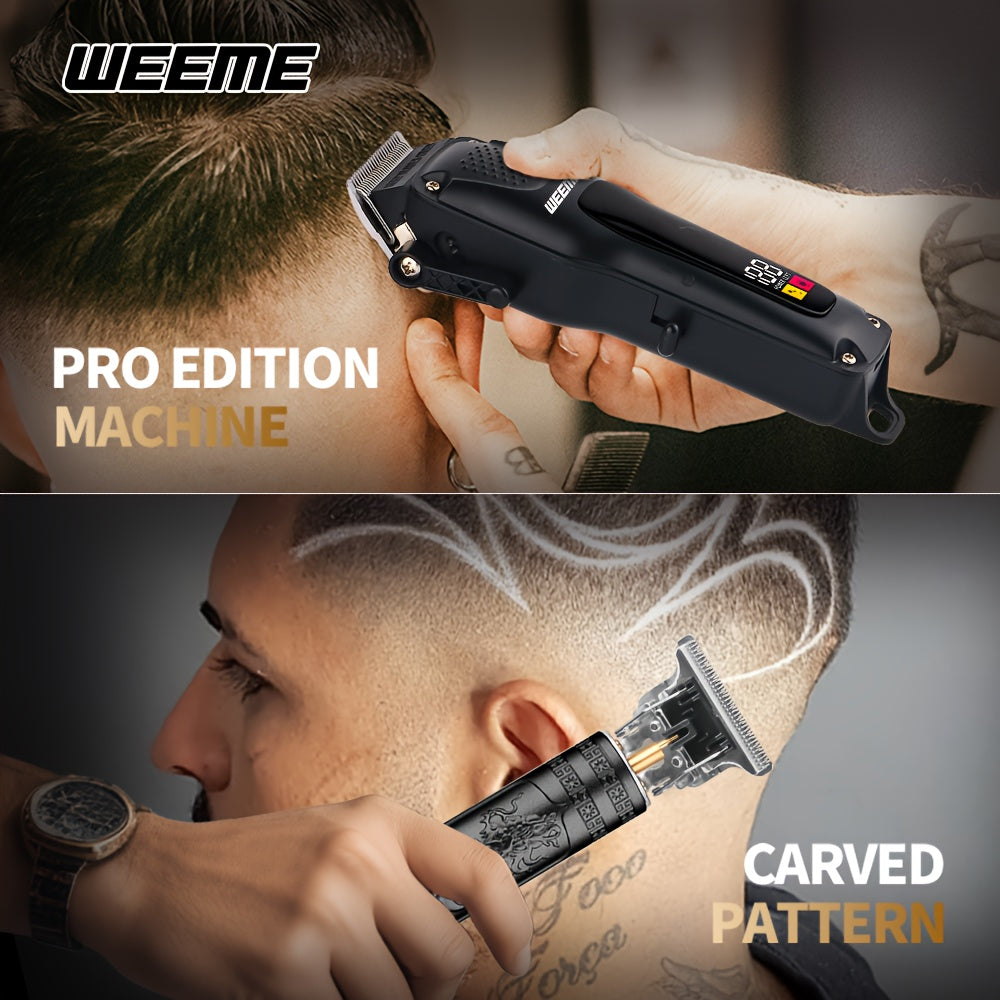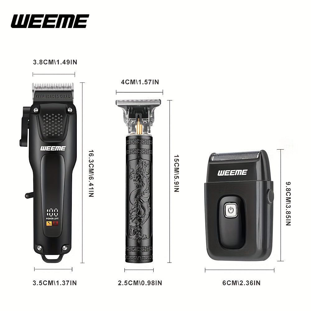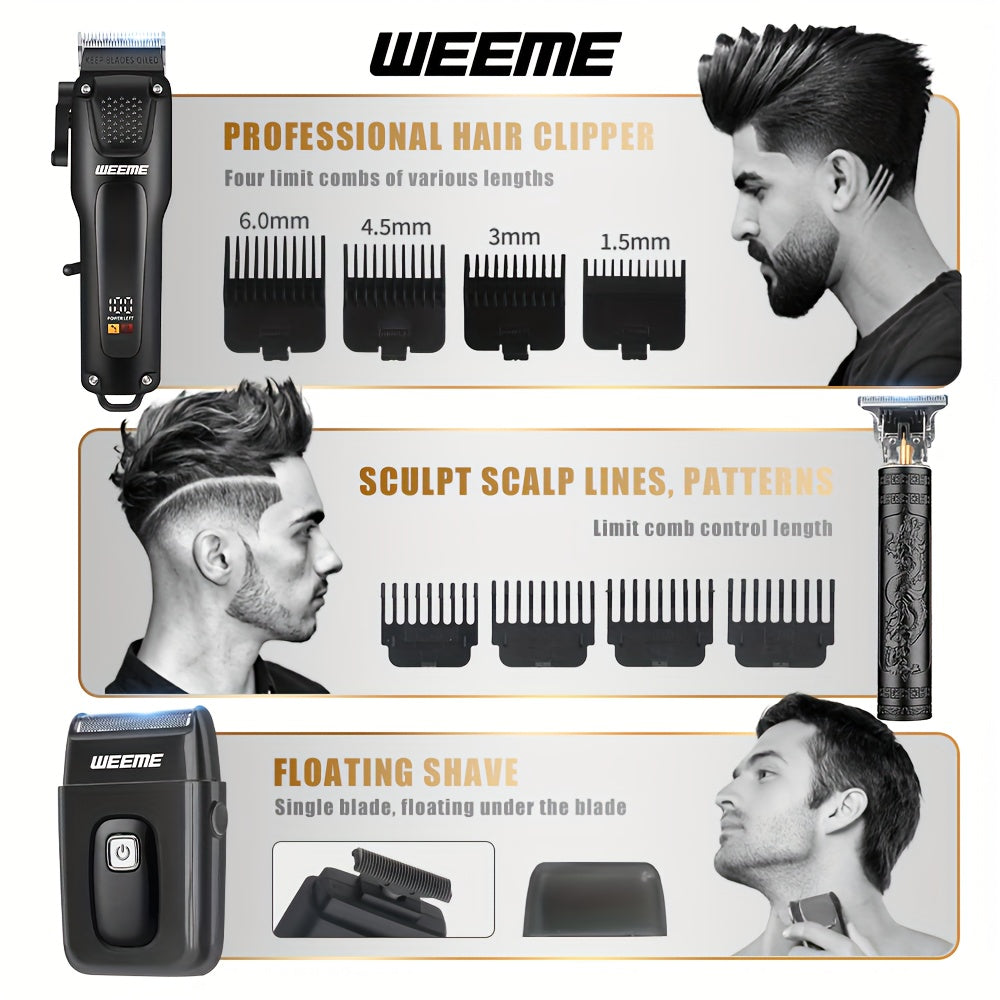 WEEME 3pcs Men's Grooming Kit: Black USB Rechargeable Electric Clipper + T-Blade Trimmer + Shaver Combo, featuring an LCD display and anti-slip textured design for precise haircuts, beard trimming, and sideburns styling—per