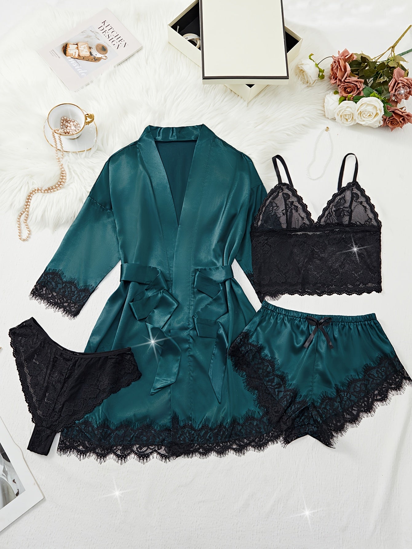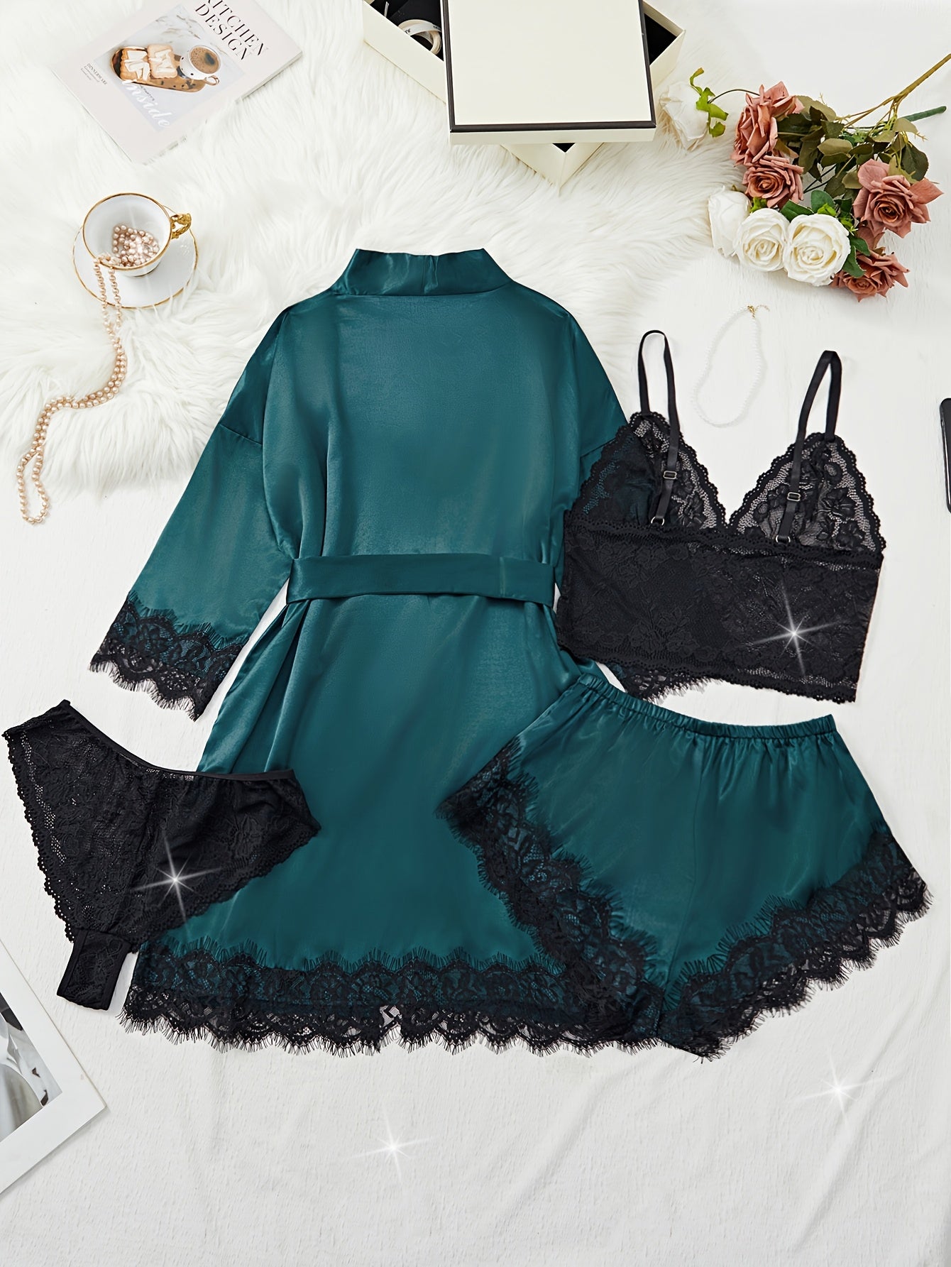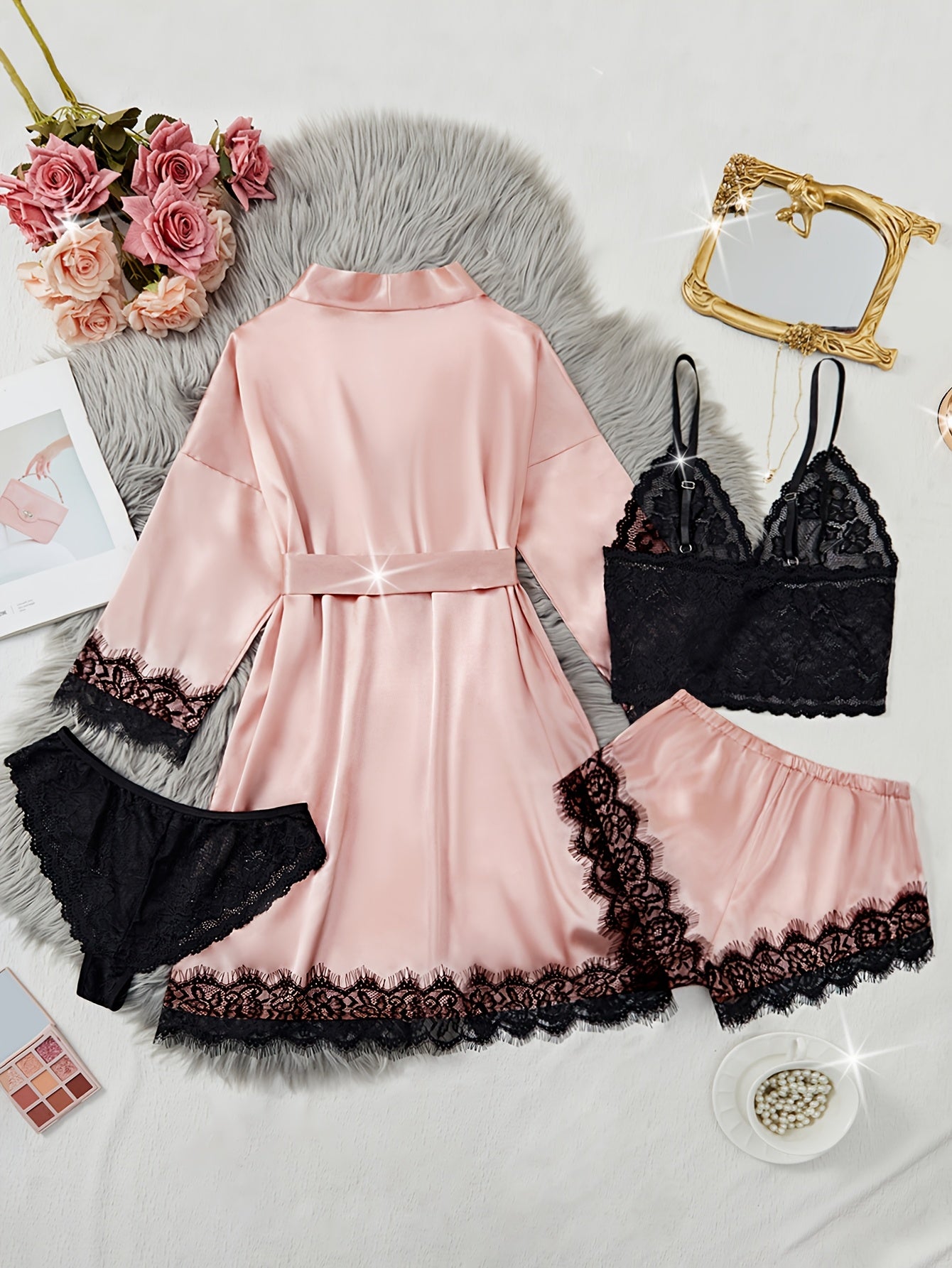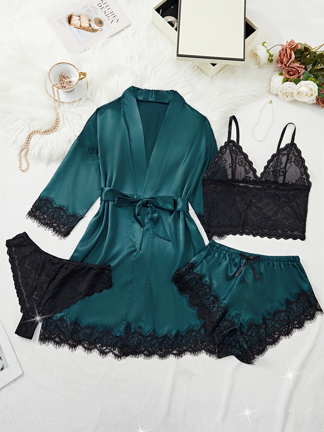 Կանացի 5 հատ ատլասե գիշերազգեստի հավաքածու, էլեգանտ միաձույլ գիշերազգեստ գոտիով, ծաղկավոր ժանյակավոր վերնաշապիկ և թոնգ, միջին չափի սևեռ, պոլիեսթեր 95%, էլաստան 5%, միջին բարձրության, հյուսված ներքնազգեստի հավաքածու