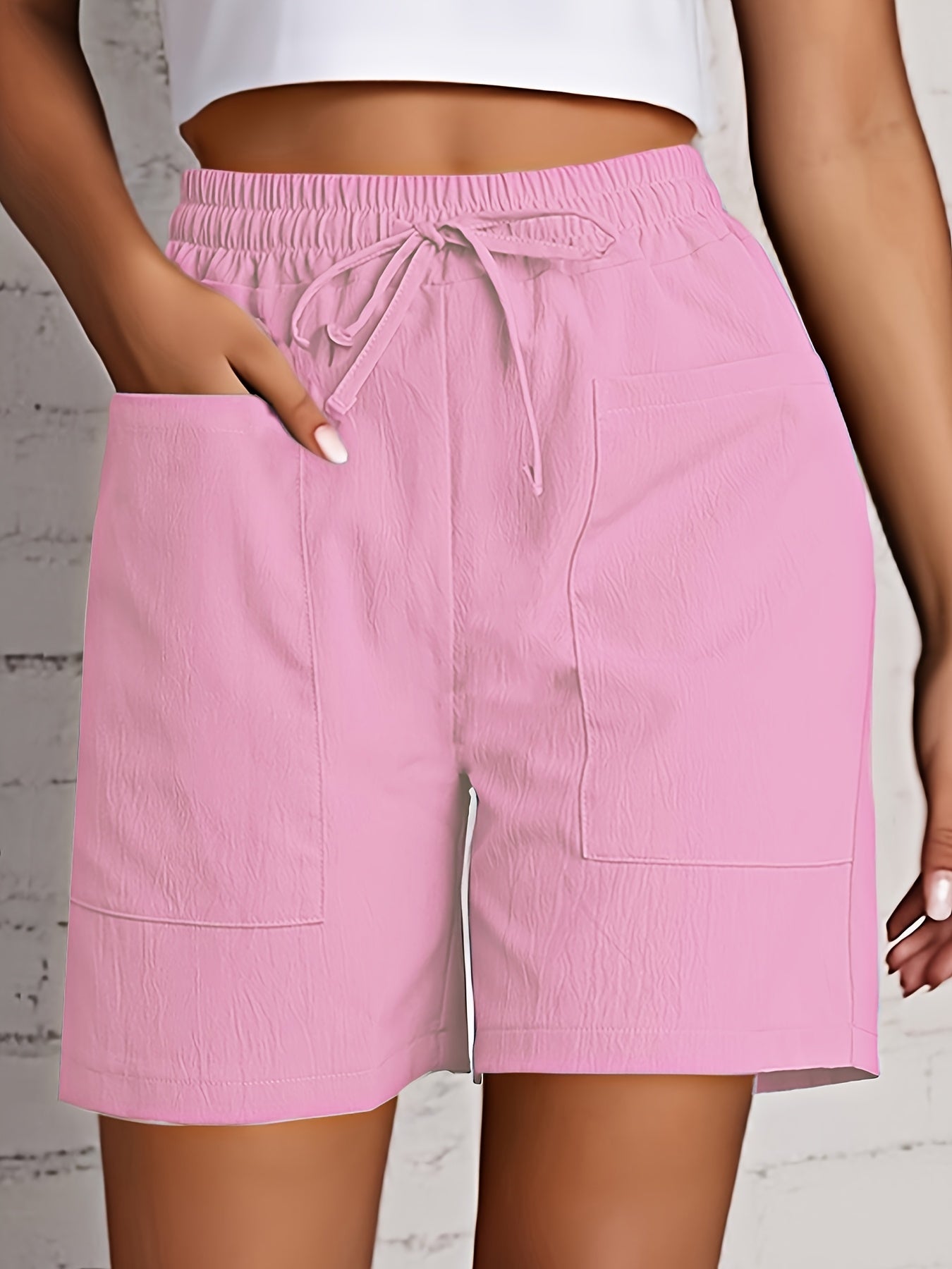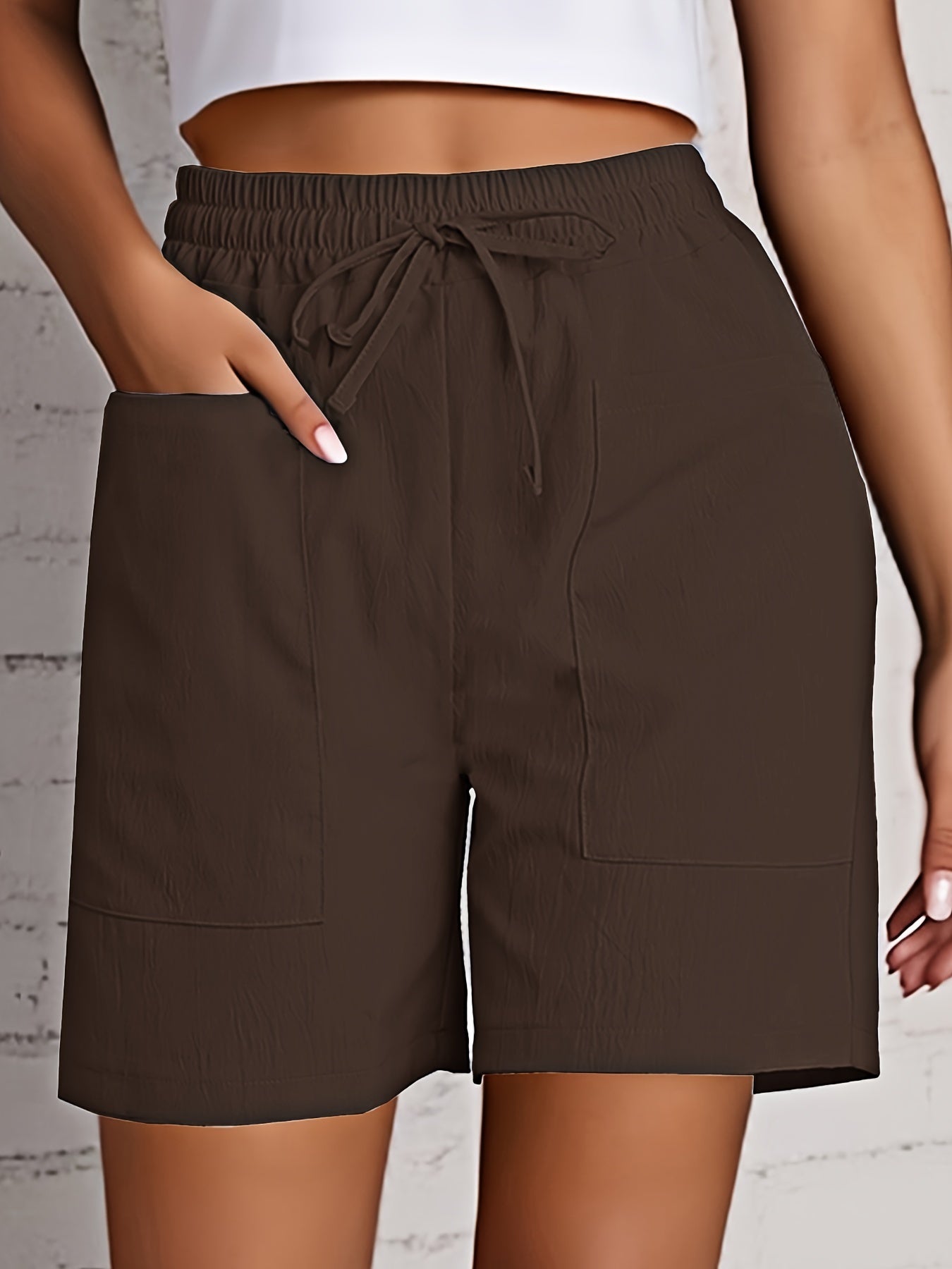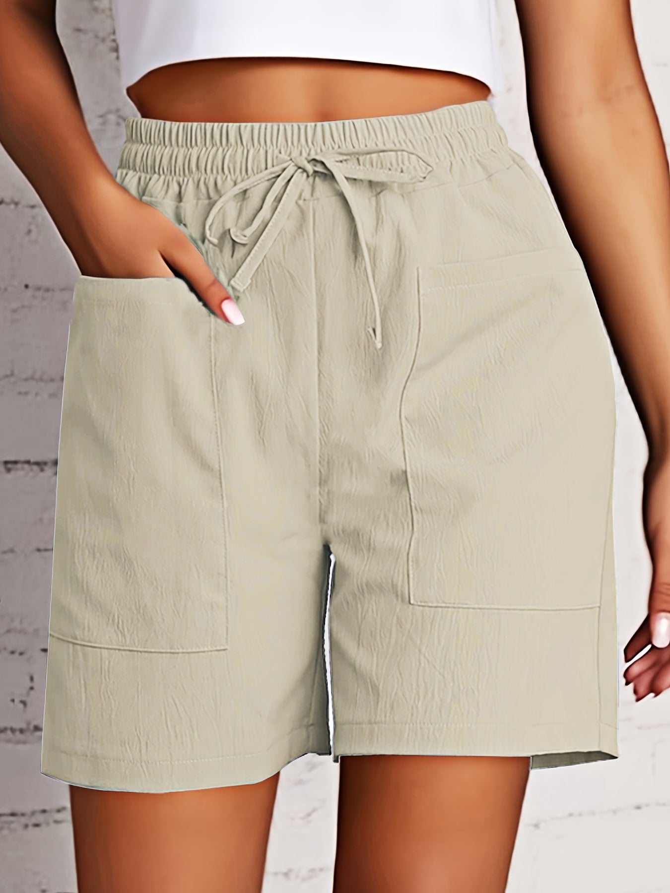 Կանացի բեժ բեռների շորտեր՝ սովորական և նորաոճ, միաձույլ գույնի գոտկատեղով և գրպաններով, պոլիեսթեր խառնուրդ, լվացվող մեքենայում, հարմարավետություն ամբողջ սեզոնին