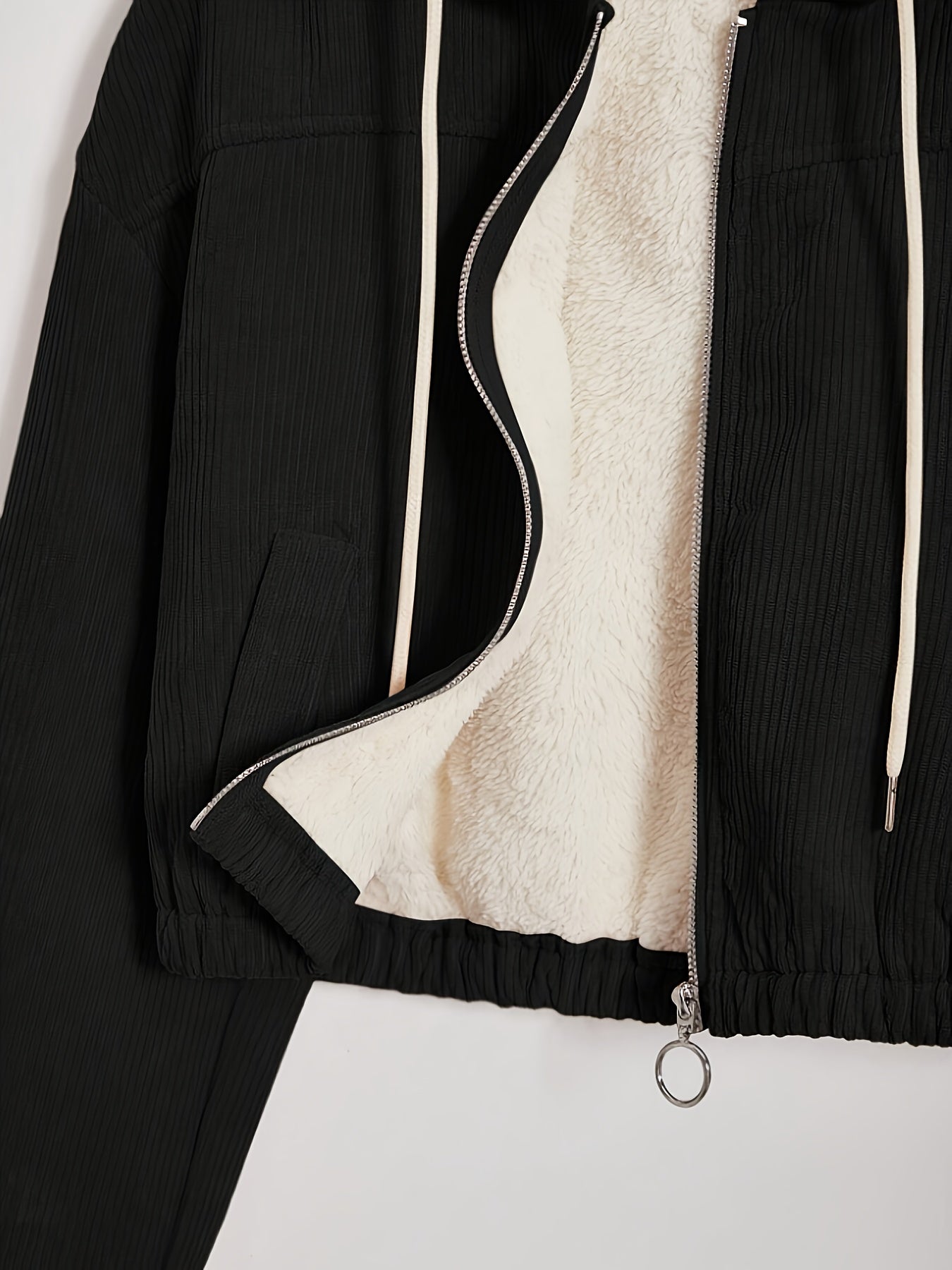 Կանացի սև գլխարկով բաճկոն՝ բրդյա աստառով - Ձմեռային վերարկու՝ ամբողջական կայծակաճարմանդով, առջևի ամբողջական կայծակաճարմանդով փակվող, կայծակաճարմանդով գրպաններ, լվացքի մեքենայով լվացվող արտաքին պատյան
