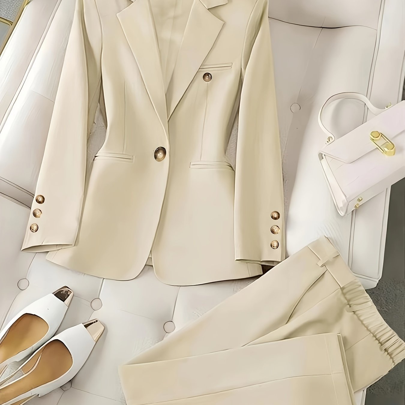 Կանացի ամենօրյա բեժ բլազերի և տաբատի հավաքածու - պոլիեսթեր, երկարաթև, կրկնակի կրծքով, օձիքով, գրպաններով, լվացվում է մեքենայում