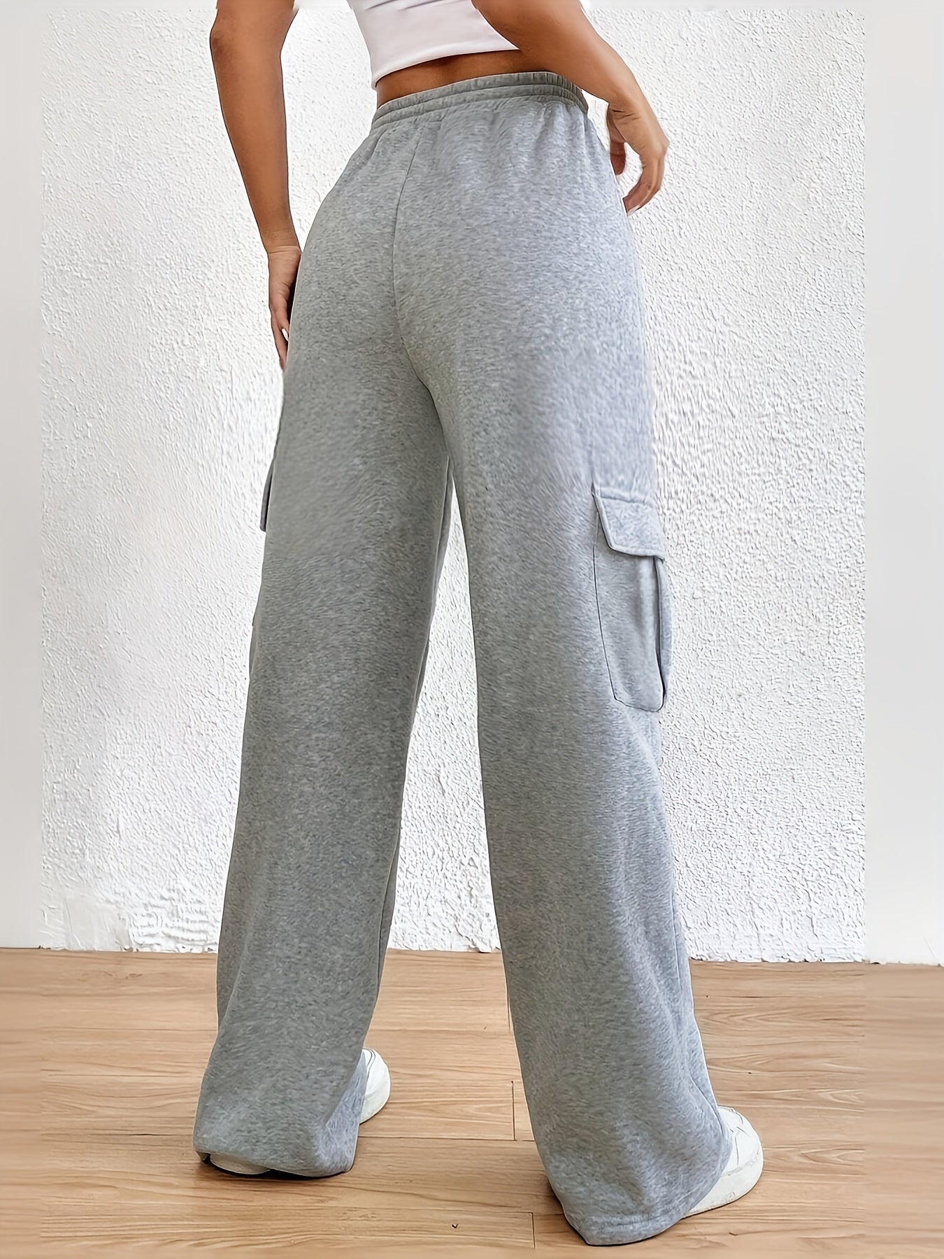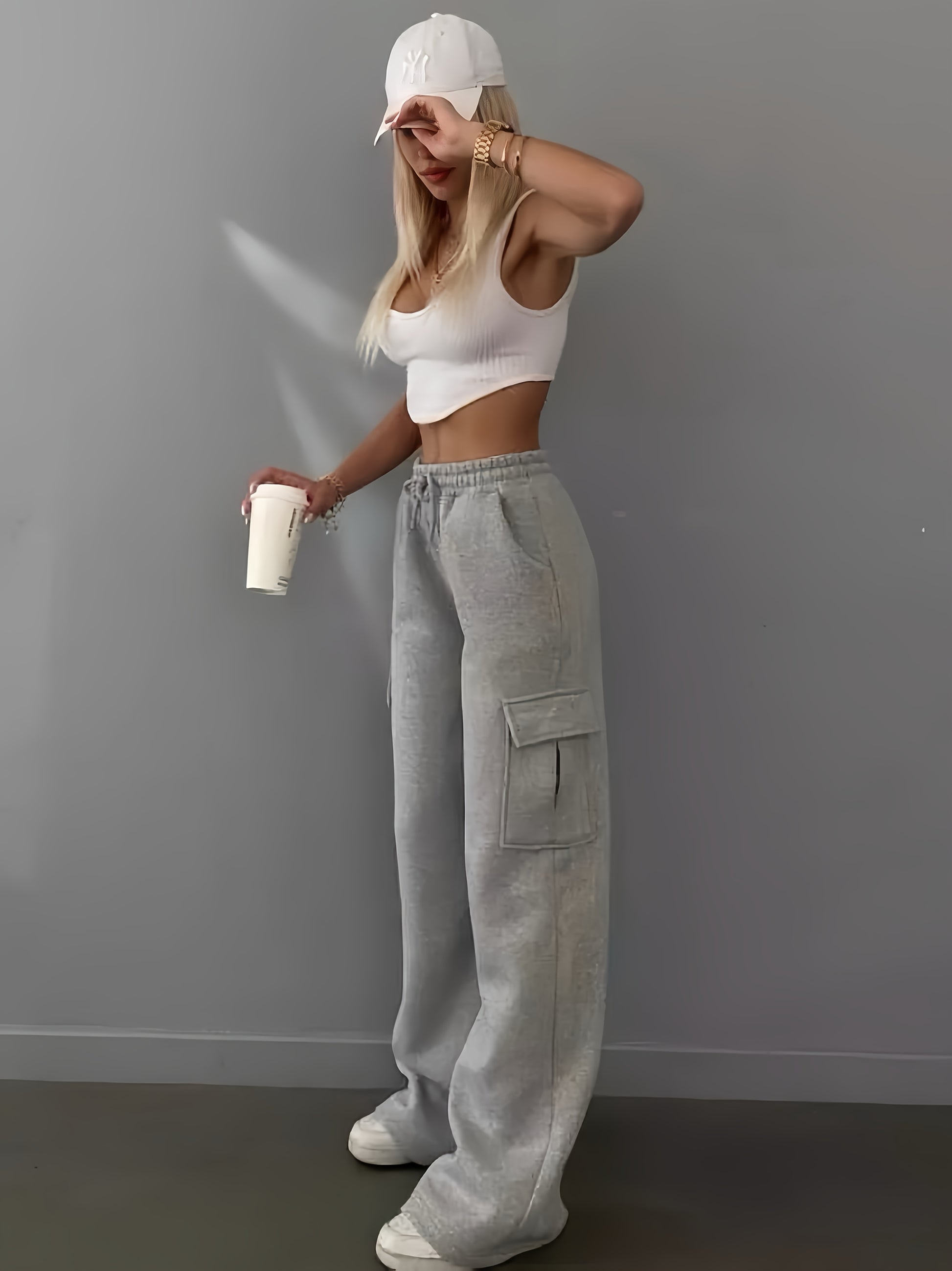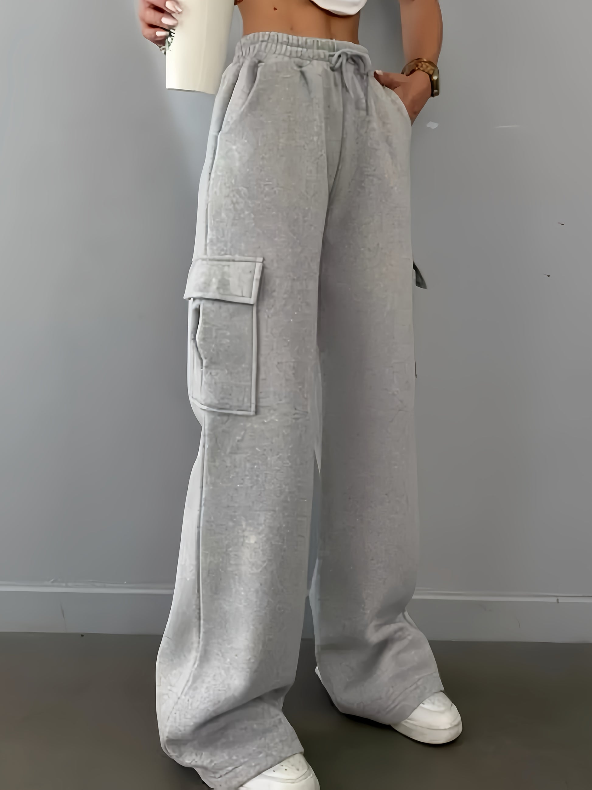 Կանացի առօրյա վազքի տաբատ՝ առաձգական գոտկատեղով և կողային կայծակաճարմանդով գրպաններով - Մոխրագույն լայն ոտքով տաբատ, ծալովի թևքերով, լվացվող մեքենայով՝ գարնան/աշնան համար, հարմարավետ տաբատ | Լայն ոտքով վազքի տաբատ | Փափուկ կտորից տաբատ