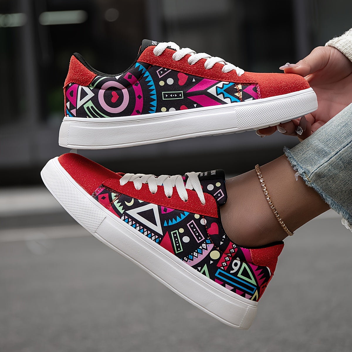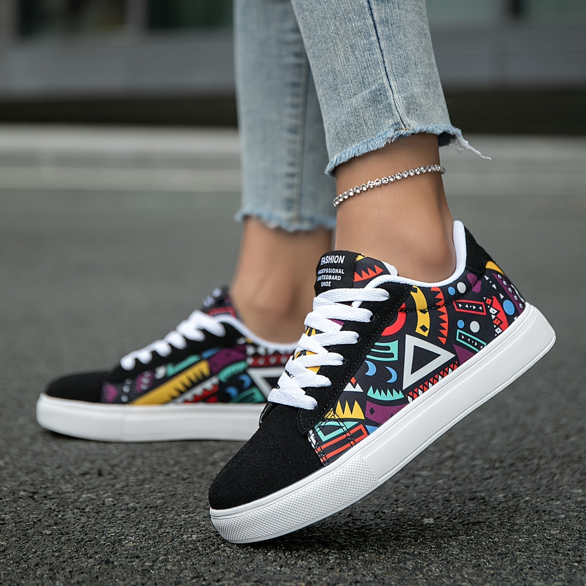 Կանացի ամենօրյա սքեյթբորդ կոշիկներ՝ երկրաչափական նախշերով, պատահական տպագրությամբ, բազմակողմանի, թեթև, հակասահքային, բացօթյա սպորտաձևերի համար, ամենօրյա զբոսանքի համար