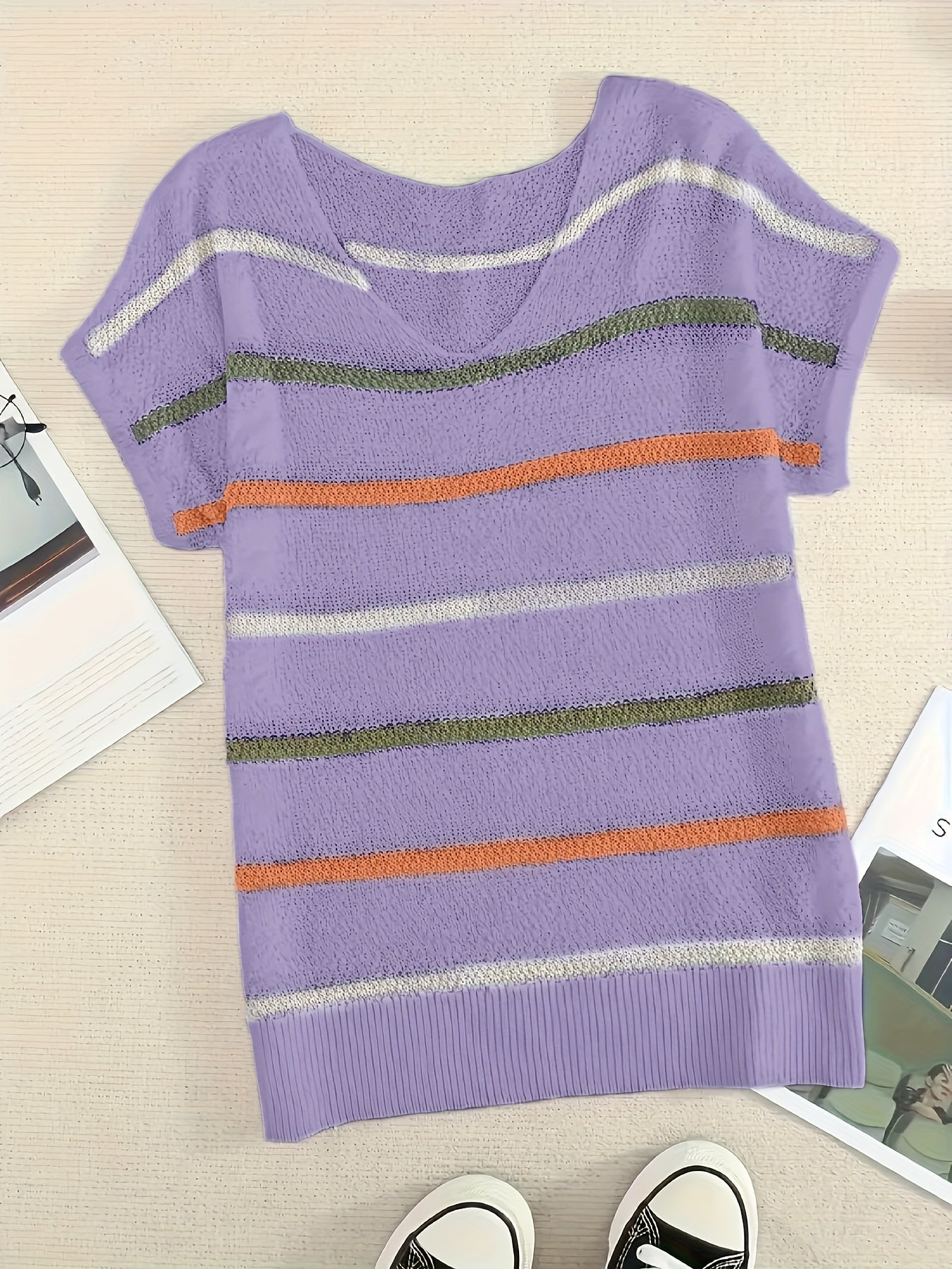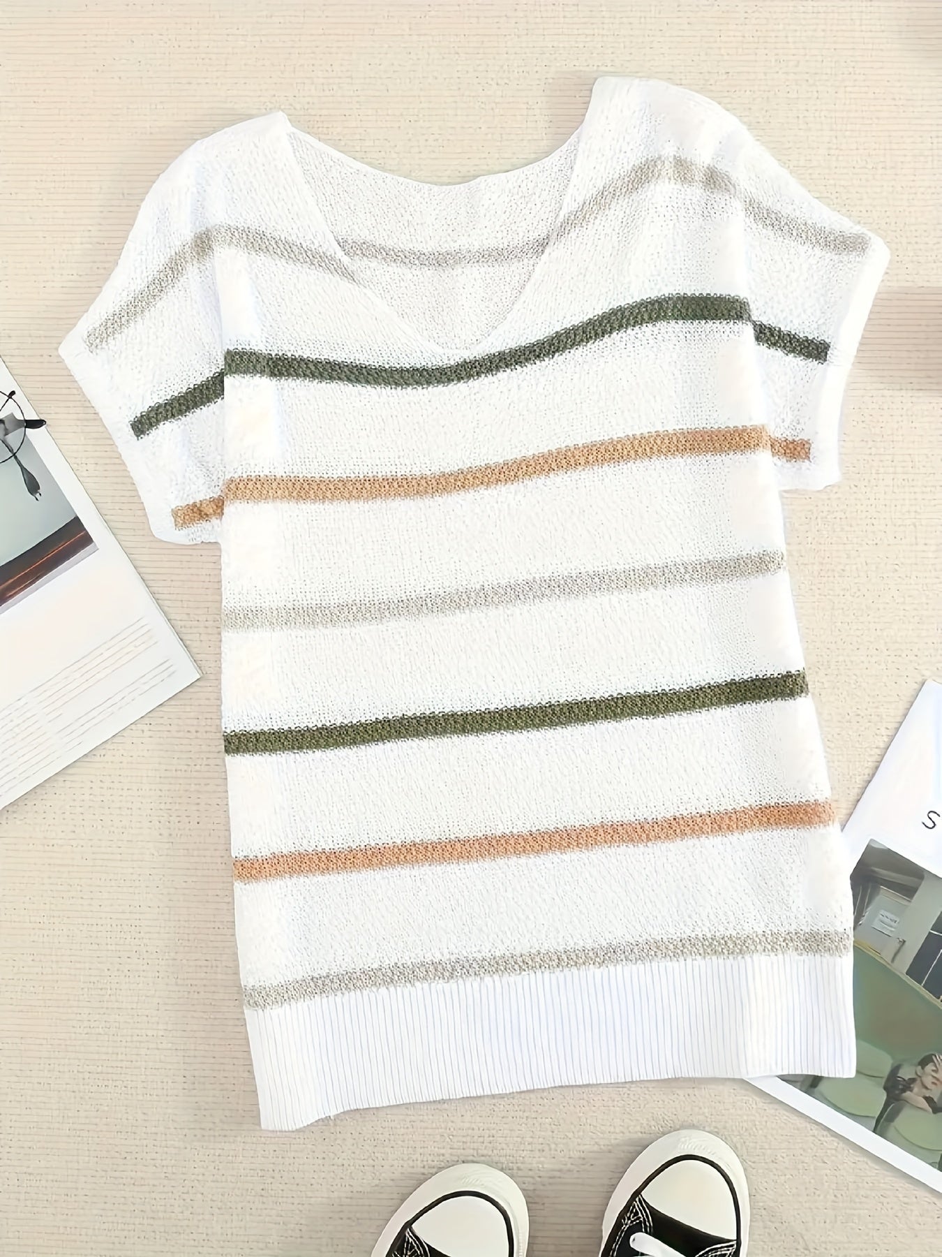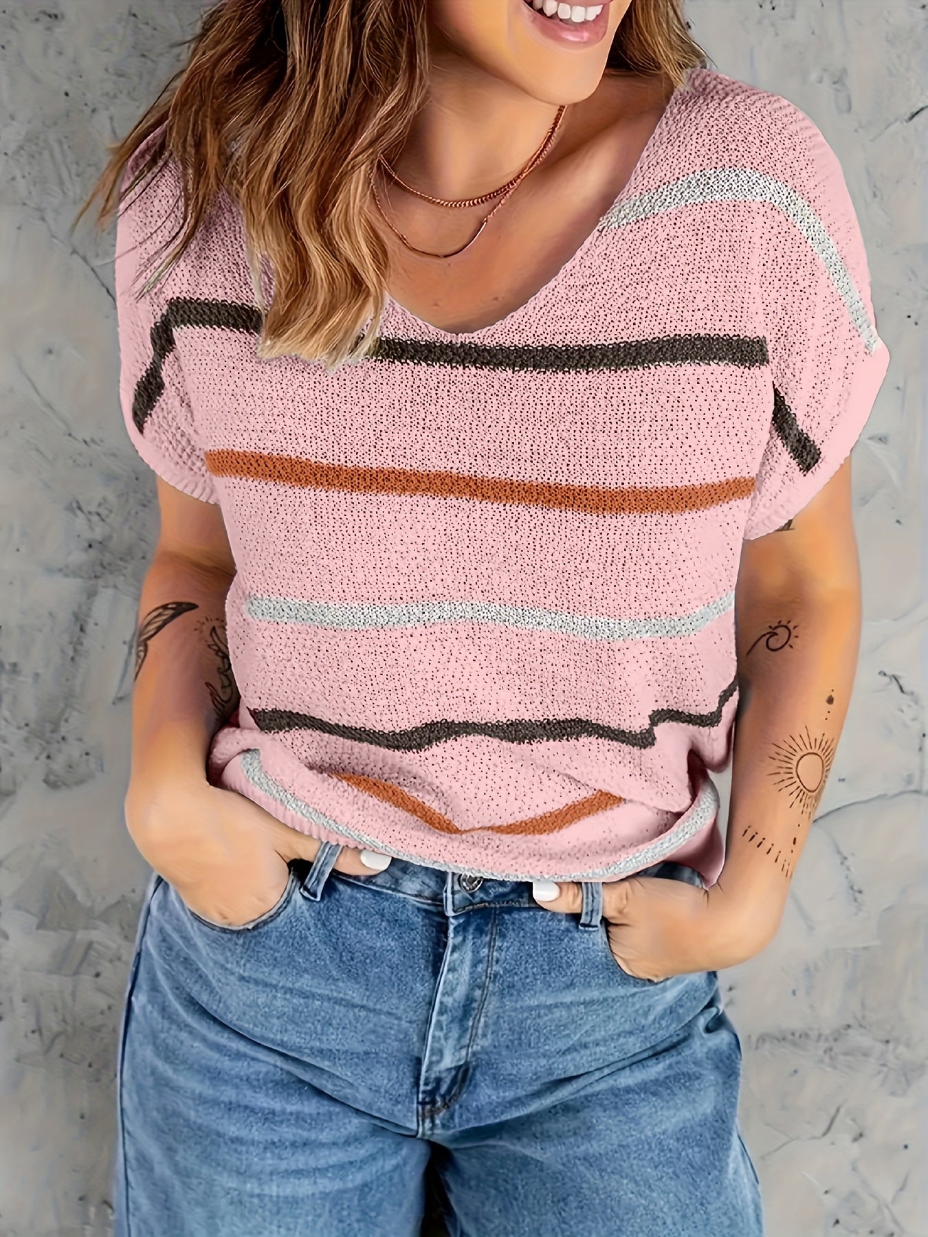Կանացի գարուն/ամառային գծավոր մարզաշապիկ՝ կարճ թևքերով սվիտեր՝ V-ձև օձիքով, կողային շերտերով և «LOVE» գրաֆիկական նախշերով, թեթև տրիկոտաժե վերնաշապիկ՝ ամենօրյա հագուստի համար, գրաֆիկական շապիկ | տրիկոտաժե հյուսվածք