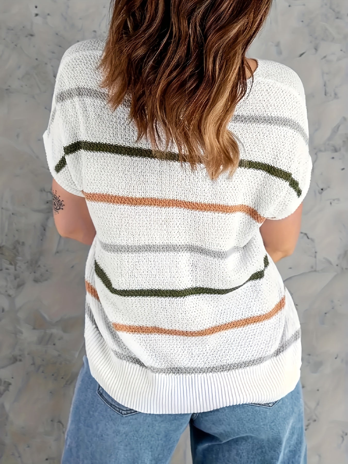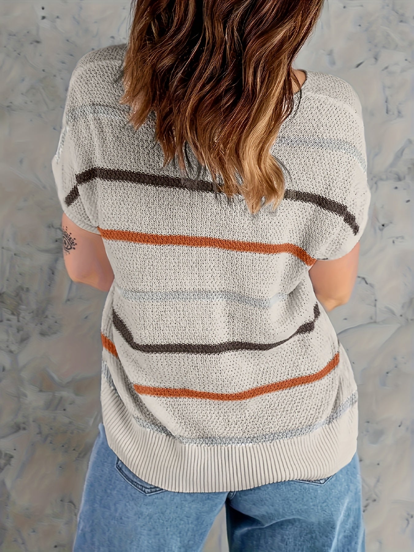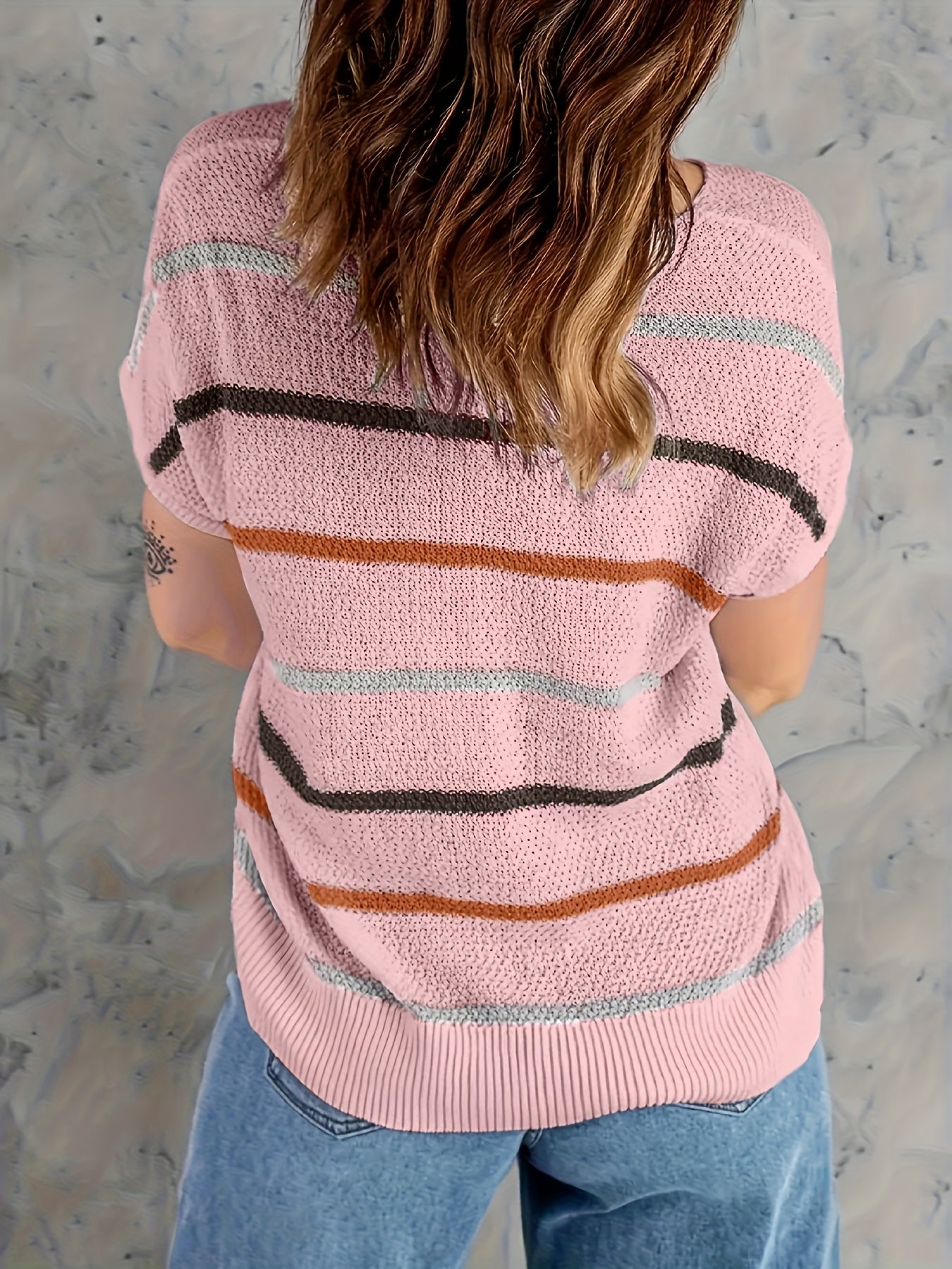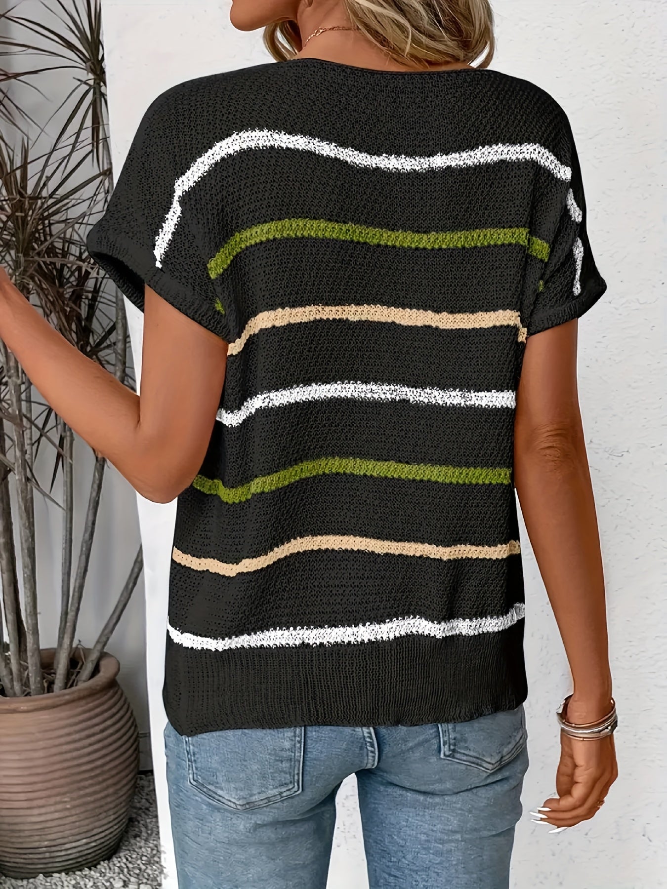 Կանացի գարուն/ամառային գծավոր մարզաշապիկ՝ կարճ թևքերով սվիտեր՝ V-ձև օձիքով, կողային շերտերով և «LOVE» գրաֆիկական նախշերով, թեթև տրիկոտաժե վերնաշապիկ՝ ամենօրյա հագուստի համար, գրաֆիկական շապիկ | տրիկոտաժե հյուսվածք