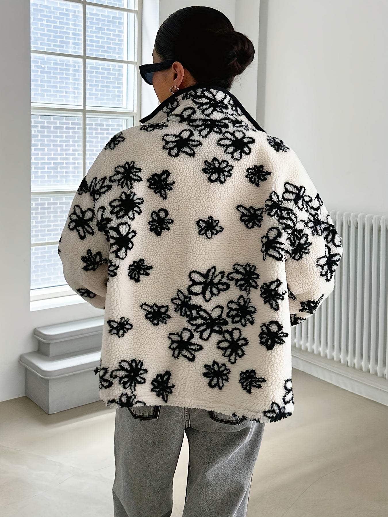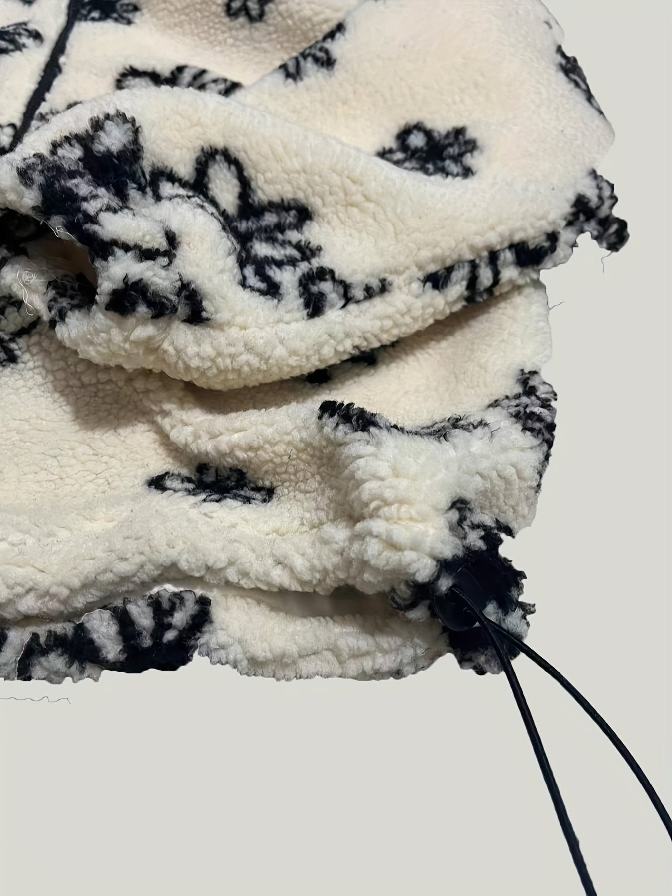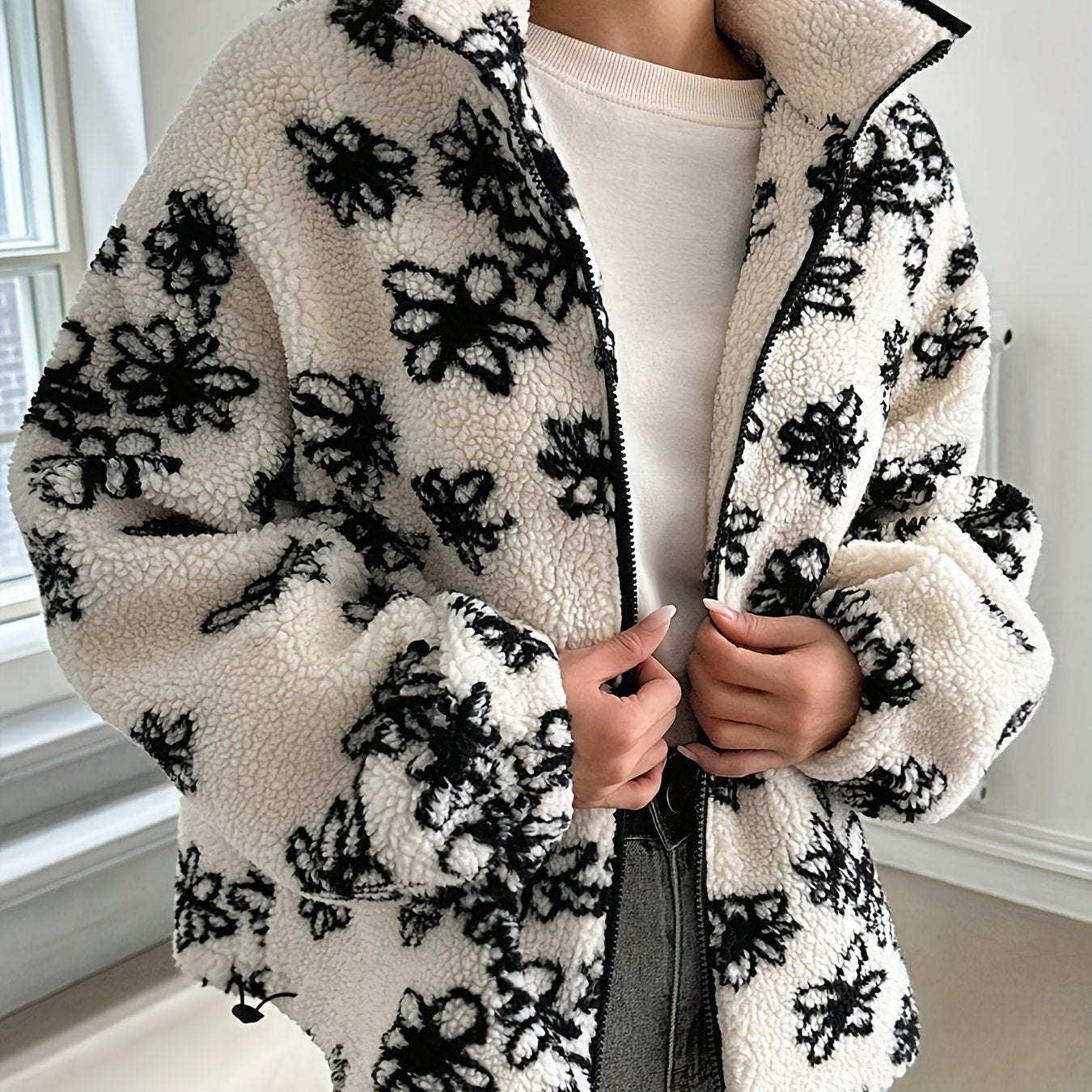 Կանացի հարմարավետ բրդյա երիզով ծաղկային նախշերով բաճկոն - առօրյա երկար թևքով կայծակաճարմանդով սև և սպիտակ ծաղկային նախշերով, փափուկ տաք վերնազգեստ աշուն/ձմեռ, հարմարավետ աշնանային հագուստ | Ծաղկային նախշերով բաճկոն | Կայծակաճարմանդով բաճկոն