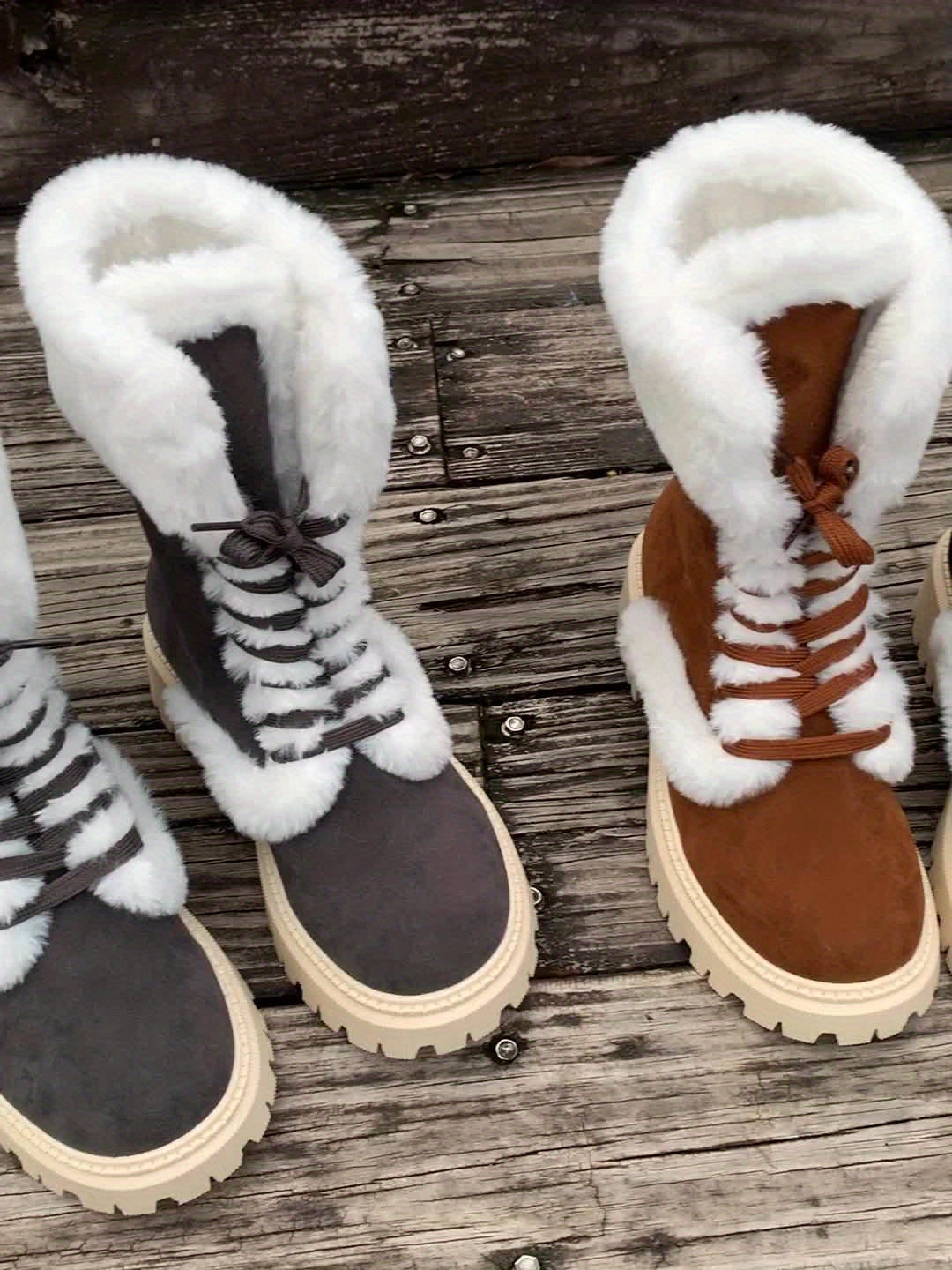 Կանացի հարմարավետ, բրդյա երեսպատված ձմեռային կոշիկներ - Կիսաճաճանճ, կապերով, հաստ արհեստական մորթով, կլոր քթով և հաստ կրունկով, շագանակագույն կամ սև, իդեալական ցուրտ եղանակի համար, ձմեռային կոշիկներ