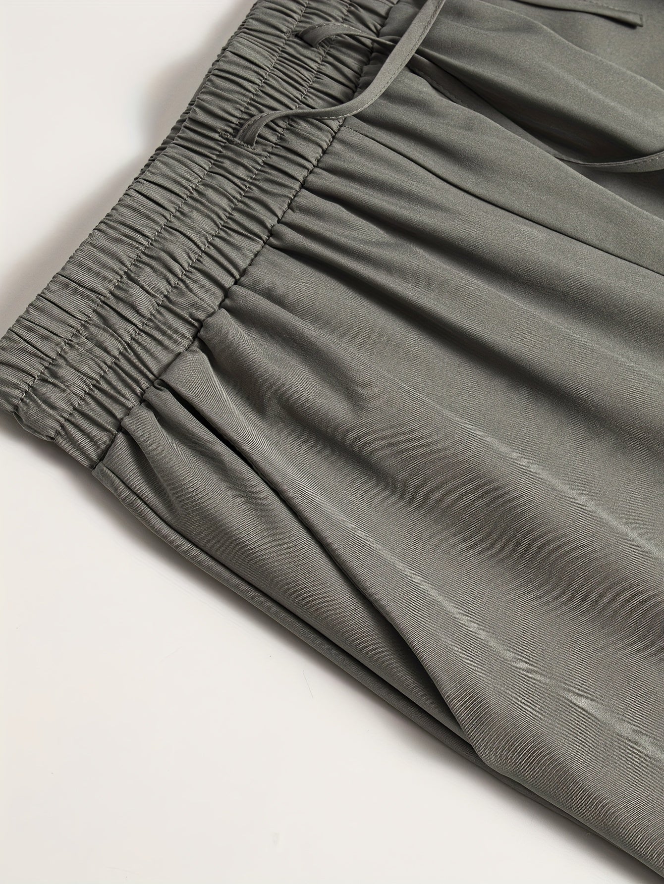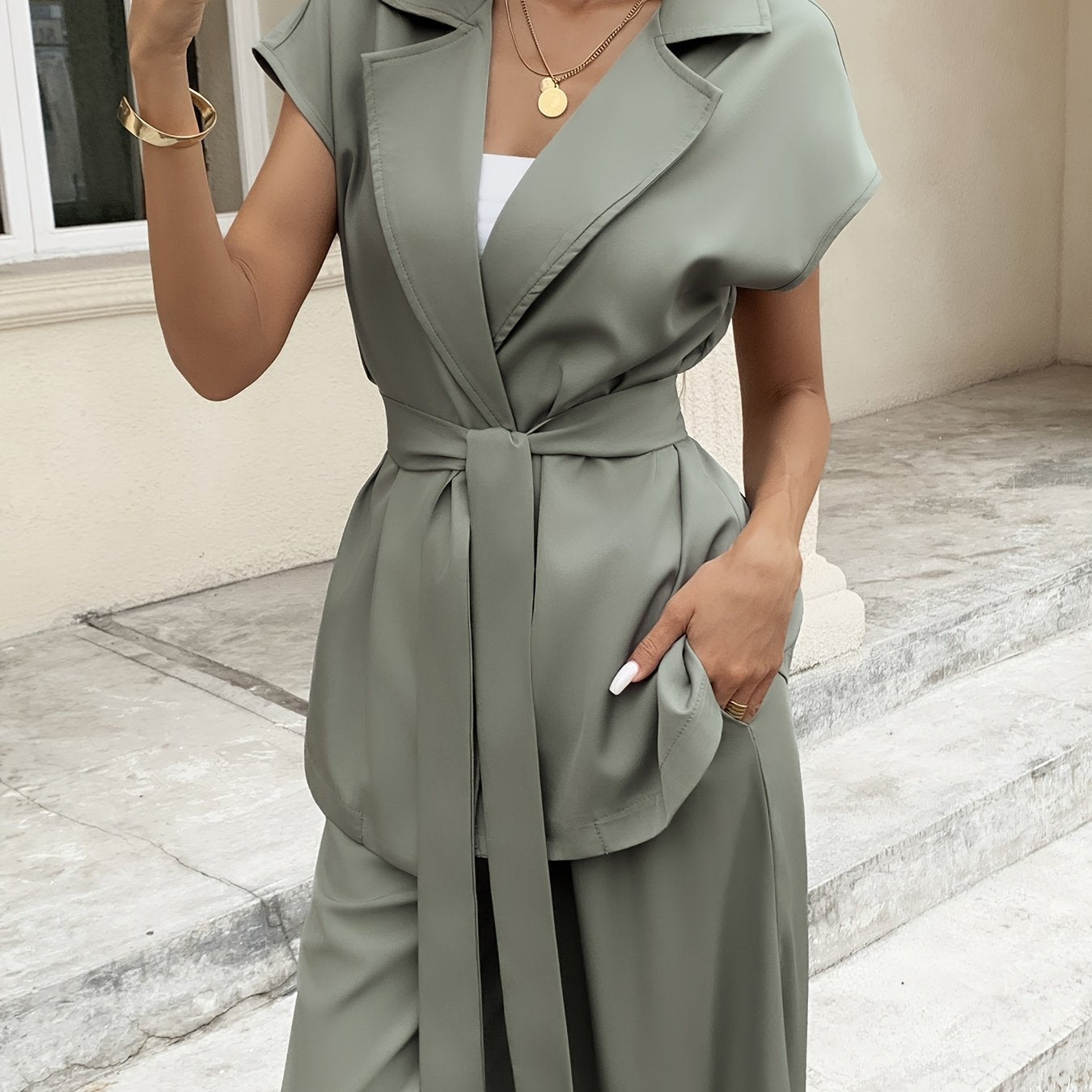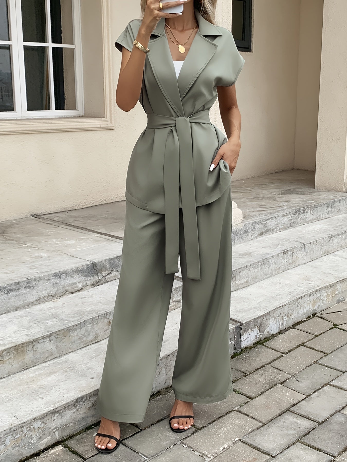 Կանացի էլեգանտ, ուսերը իջեցնող ժիլետ + առաձգական գոտկատեղով, ծալքավոր տաբատ, երկկտոր հավաքածու՝ գոտիով