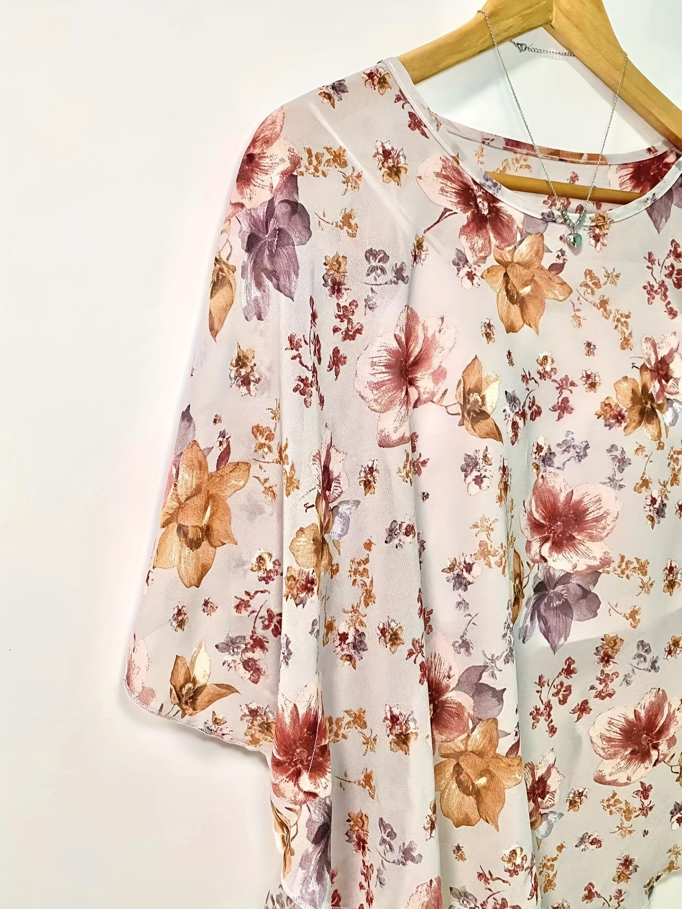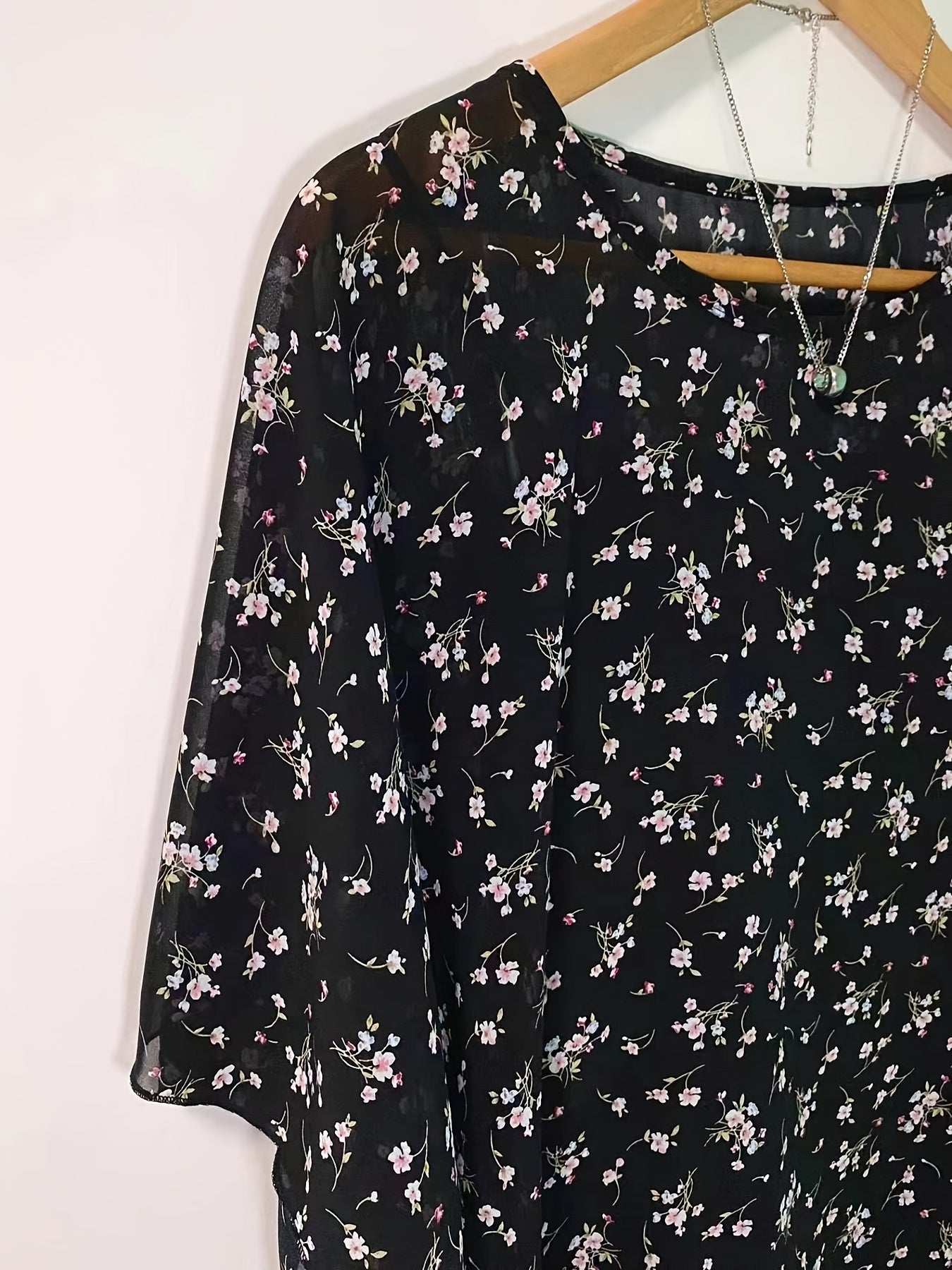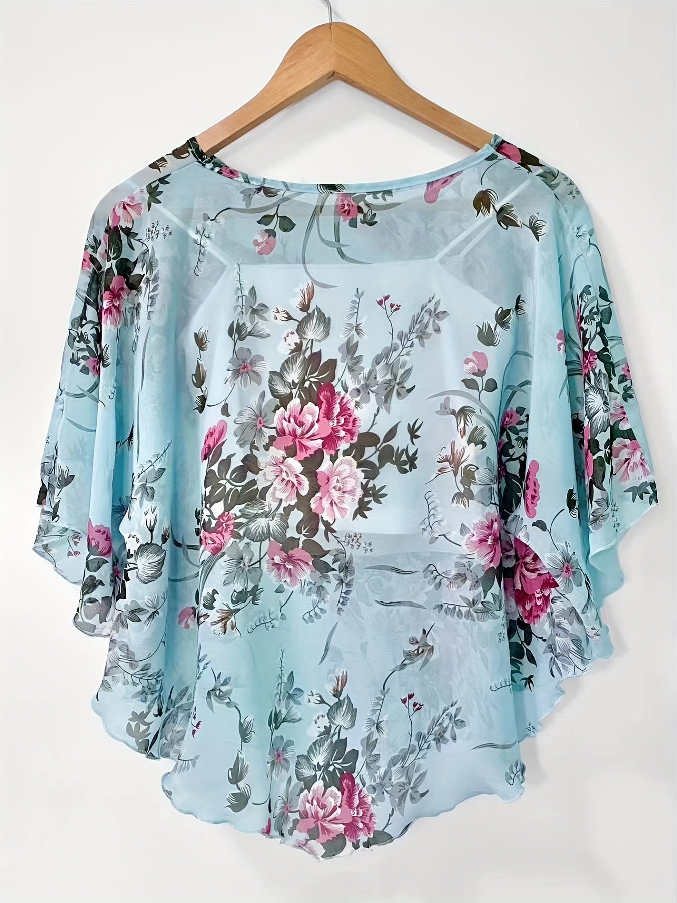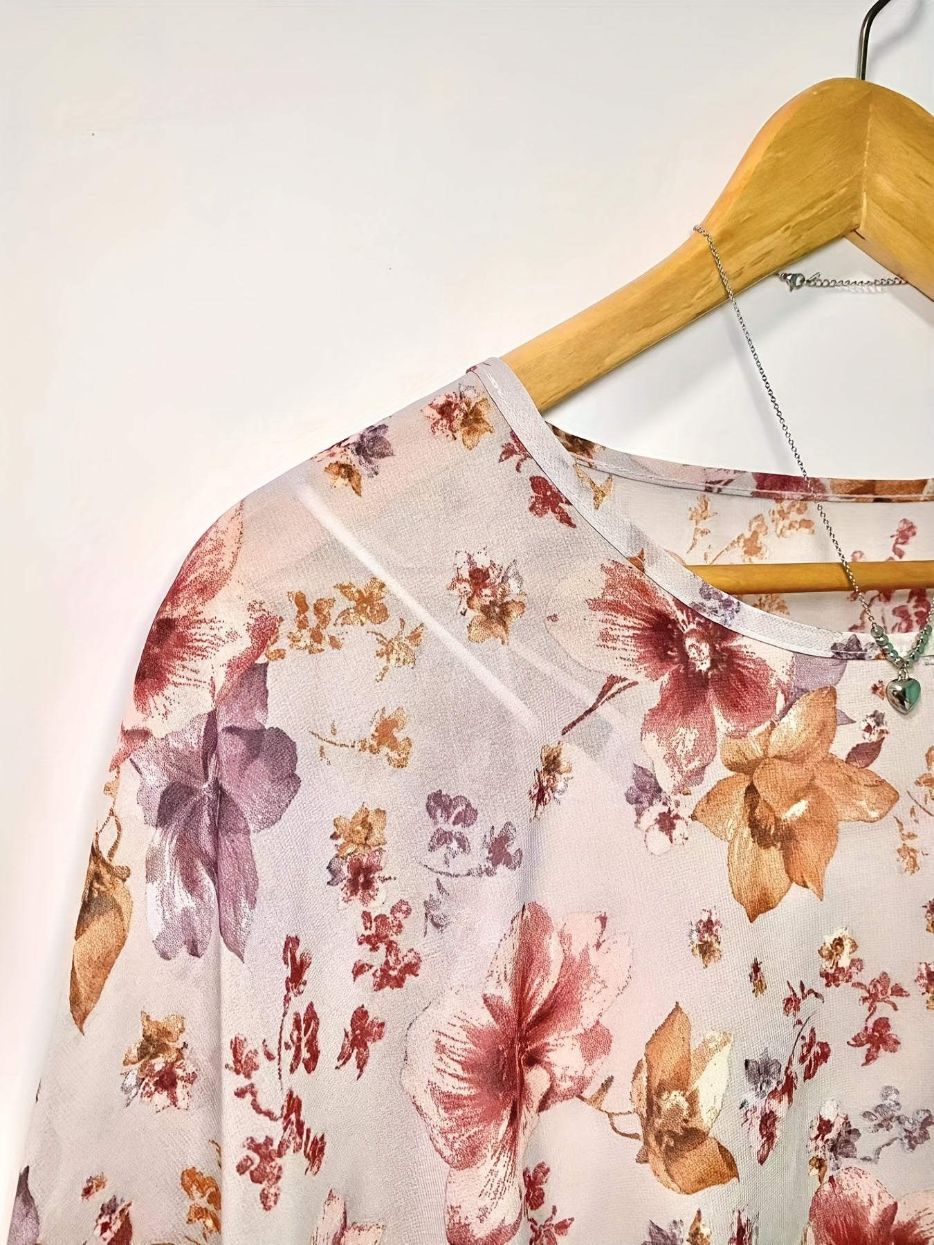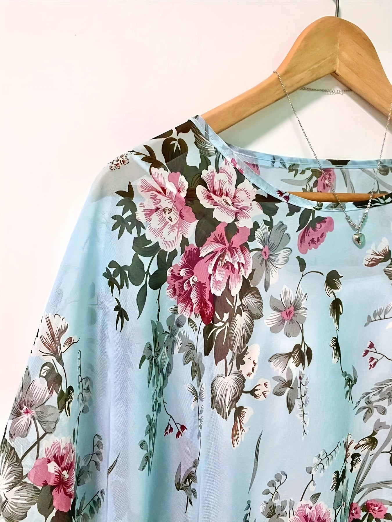 Կանացի էլեգանտ ծաղկային պրինտով ասիմետրիկ բլուզ՝ թափանցիկ թևով, կլոր վզով, ամառային արևապաշտպան վերնաշապիկ լողափի համար, գարուն/ամառ հավաքածու