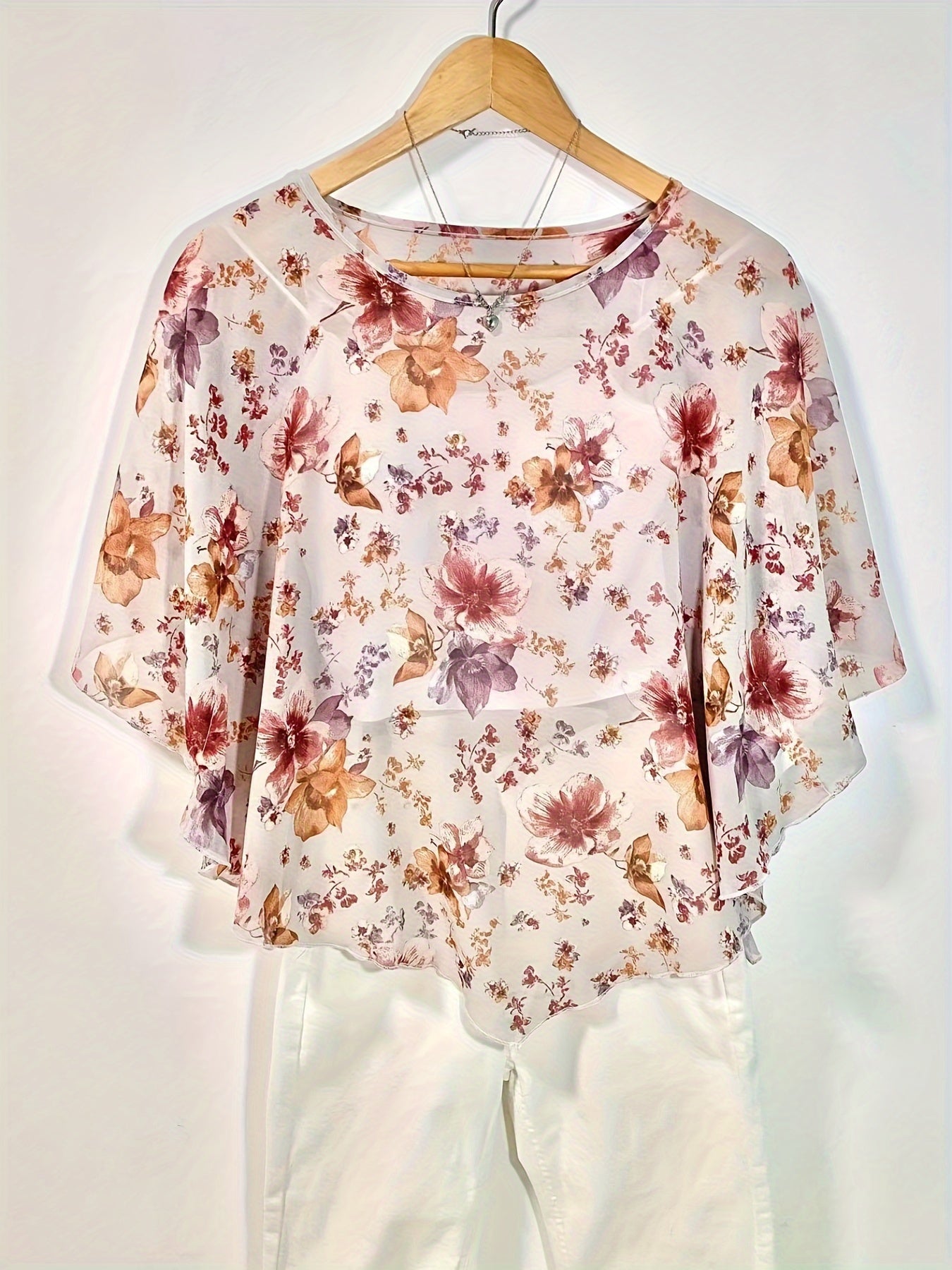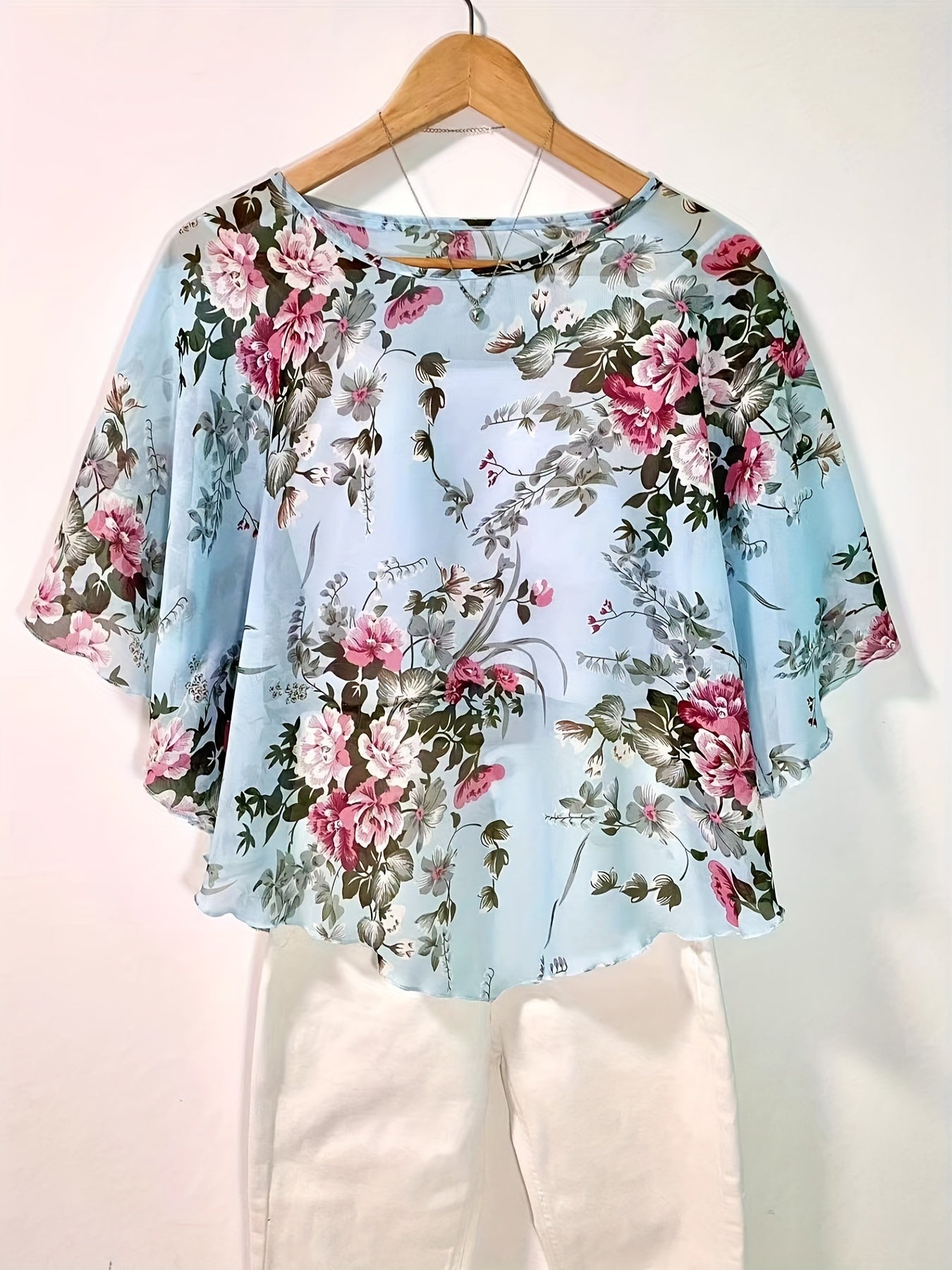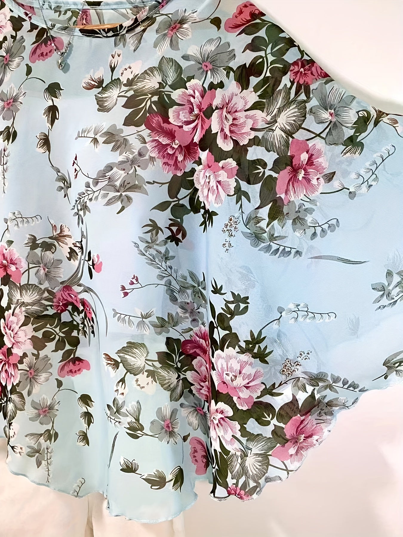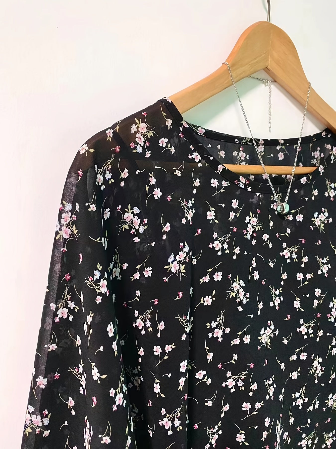 Կանացի էլեգանտ ծաղկային պրինտով ասիմետրիկ բլուզ՝ թափանցիկ թևով, կլոր վզով, ամառային արևապաշտպան վերնաշապիկ լողափի համար, գարուն/ամառ հավաքածու