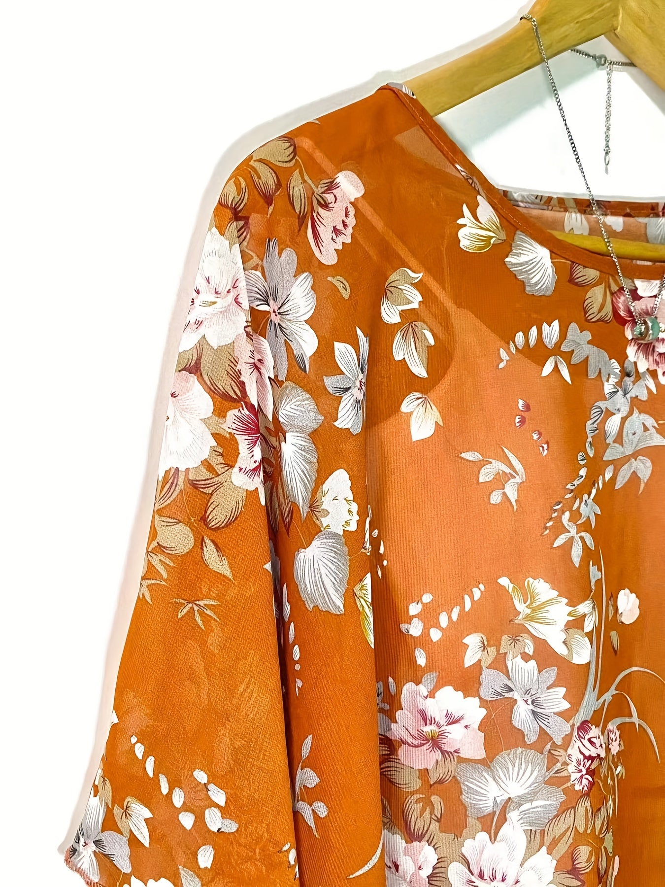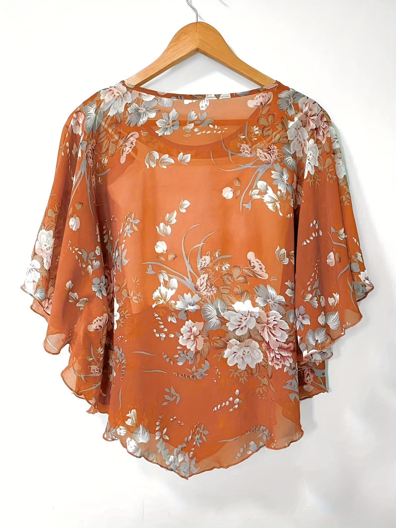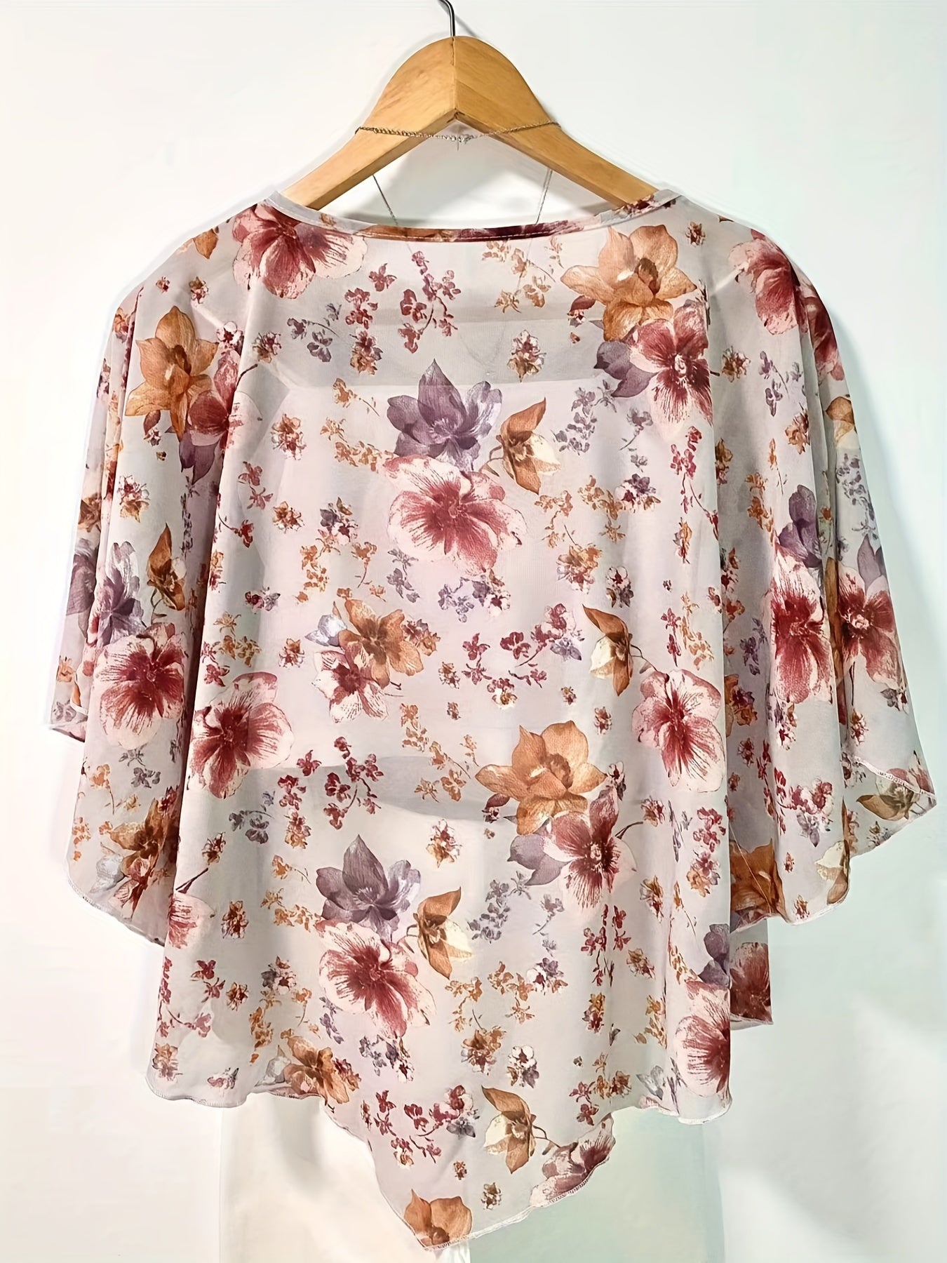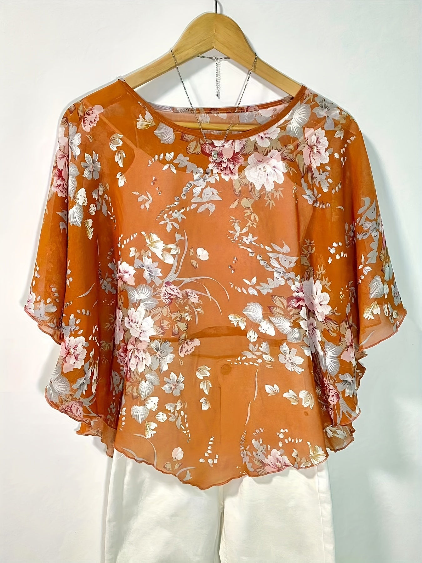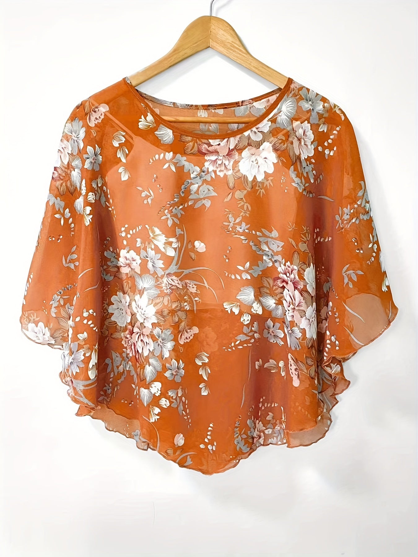 Կանացի էլեգանտ ծաղկային պրինտով ասիմետրիկ բլուզ՝ թափանցիկ թևով, կլոր վզով, ամառային արևապաշտպան վերնաշապիկ լողափի համար, գարուն/ամառ հավաքածու