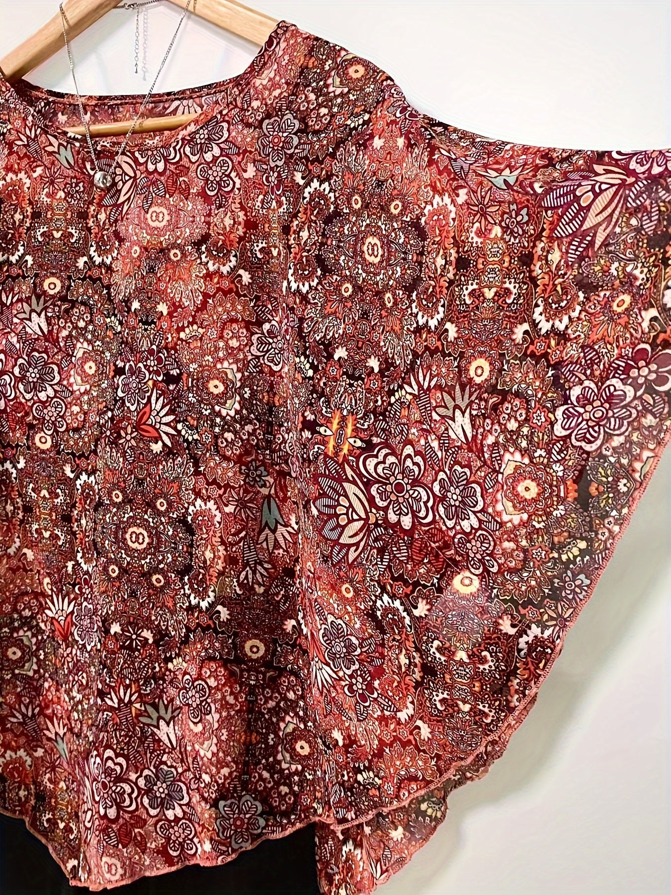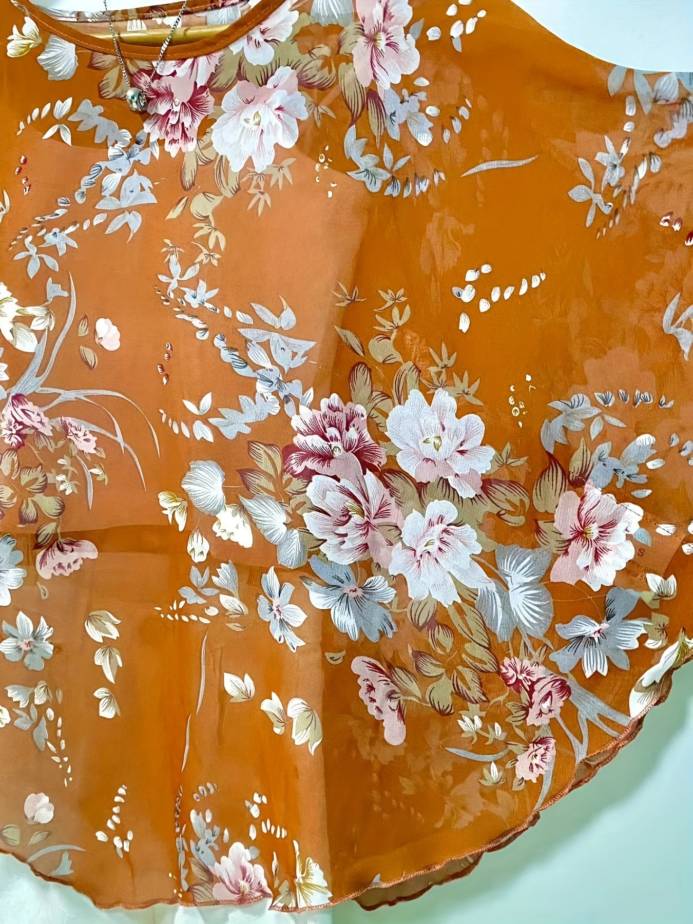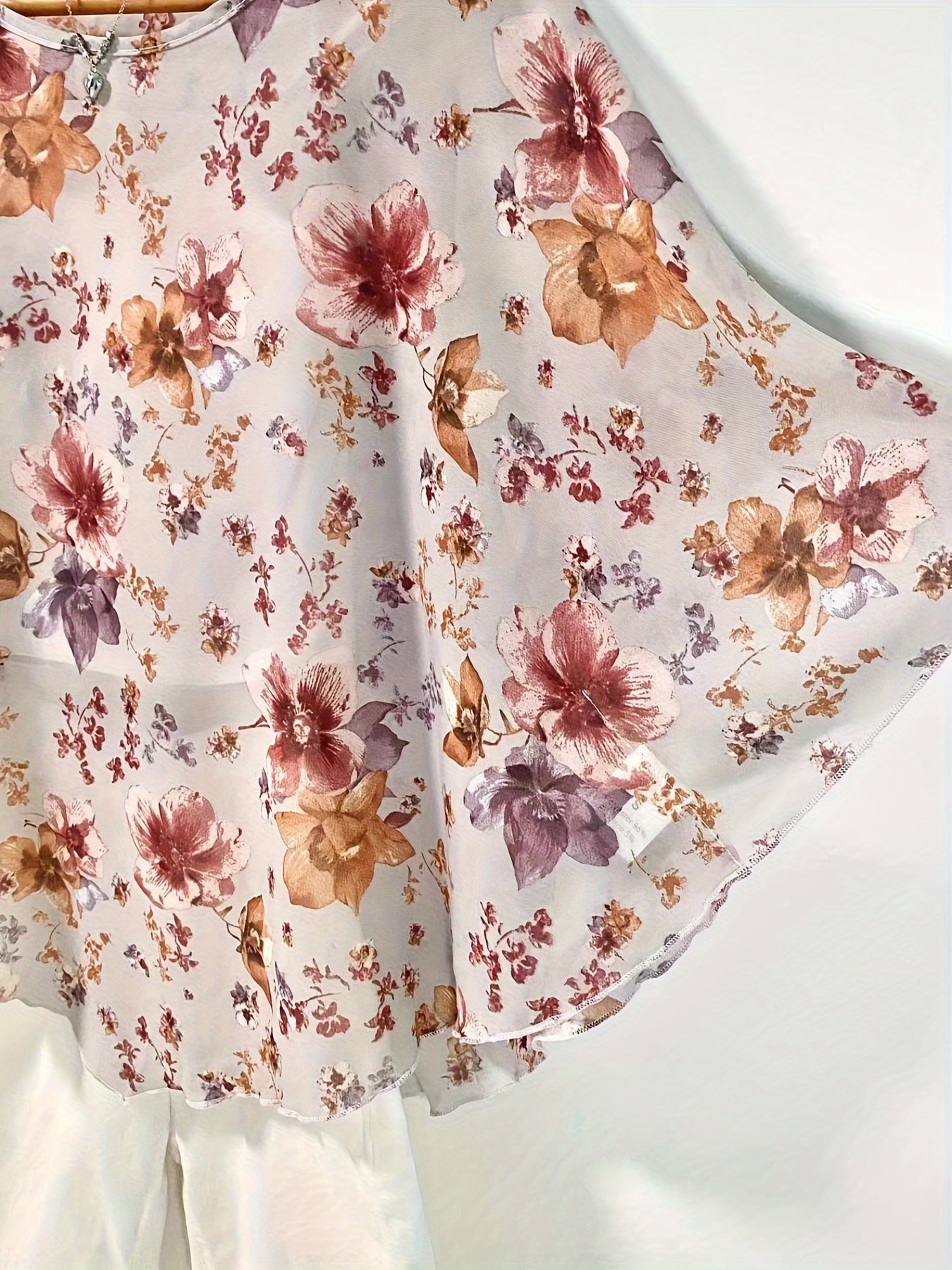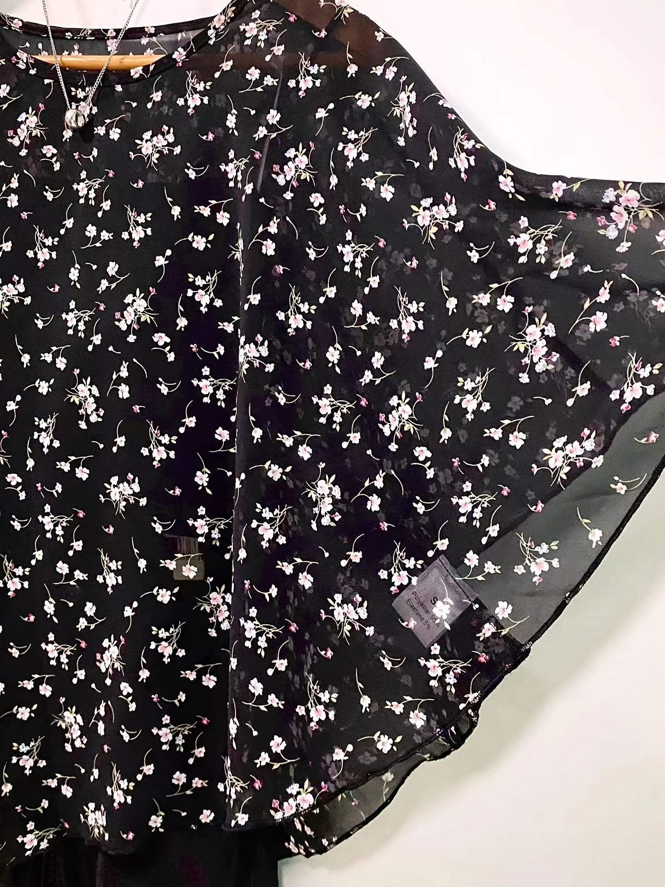 Կանացի էլեգանտ ծաղկային պրինտով ասիմետրիկ բլուզ՝ թափանցիկ թևով, կլոր վզով, ամառային արևապաշտպան վերնաշապիկ լողափի համար, գարուն/ամառ հավաքածու