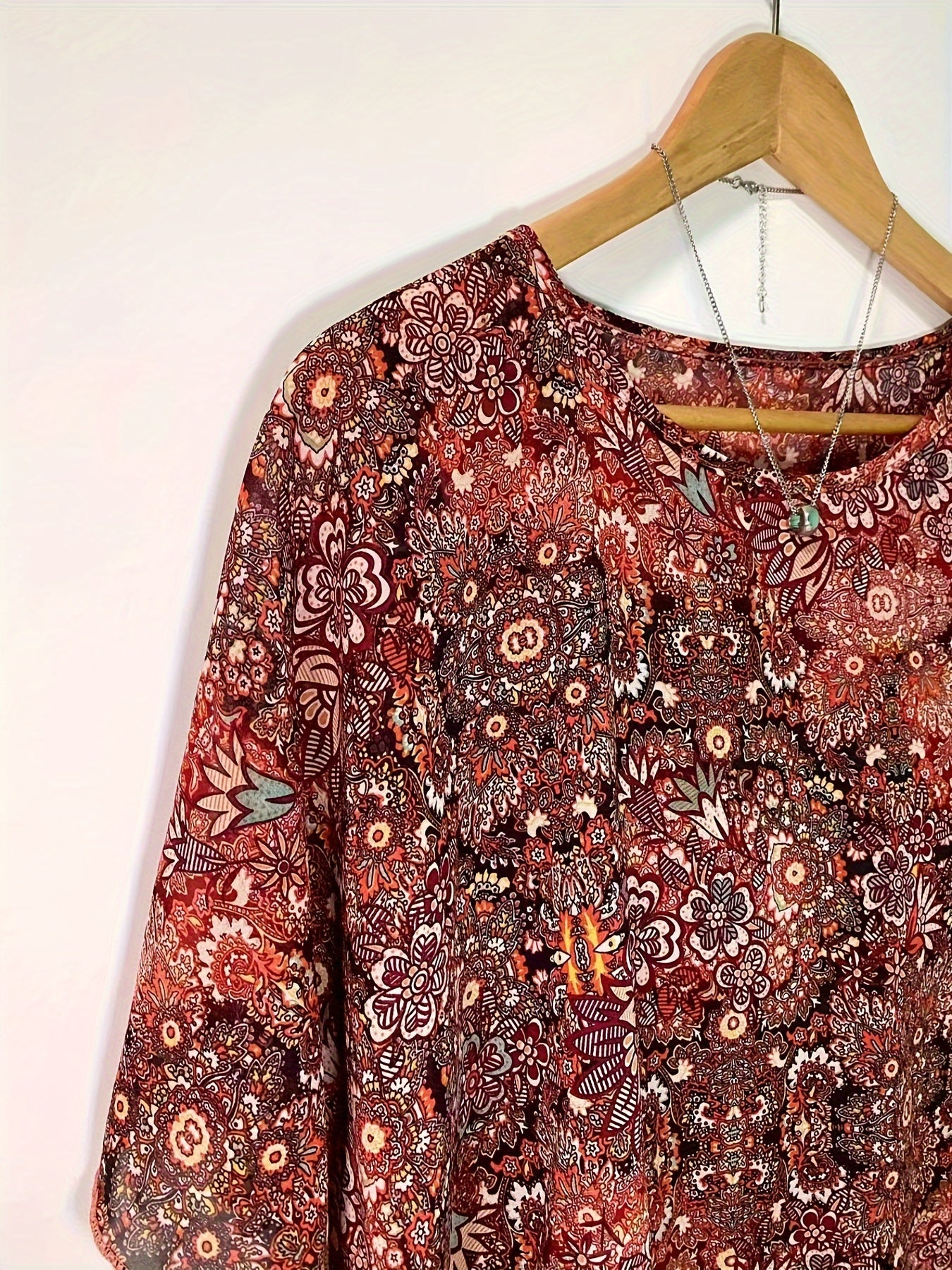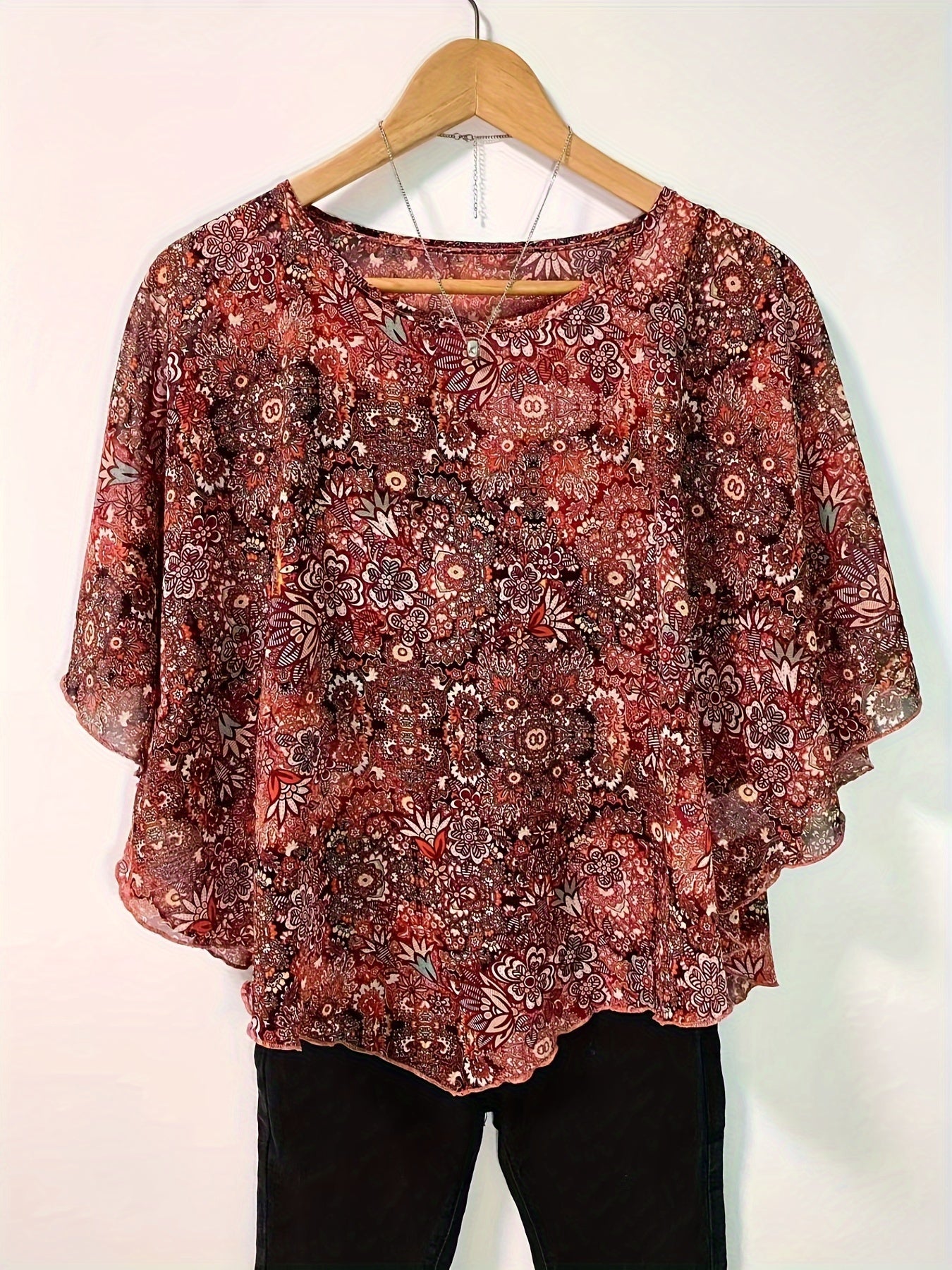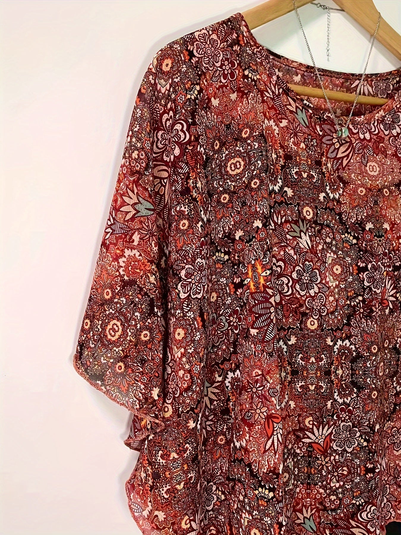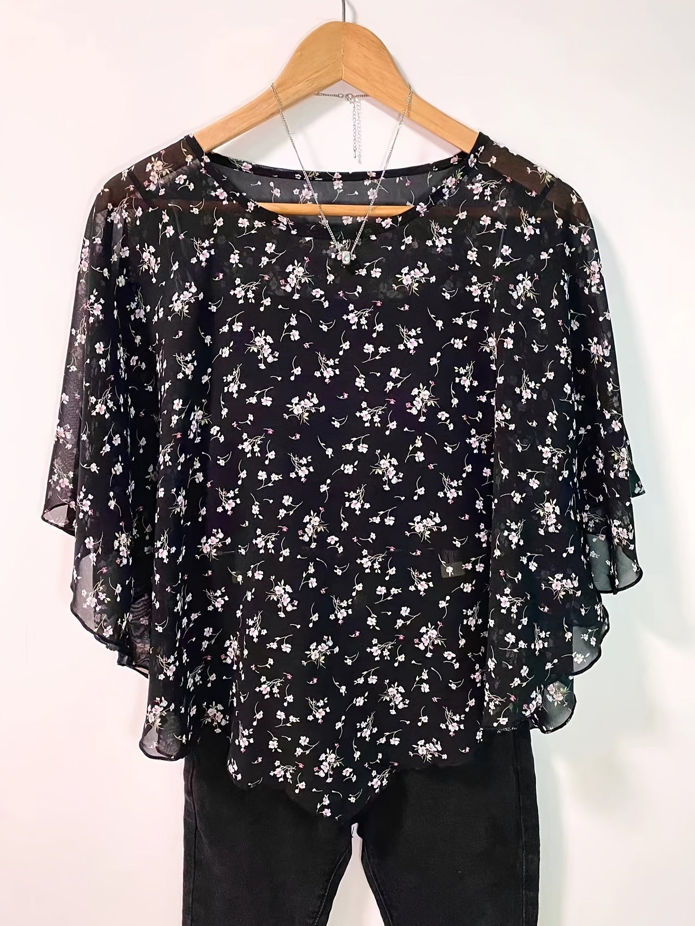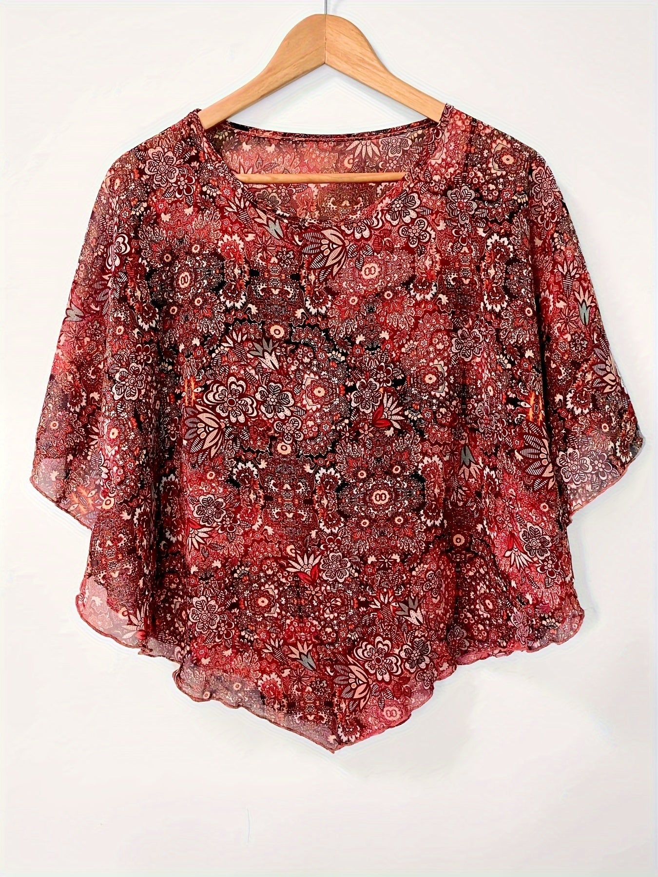 Կանացի էլեգանտ ծաղկային պրինտով ասիմետրիկ բլուզ՝ թափանցիկ թևով, կլոր վզով, ամառային արևապաշտպան վերնաշապիկ լողափի համար, գարուն/ամառ հավաքածու