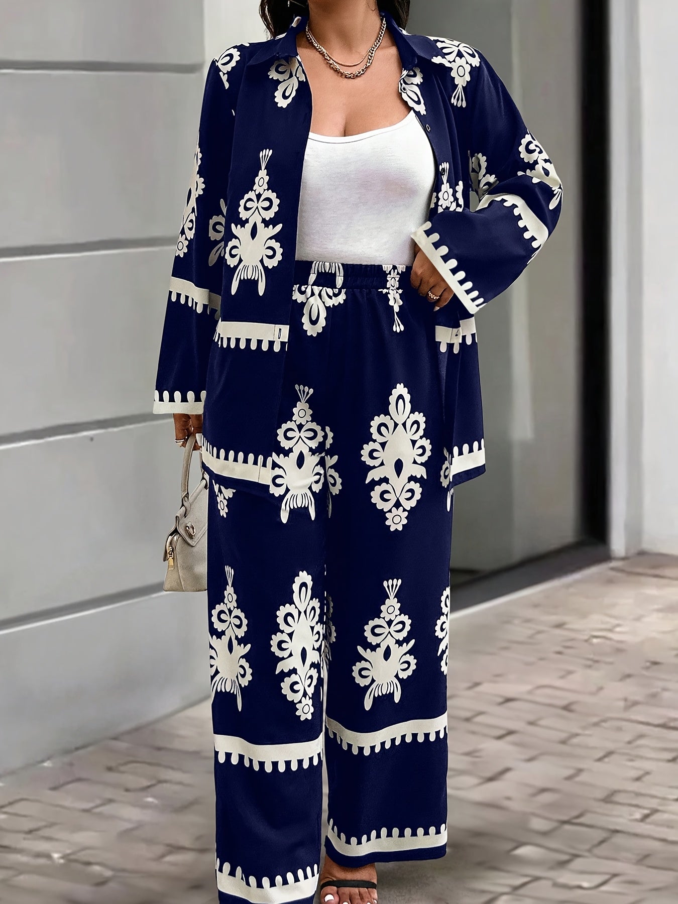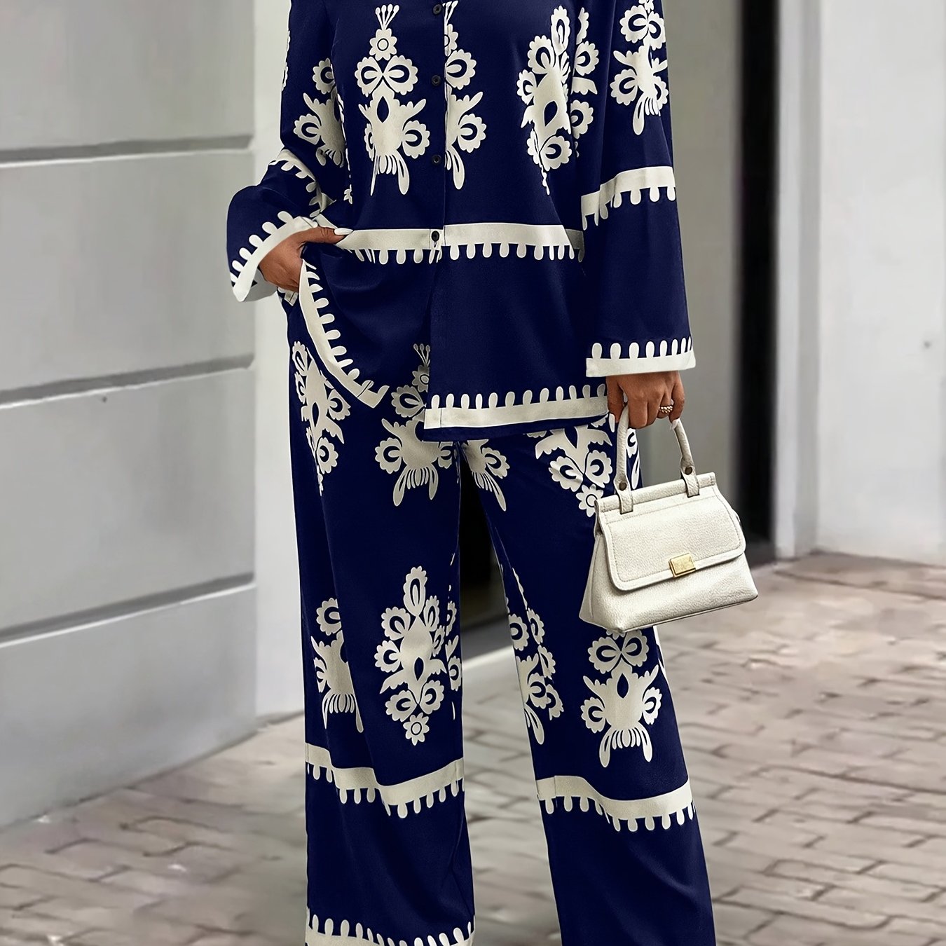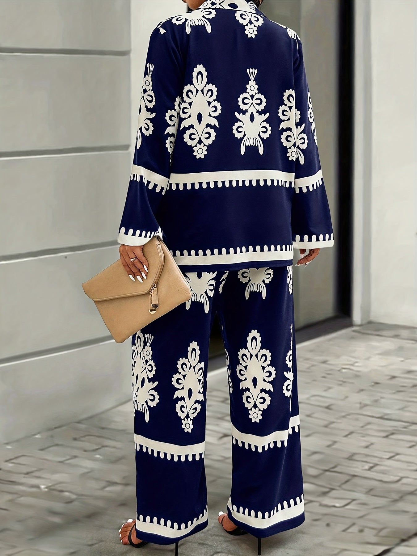 Կանացի էլեգանտ երկրաչափական նախշերով պոլիեսթերային կոստյումի հավաքածու, երկար թևքերով վերնաշապիկ՝ օձիքով և տաբատով, սովորական թևքերով, հյուսված ժապավենով, գարուն/աշուն՝ առօրյա, գյուղական ոճի հագուստ