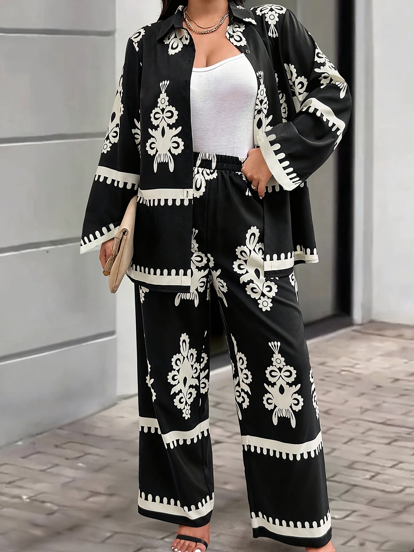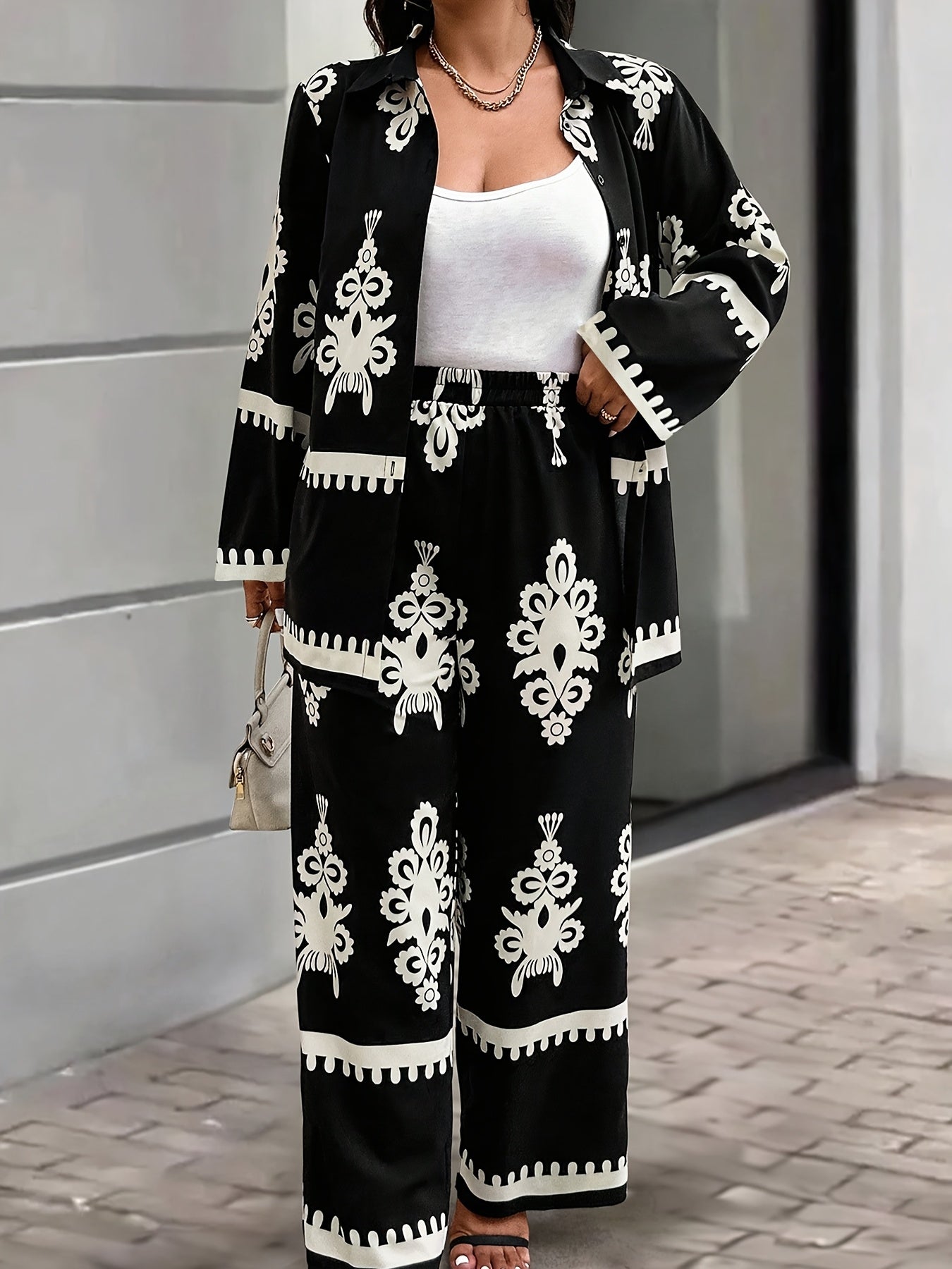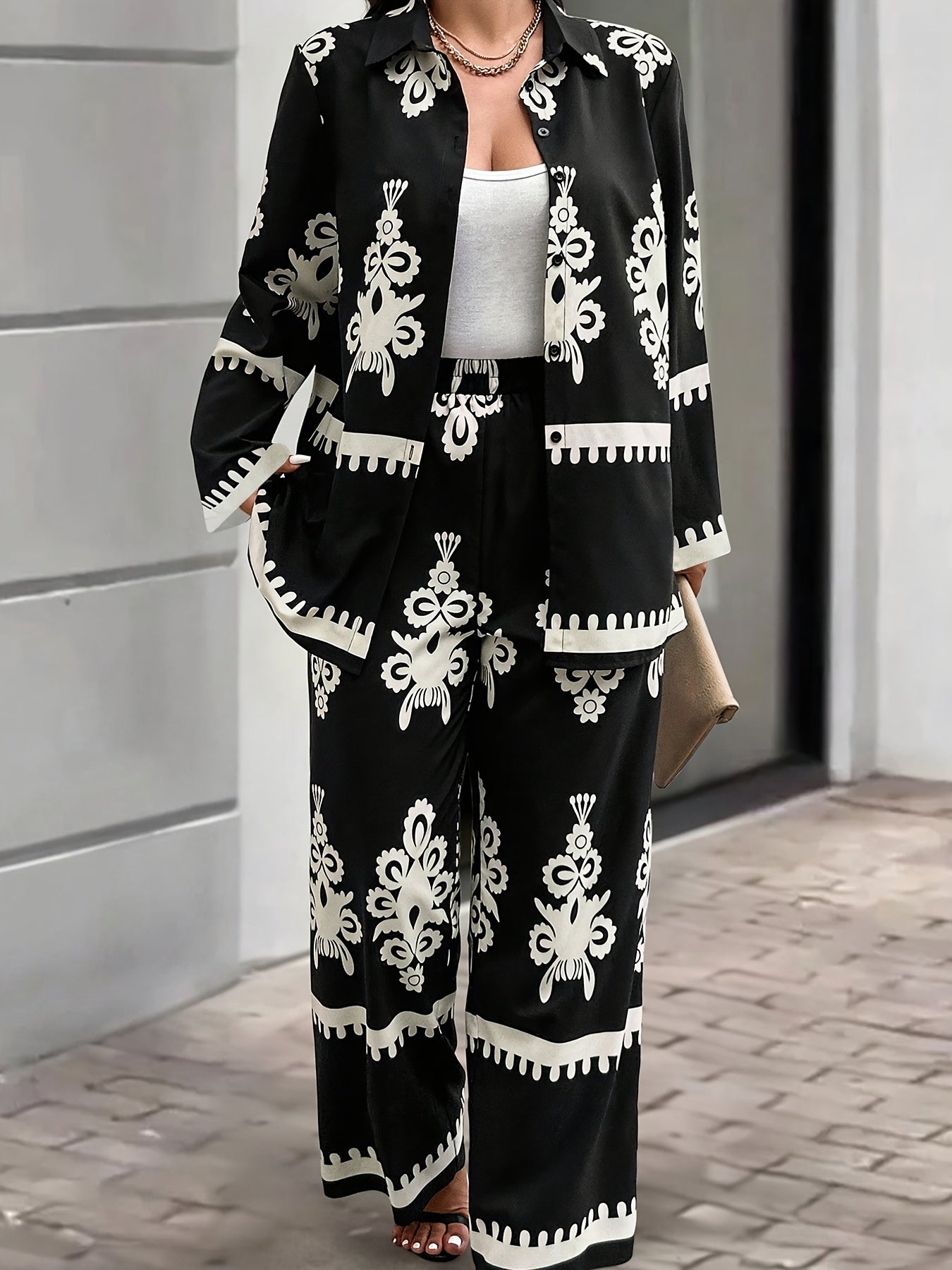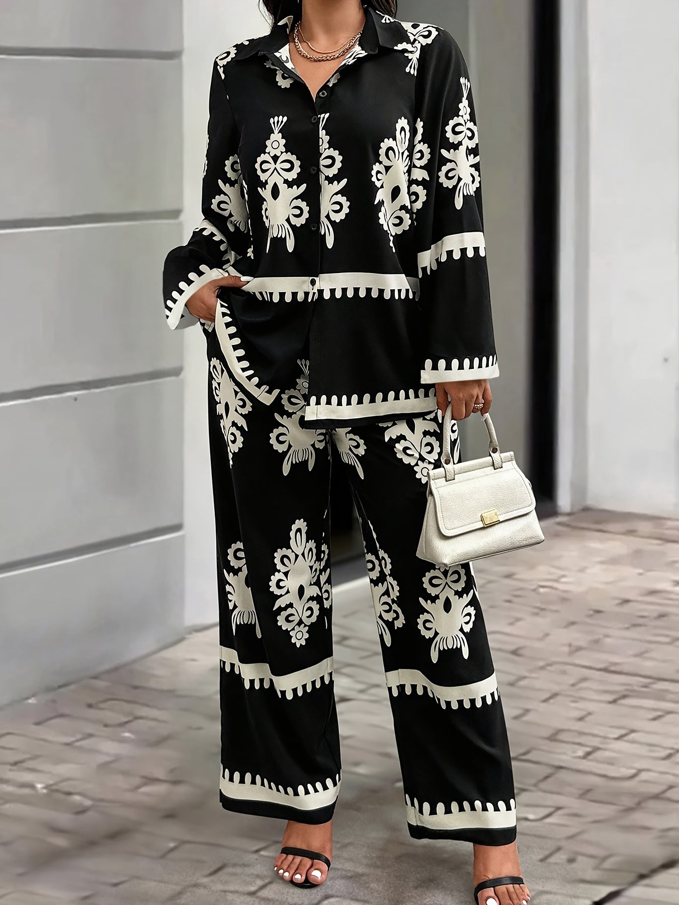 Կանացի էլեգանտ երկրաչափական նախշերով պոլիեսթերային կոստյումի հավաքածու, երկար թևքերով վերնաշապիկ՝ օձիքով և տաբատով, սովորական թևքերով, հյուսված ժապավենով, գարուն/աշուն՝ առօրյա, գյուղական ոճի հագուստ