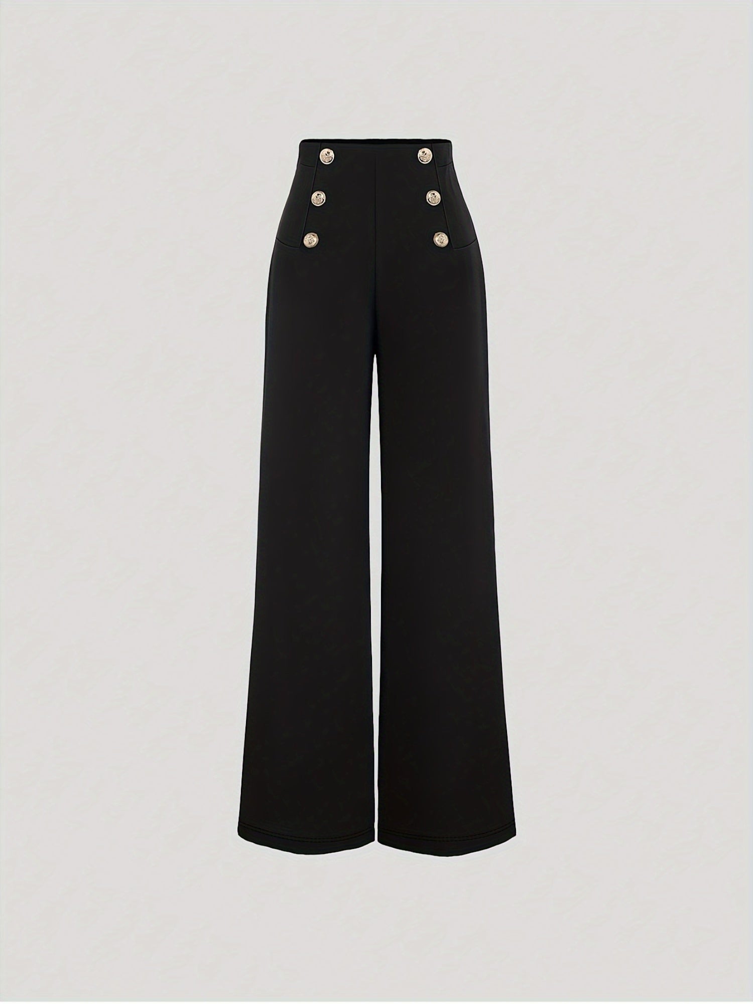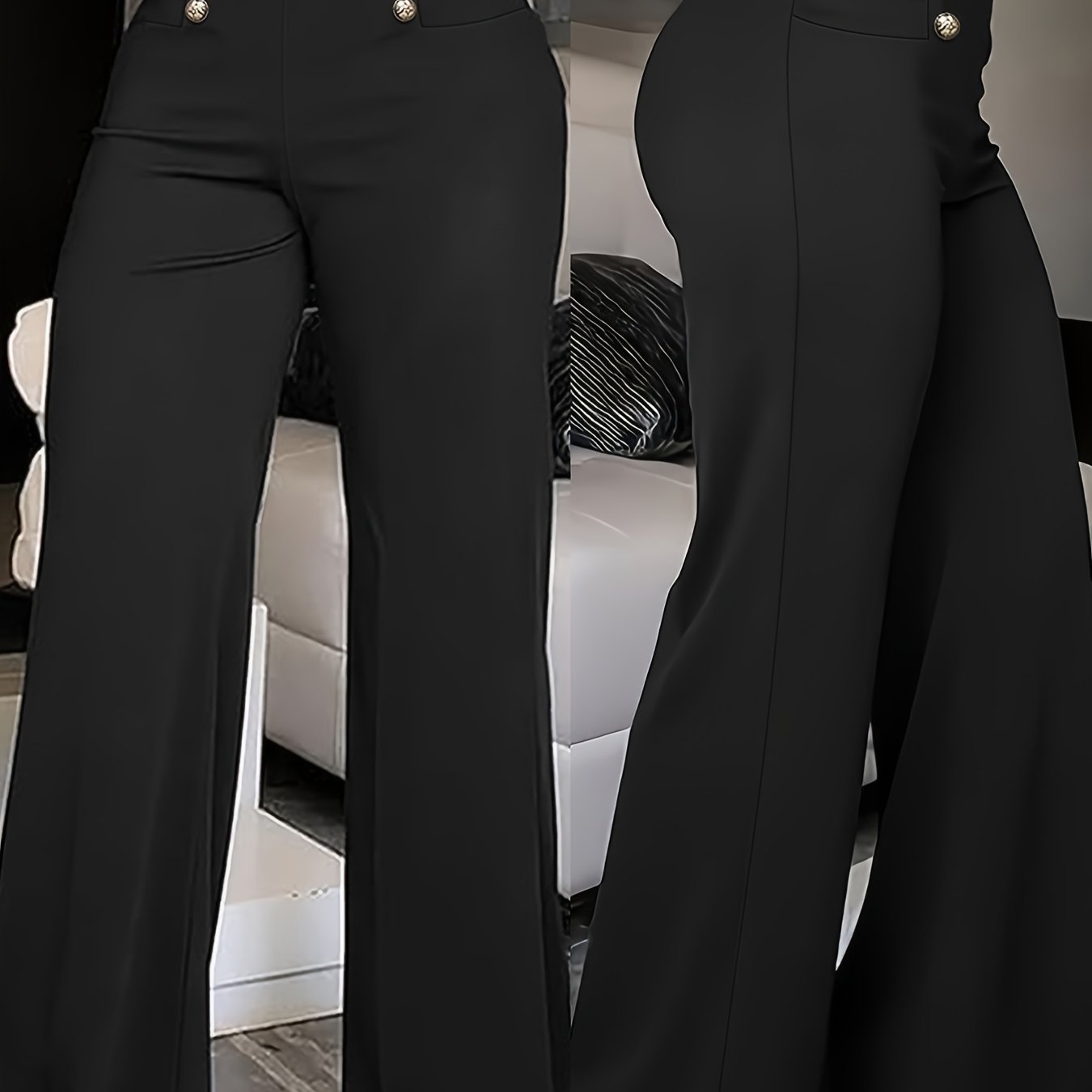 Կանացի էլեգանտ բարձր գոտկատեղով լայն տաբատ՝ սև պոլիեսթեր ուղիղ ոտքը կոճակով, բոլոր սեզոնային նորաձև տաբատ՝ ամենօրյա կամ զգեստավոր հագուստի համար