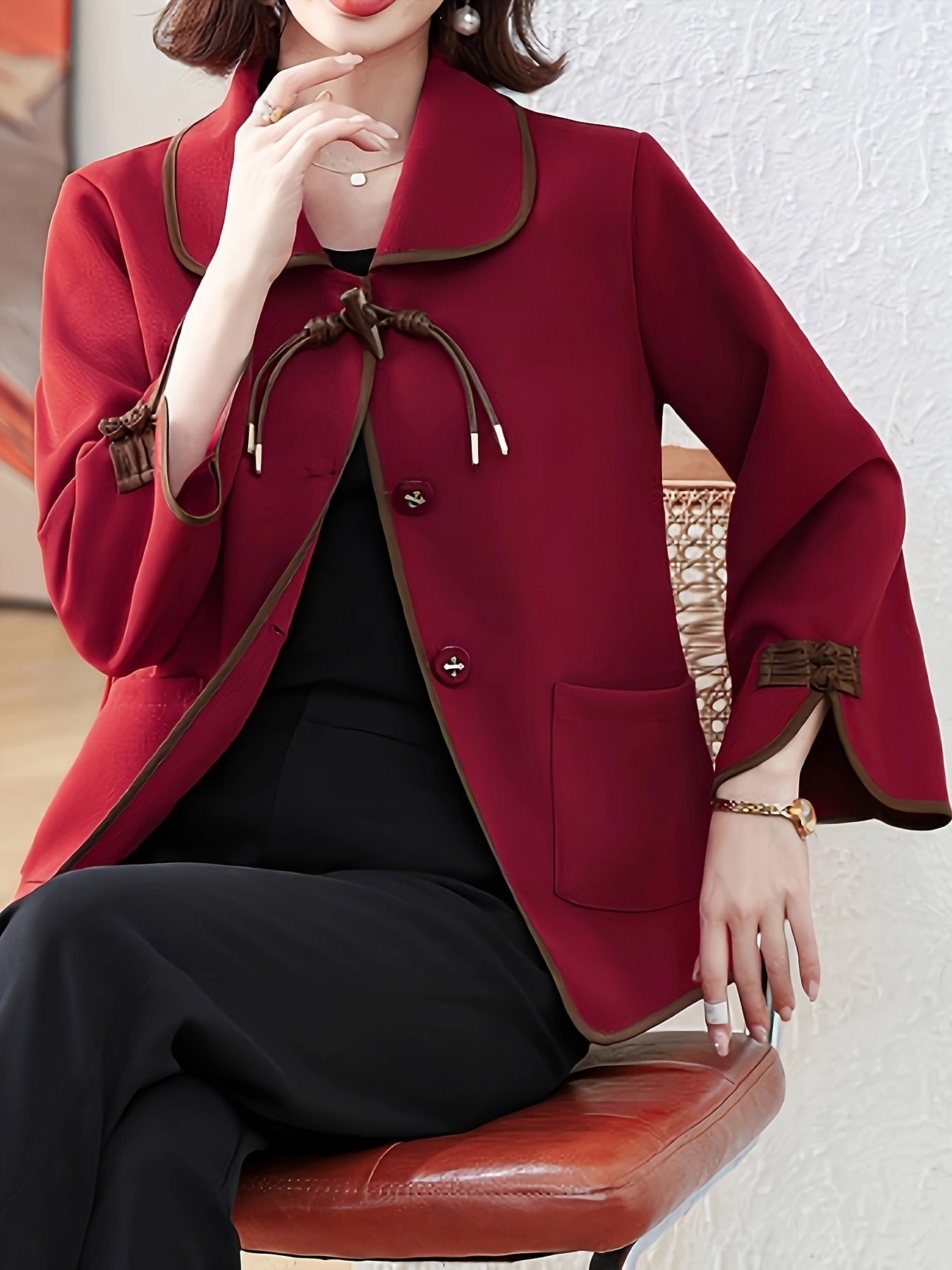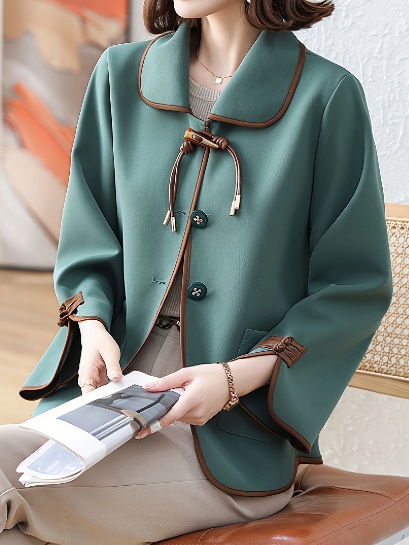 Կանացի էլեգանտ կորեա-ճապոնական ոճի գարուն/աշնանային բաճկոն - մուգ կանաչ՝ շագանակագույն կոճակներով և դեկորատիվ կոճակներով, լվացքի մեքենայով լվացվող թեթև վերնազգեստ՝ առօրյա կամ պաշտոնական հագուստի համար