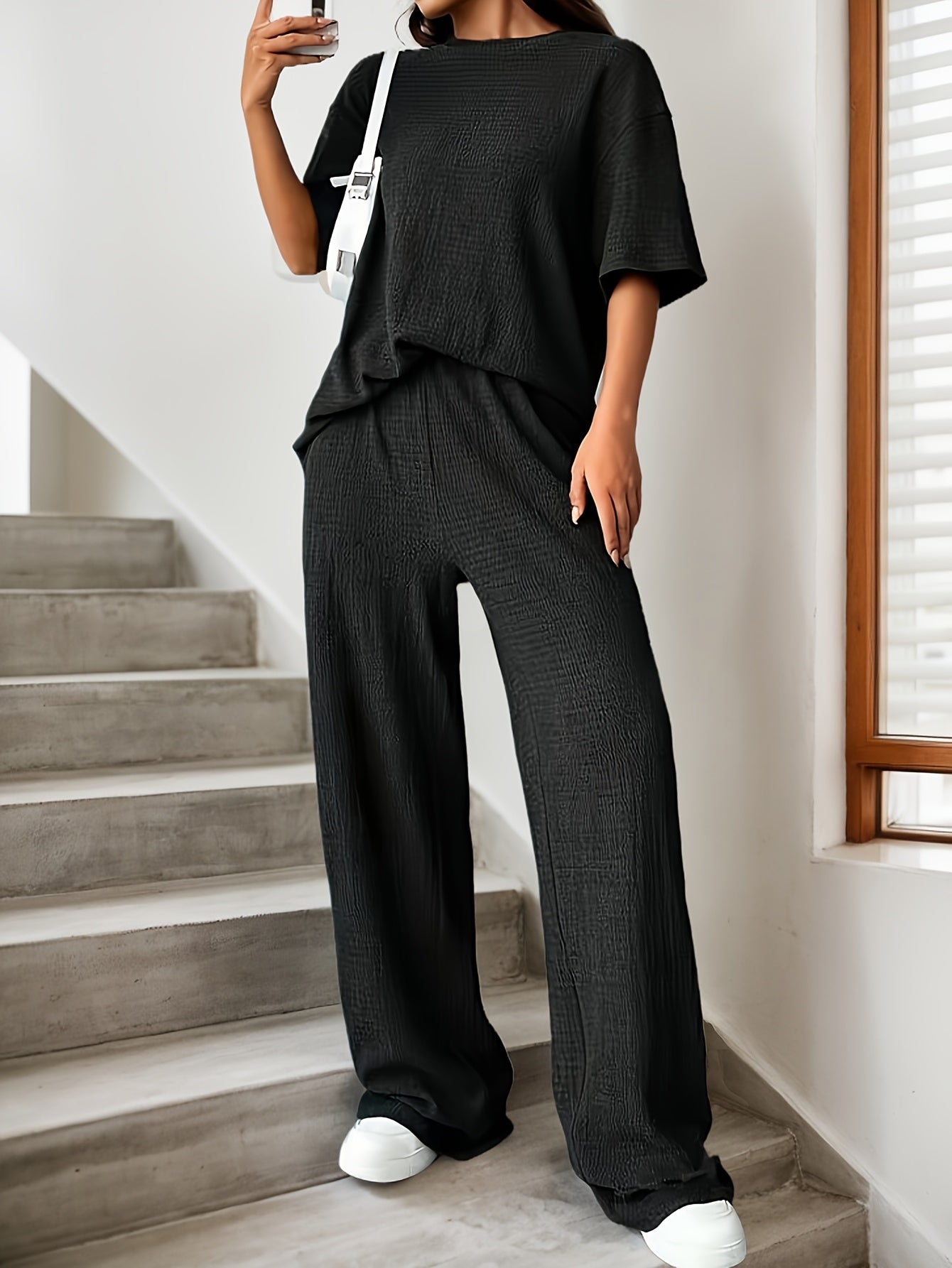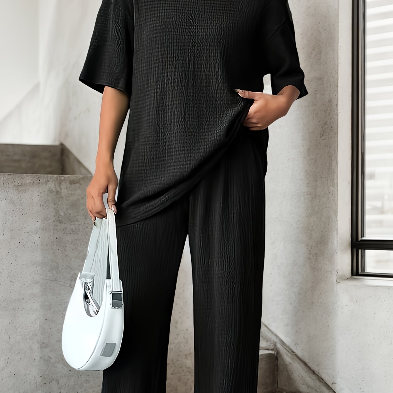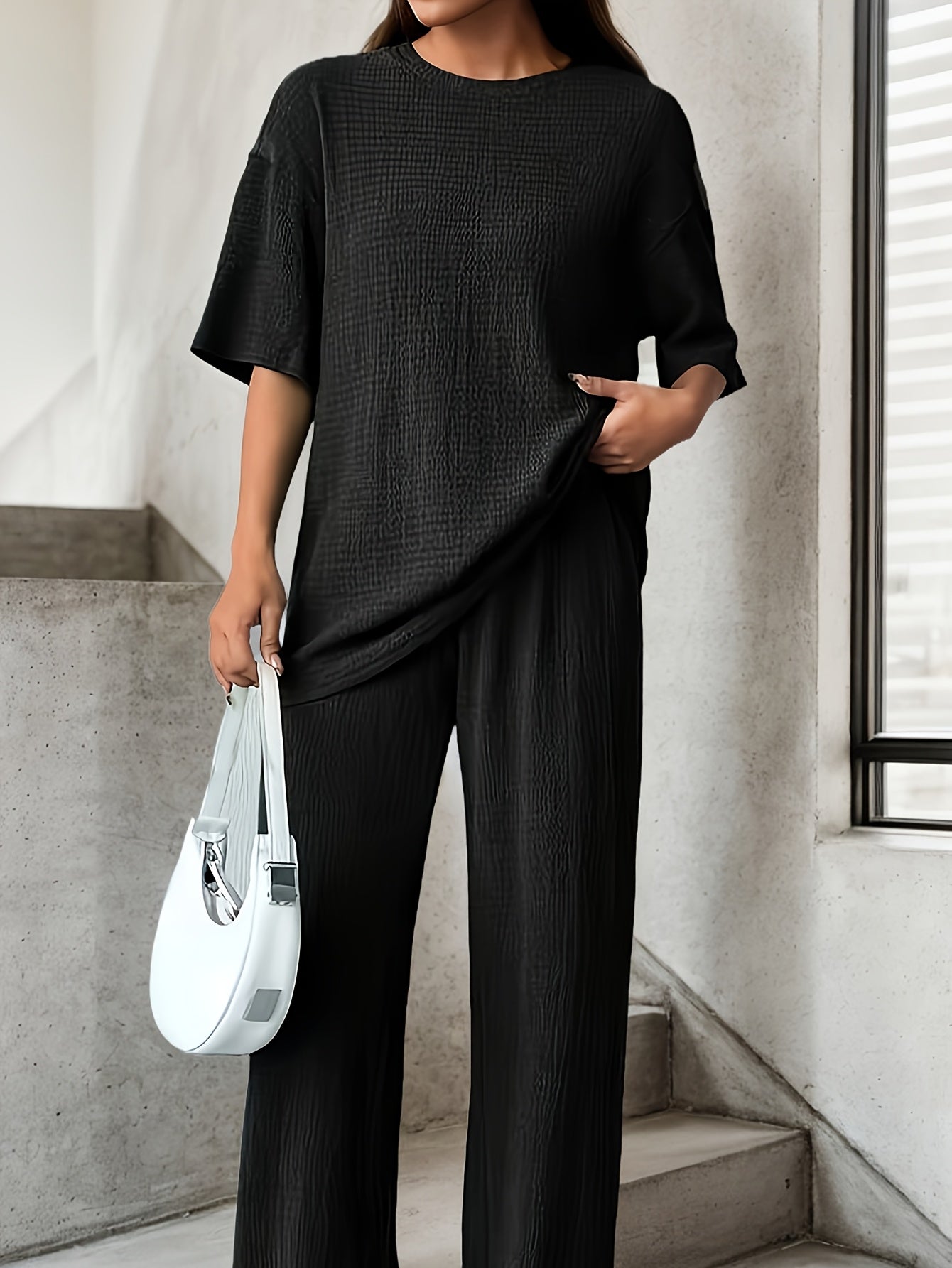 Կանացի էլեգանտ միագույն, կլոր վզնոցով մարզաշապիկի և տաբատի հավաքածու, պոլիեսթերային տրիկոտաժե գործվածք, 95% պոլիեսթեր 5% էլաստան, գարուն/ամառվա համար նախատեսված առօրյա հագուստ՝ իջեցված ուսերով, 170 գ/մ²