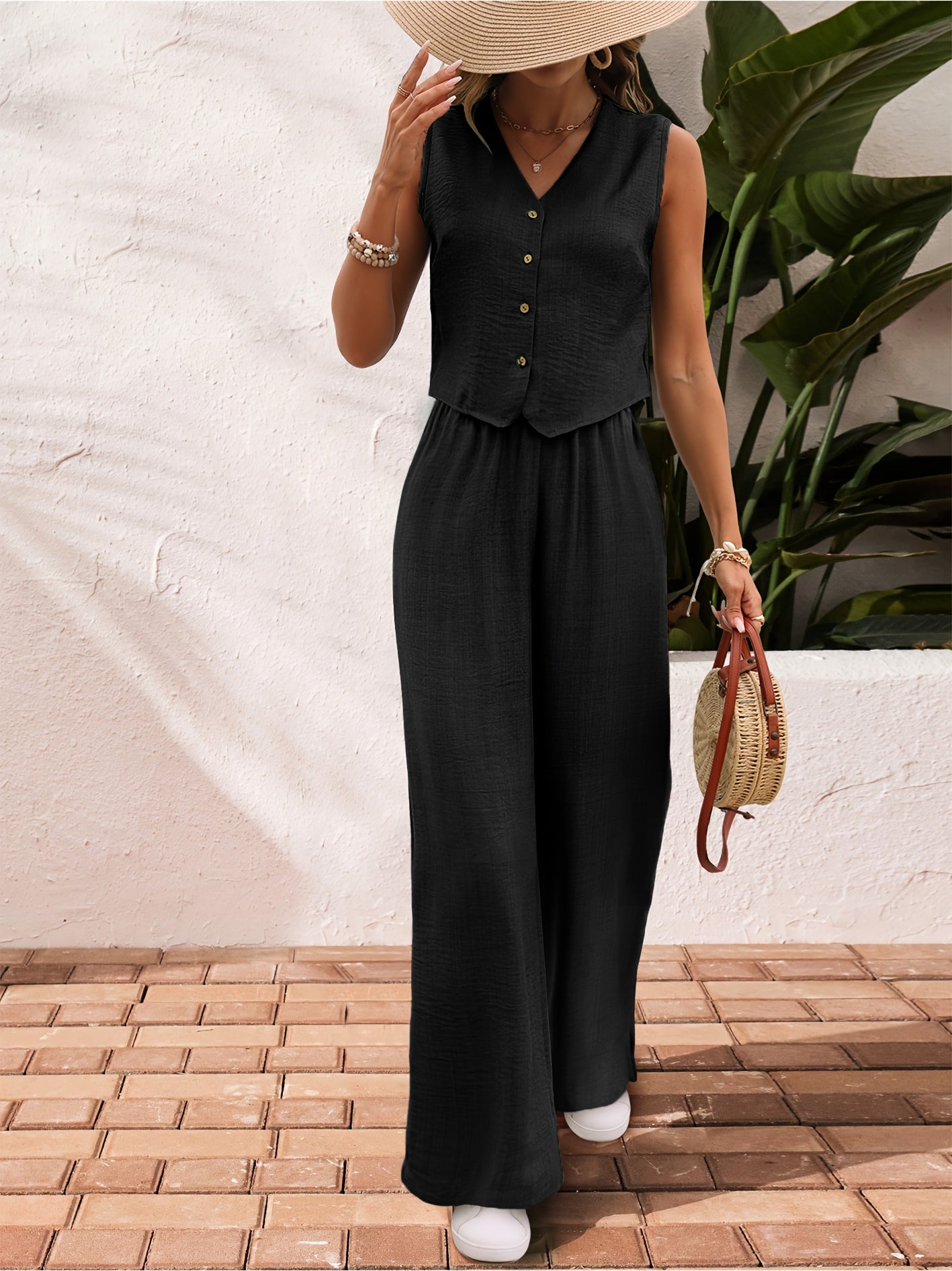 Կանացի էլեգանտ միագույն, անթև, V-ձև օձիքով, երկկտոր հավաքածու - ամառային առօրյա կոմբինեզոն կոճակներով, լայն տաբատ և բեժ սեպաձև սանդալներ, առօրյա հագուստ | V-ձև օձիքով կոմբինեզոն | էլեգանտ կոմբինեզոն