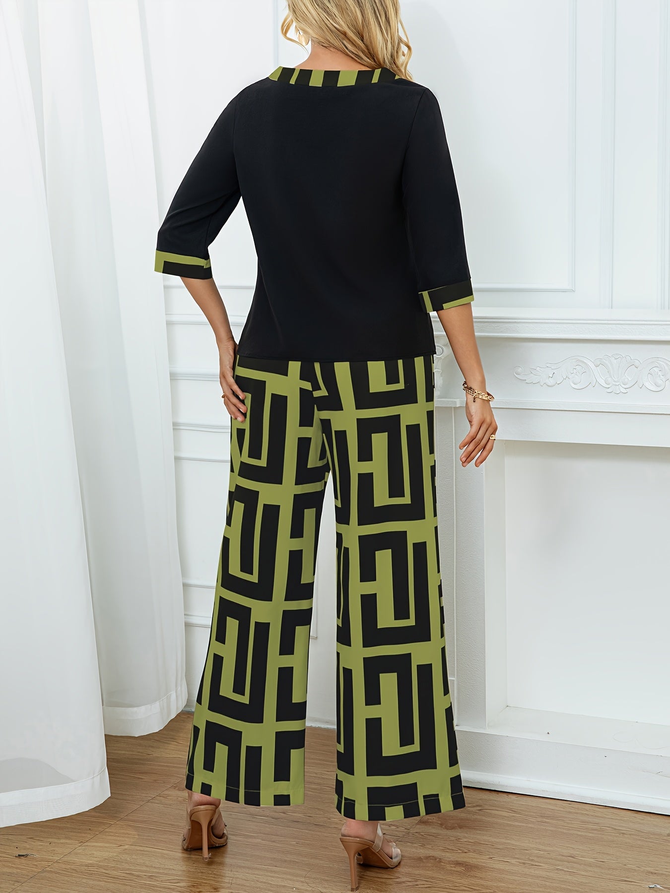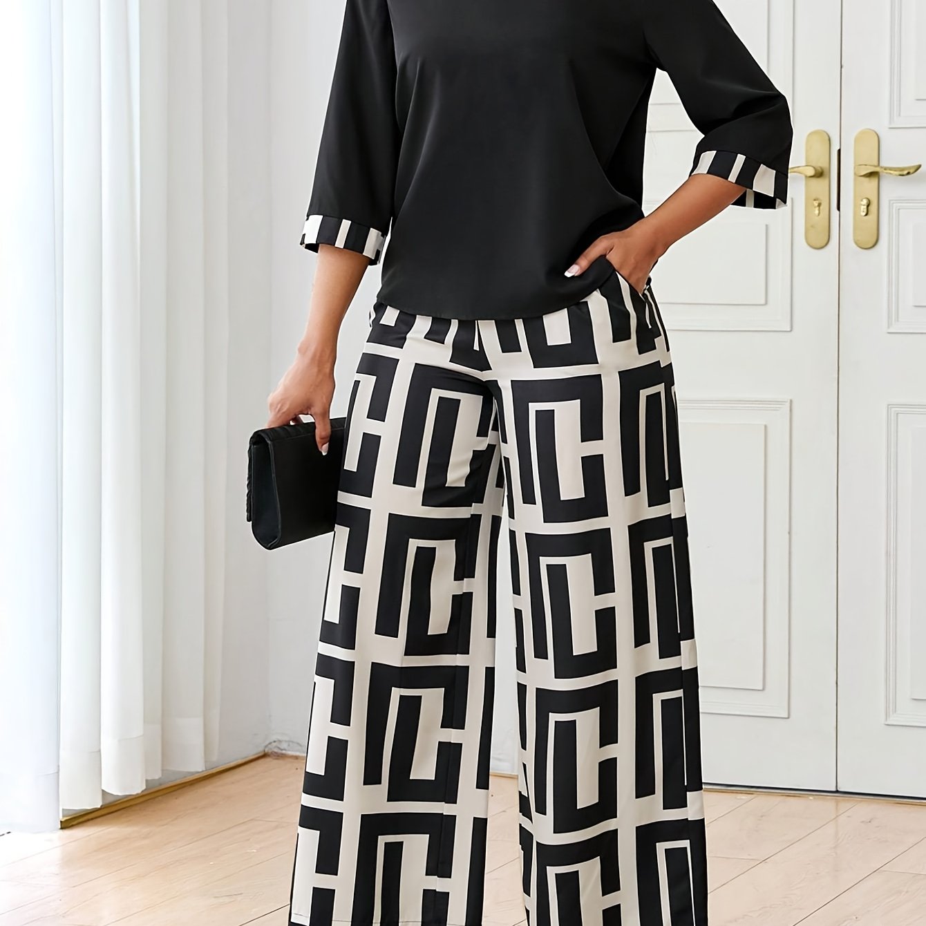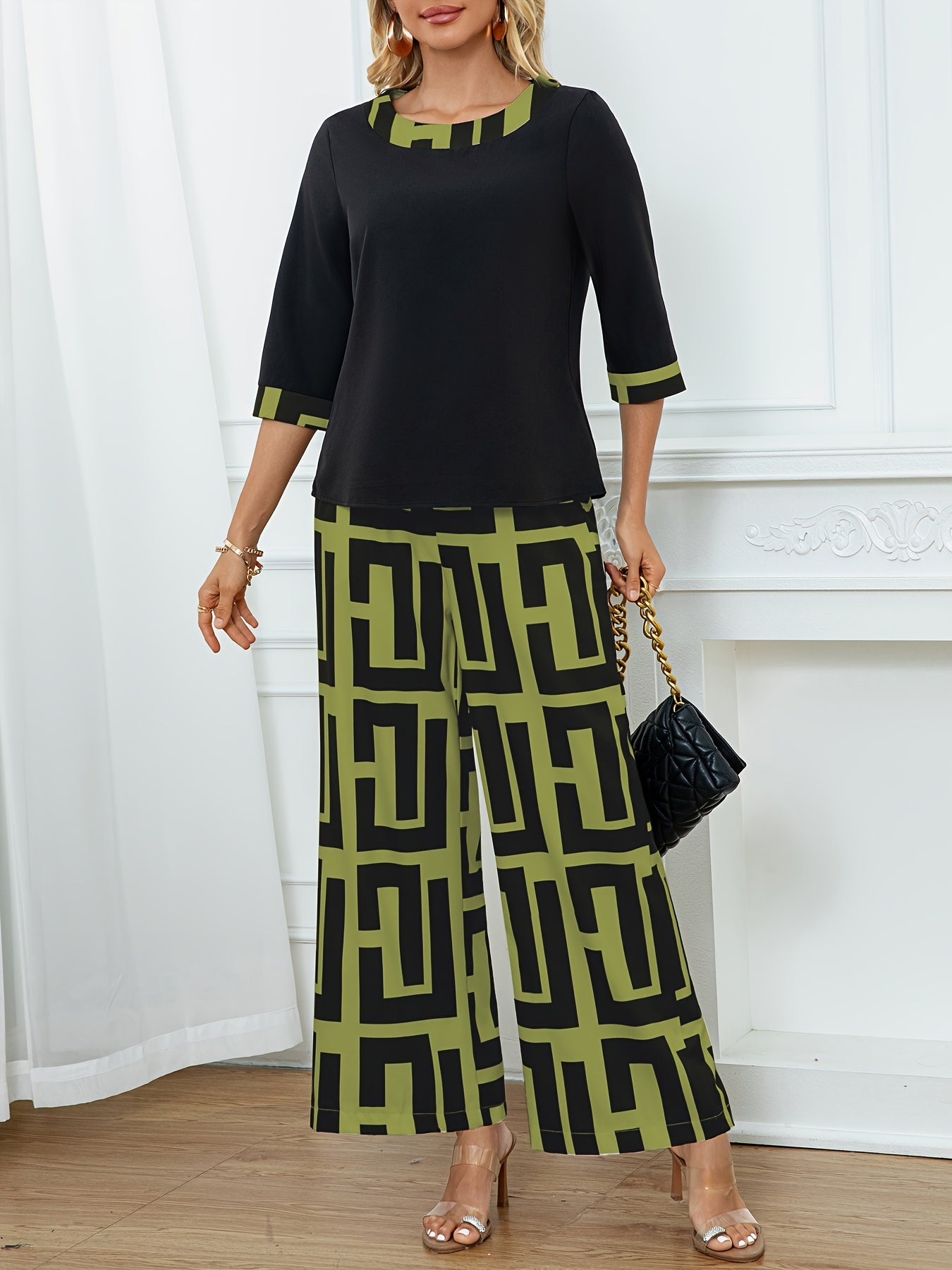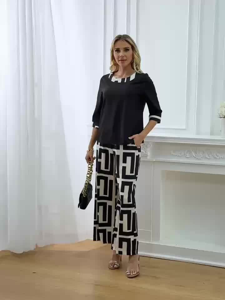 Կանացի էլեգանտ, կլոր վզնոցով վերնաշապիկ + երկրաչափական նախշերով լայն տաբատ՝ երկու մասից բաղկացած հավաքածու