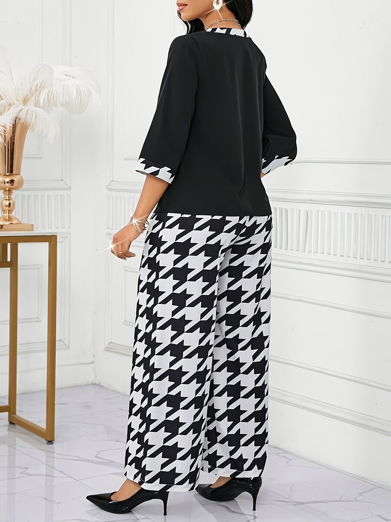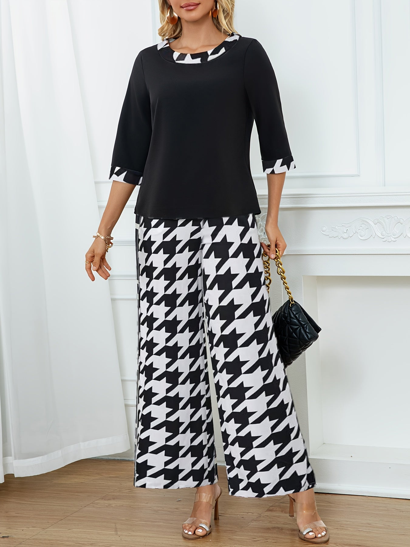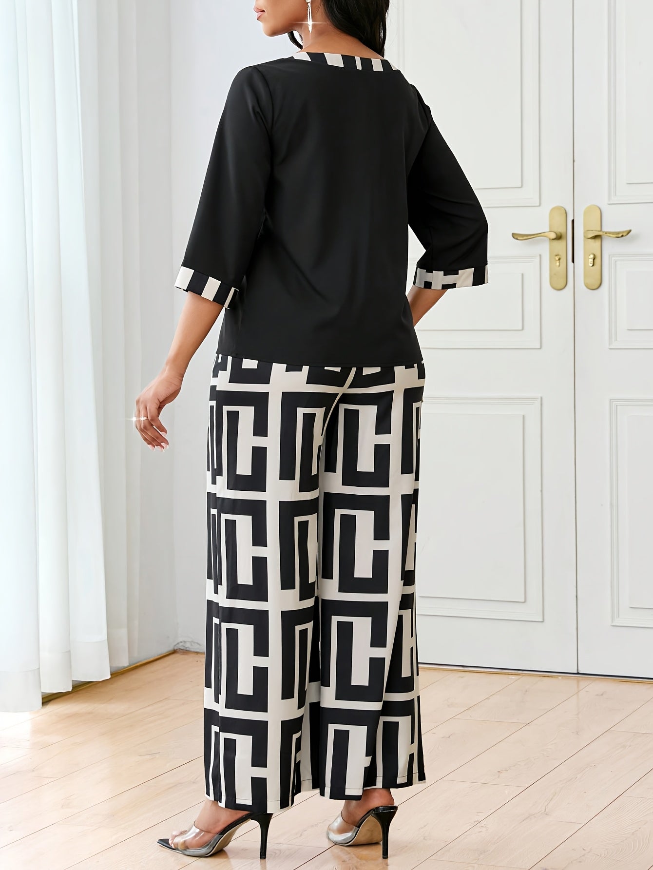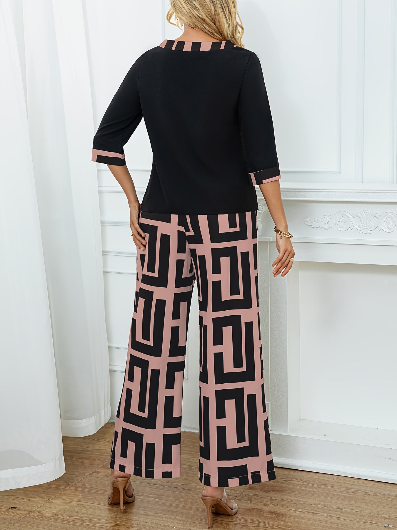 Կանացի էլեգանտ, կլոր վզնոցով վերնաշապիկ + երկրաչափական նախշերով լայն տաբատ՝ երկու մասից բաղկացած հավաքածու