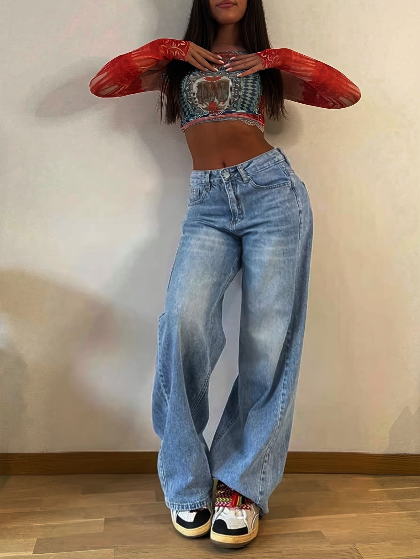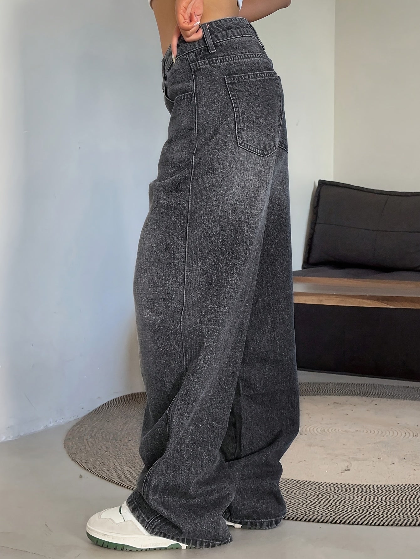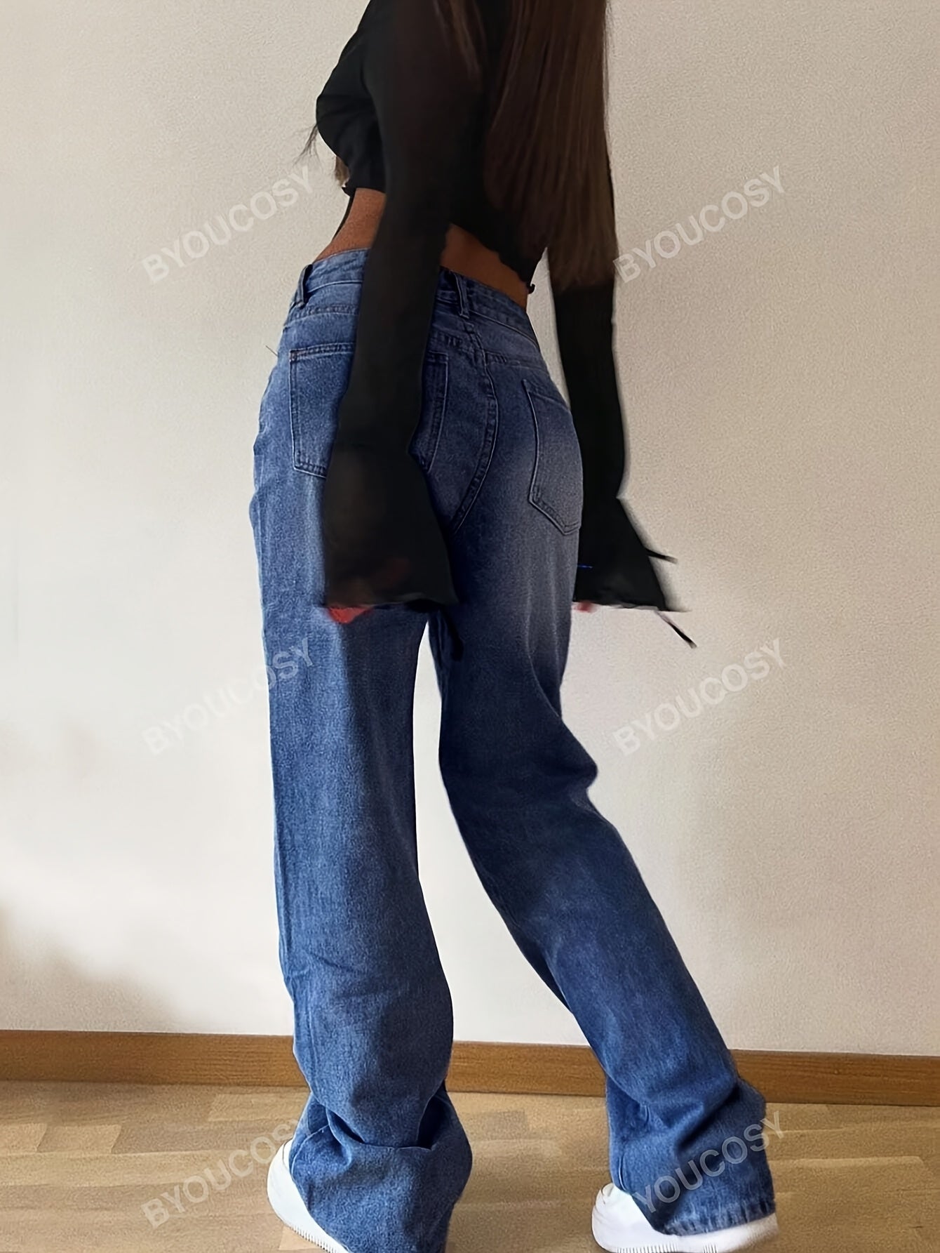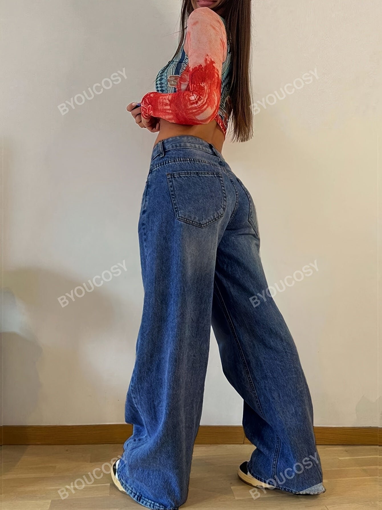 Կանացի նորաձև ջինսե լայն ոտքեր, սովորական բարձր գոտկատեղով ջինսե տաբատ՝ գրպաններով, բոլոր սեզոնային միաձույլ գույնի, հարմարավետ նիհարեցման ձևավորում, 54,10% 35,10% պոլիեսթեր 9,50% վիսկոզա 1,30% էլաստան