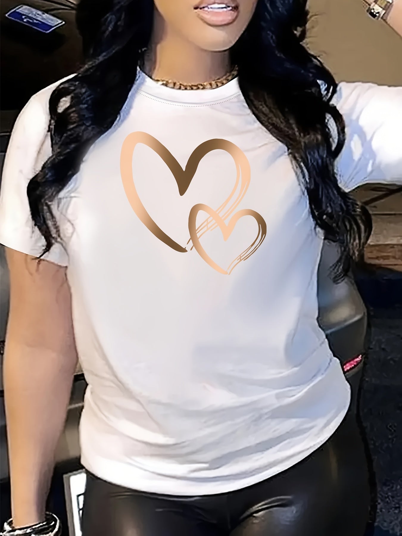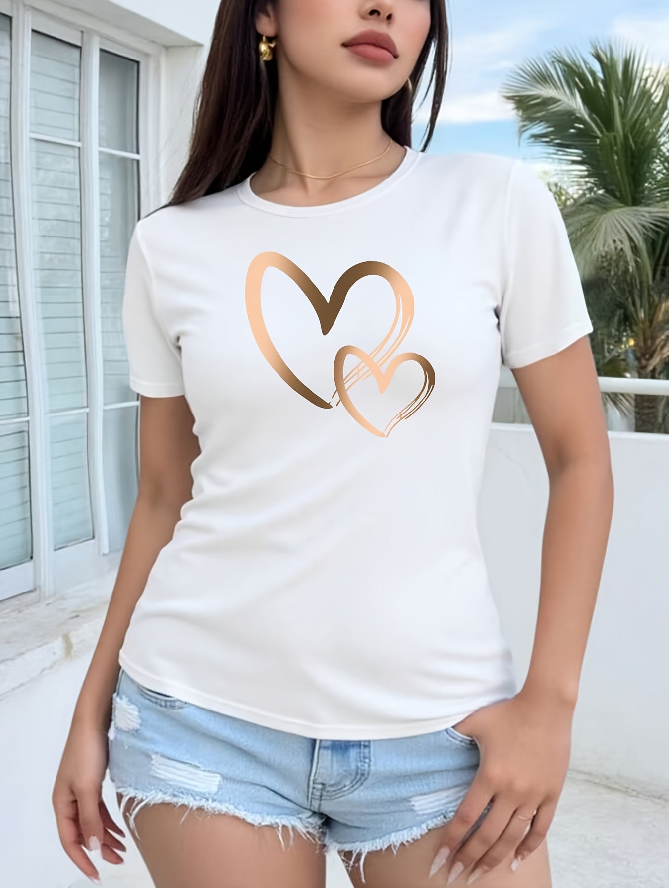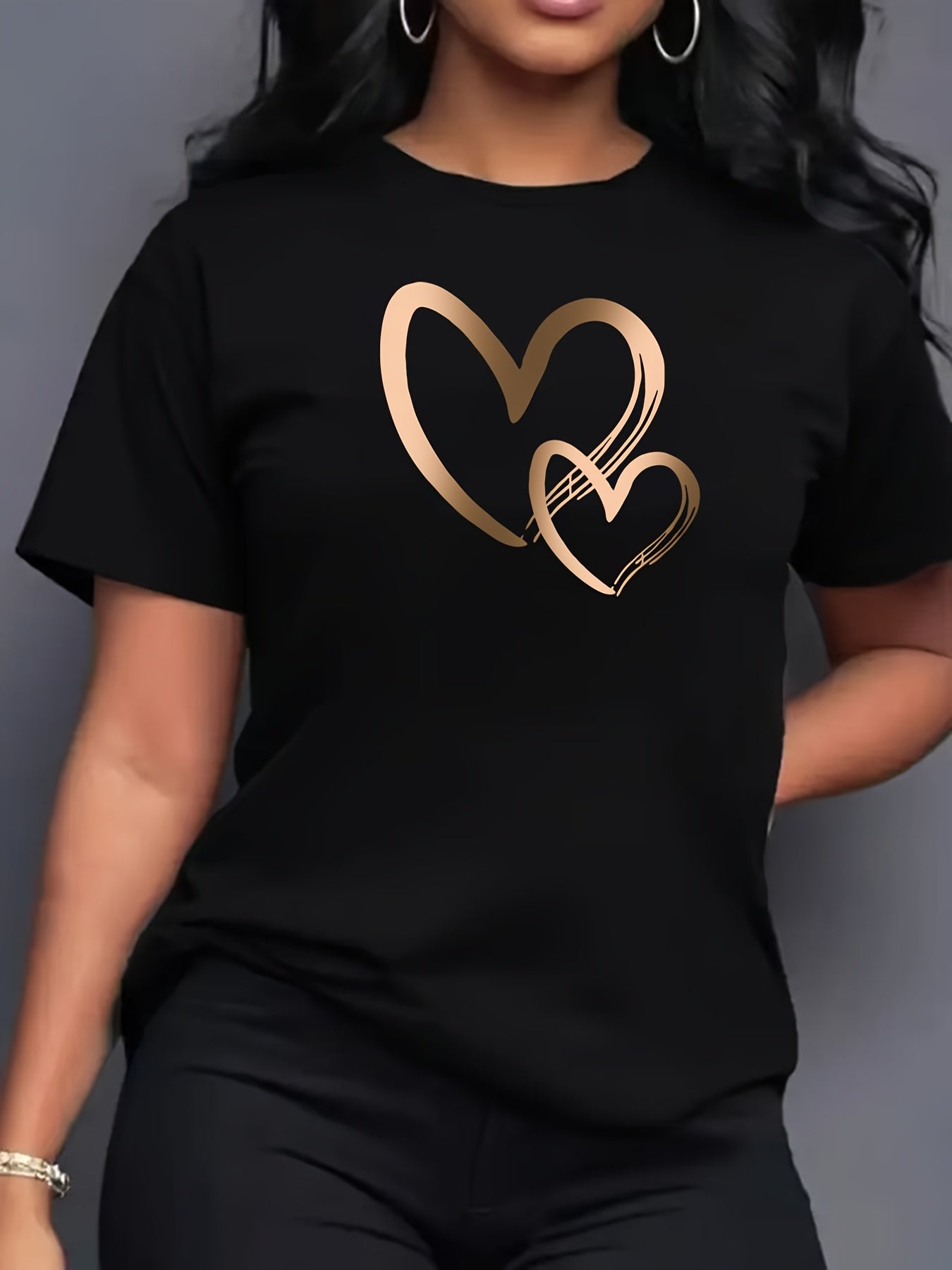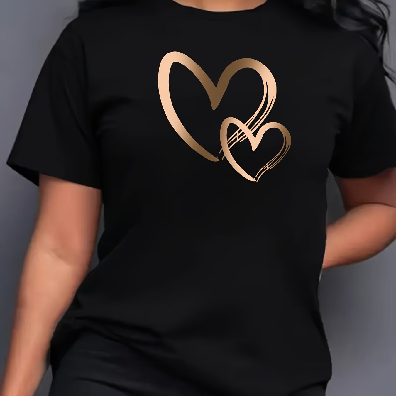 Կանացի սրտաձև գրաֆիկական շապիկ - կարճ թևքերով, կլոր վզնոցով, ձգվող պոլիեսթերից, գարուն/ամառային առօրյա վերնաշապիկ՝ ոսկեգույն սրտաձև նախշերով, հարմարավետ հագուստ | Սրտաձև նախշերով շապիկ | Անթափանցիկ նյութ