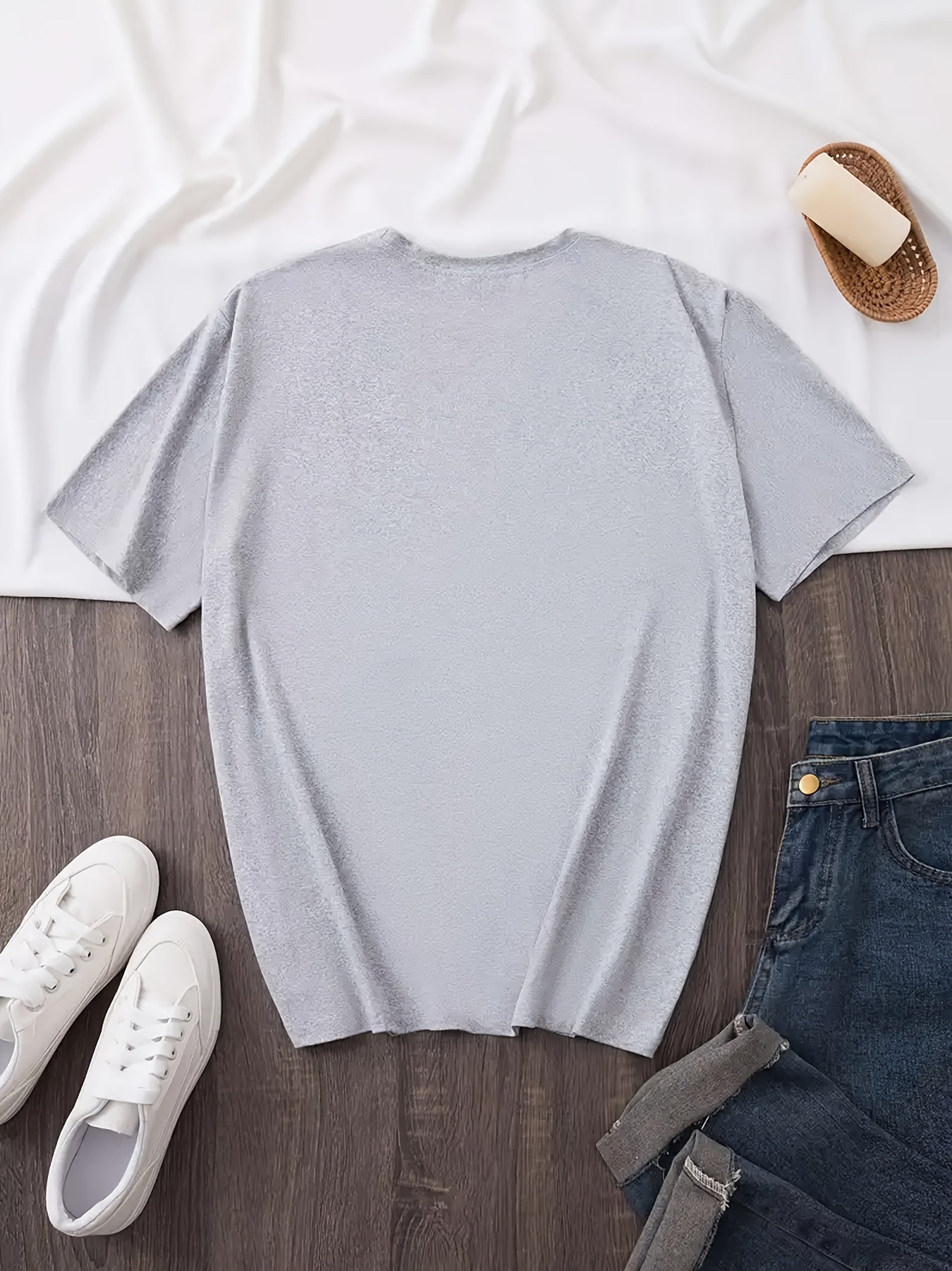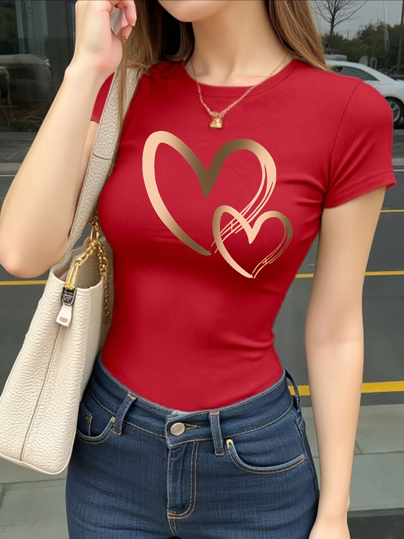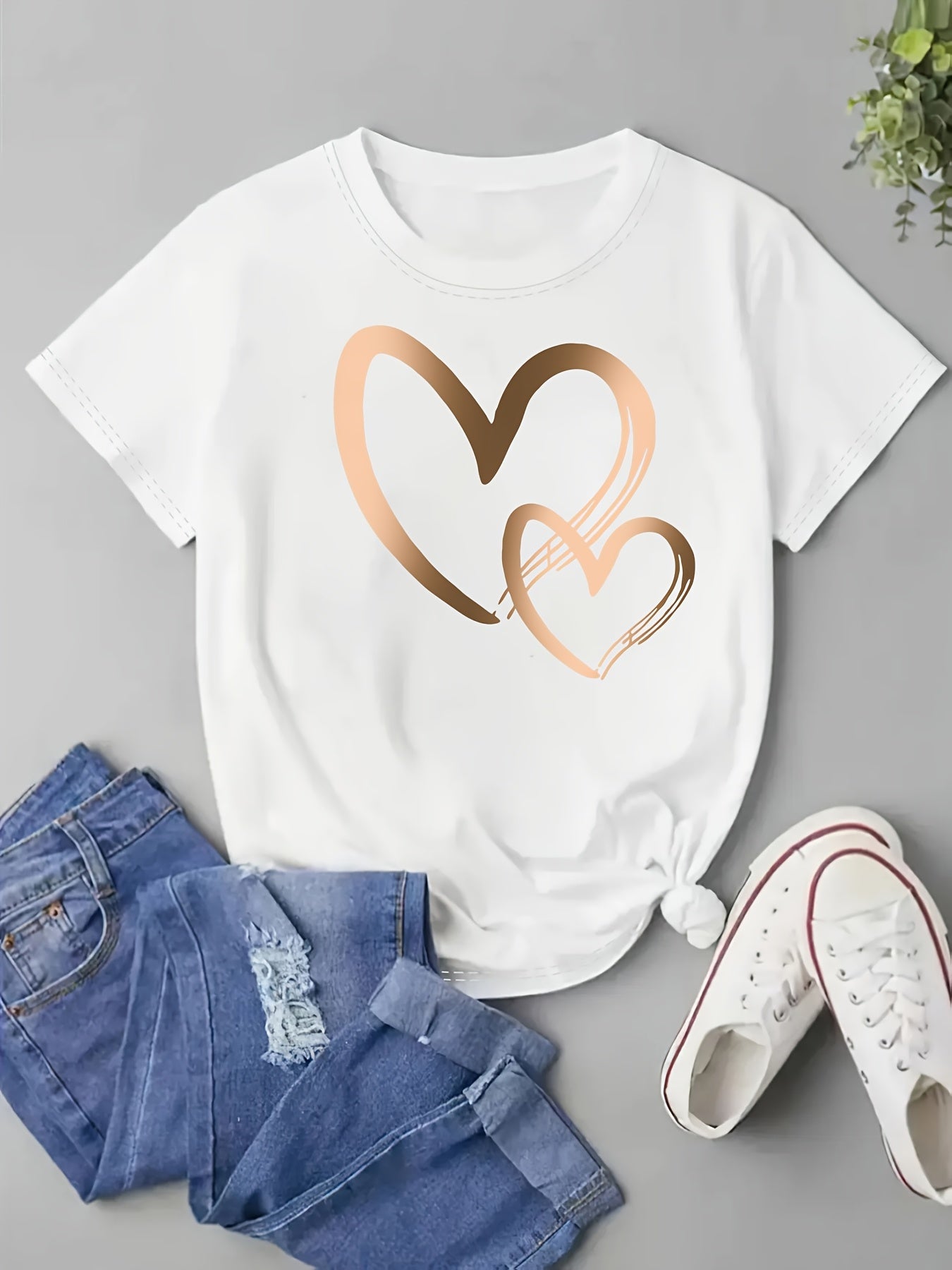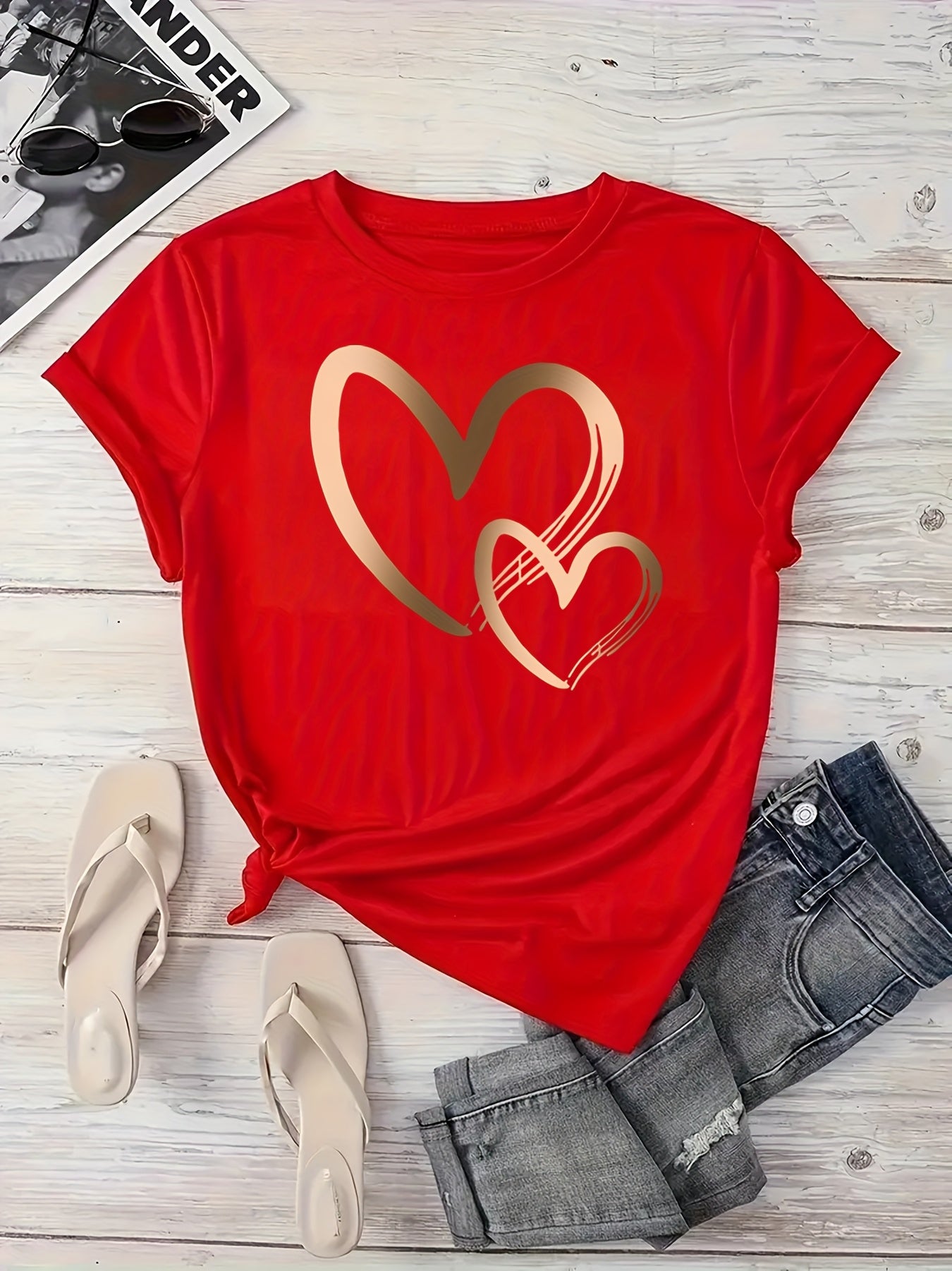 Կանացի սրտաձև գրաֆիկական շապիկ - կարճ թևքերով, կլոր վզնոցով, ձգվող պոլիեսթերից, գարուն/ամառային առօրյա վերնաշապիկ՝ ոսկեգույն սրտաձև նախշերով, հարմարավետ հագուստ | Սրտաձև նախշերով շապիկ | Անթափանցիկ նյութ