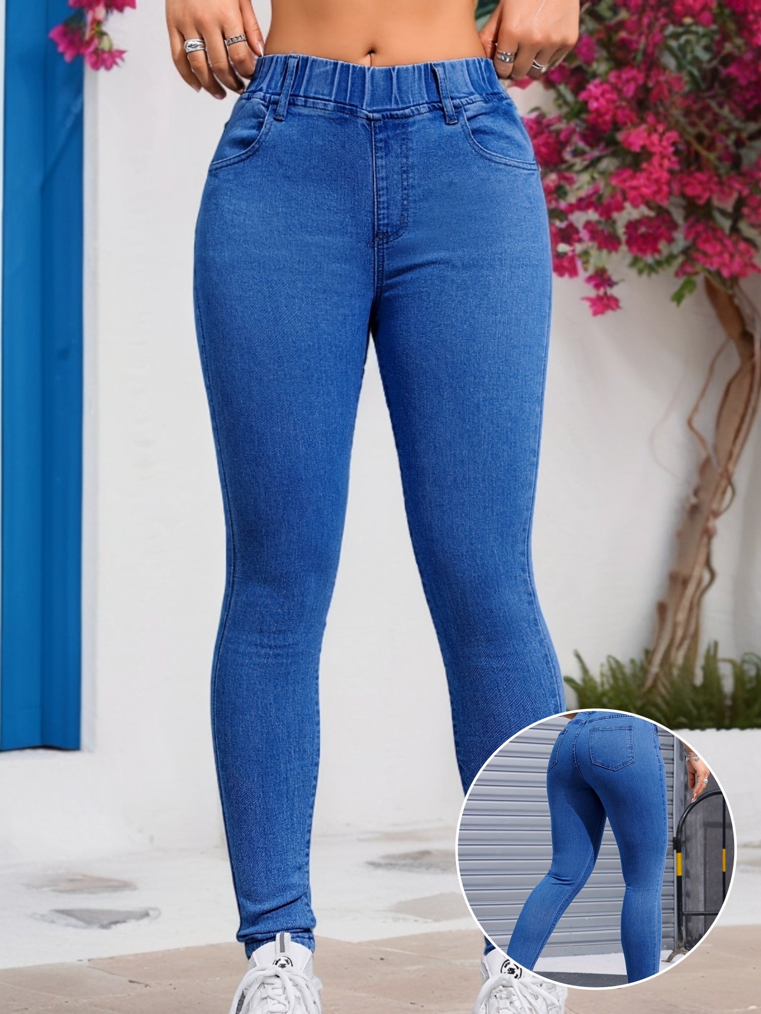 Կանացի բարձր ձգվող նեղ ջինսեր, սովորական միագույն լվացված ջինս, պոլիեսթեր և էլաստանի խառնուրդով, բոլոր սեզոնային հագուստի համար