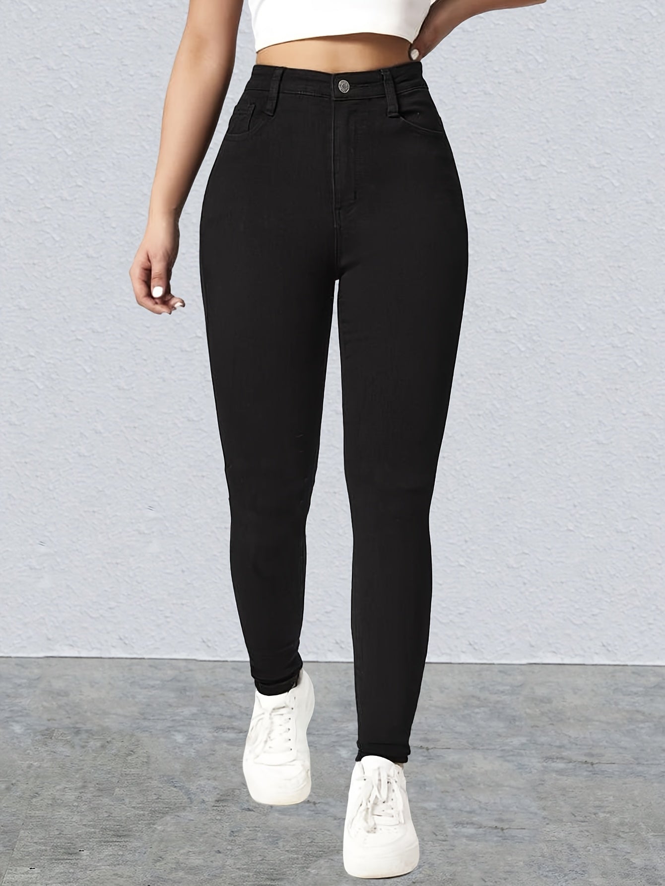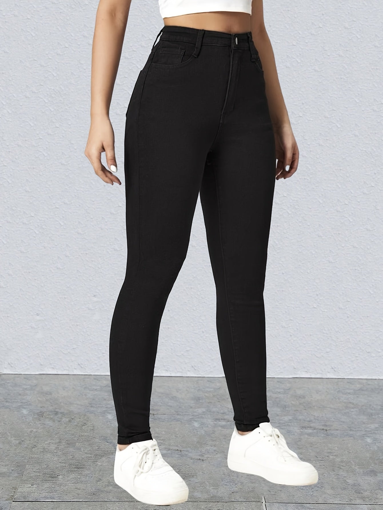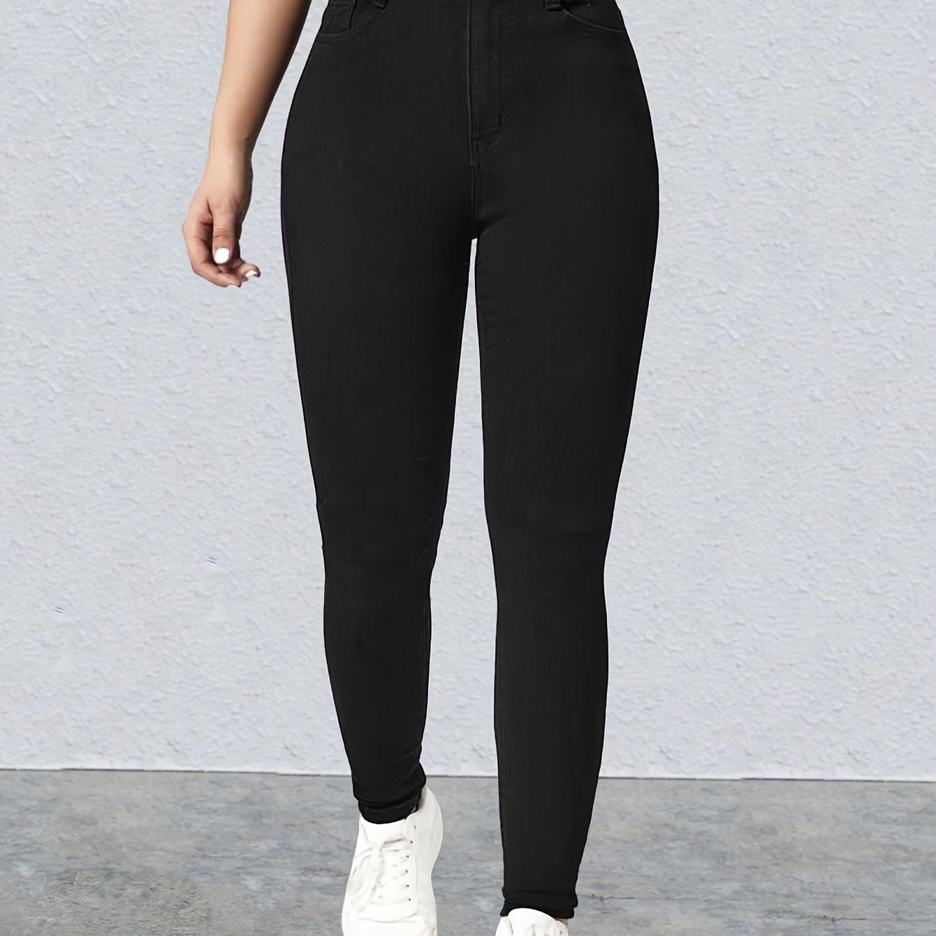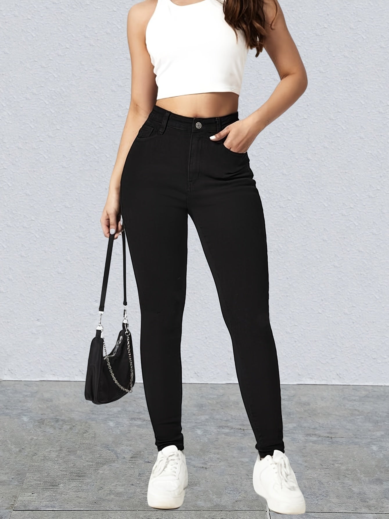 Կանացի բարձր գոտկատեղով սև, ձգվող նեղ ջինսեր՝ նորաձև թեք գրպաններ, հարմարավետ ռայոնային խառնուրդ, հագուստ բոլոր սեզոններին