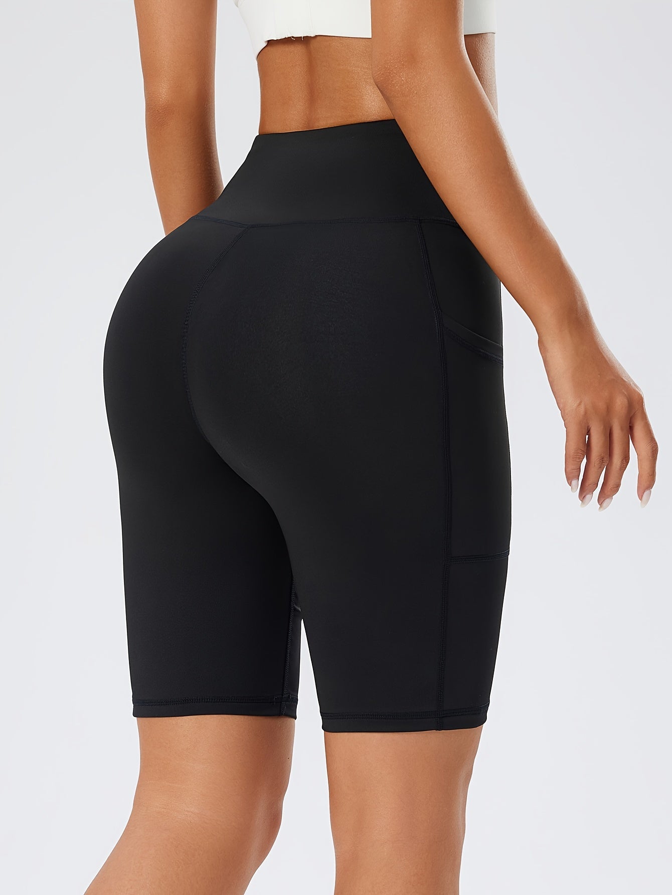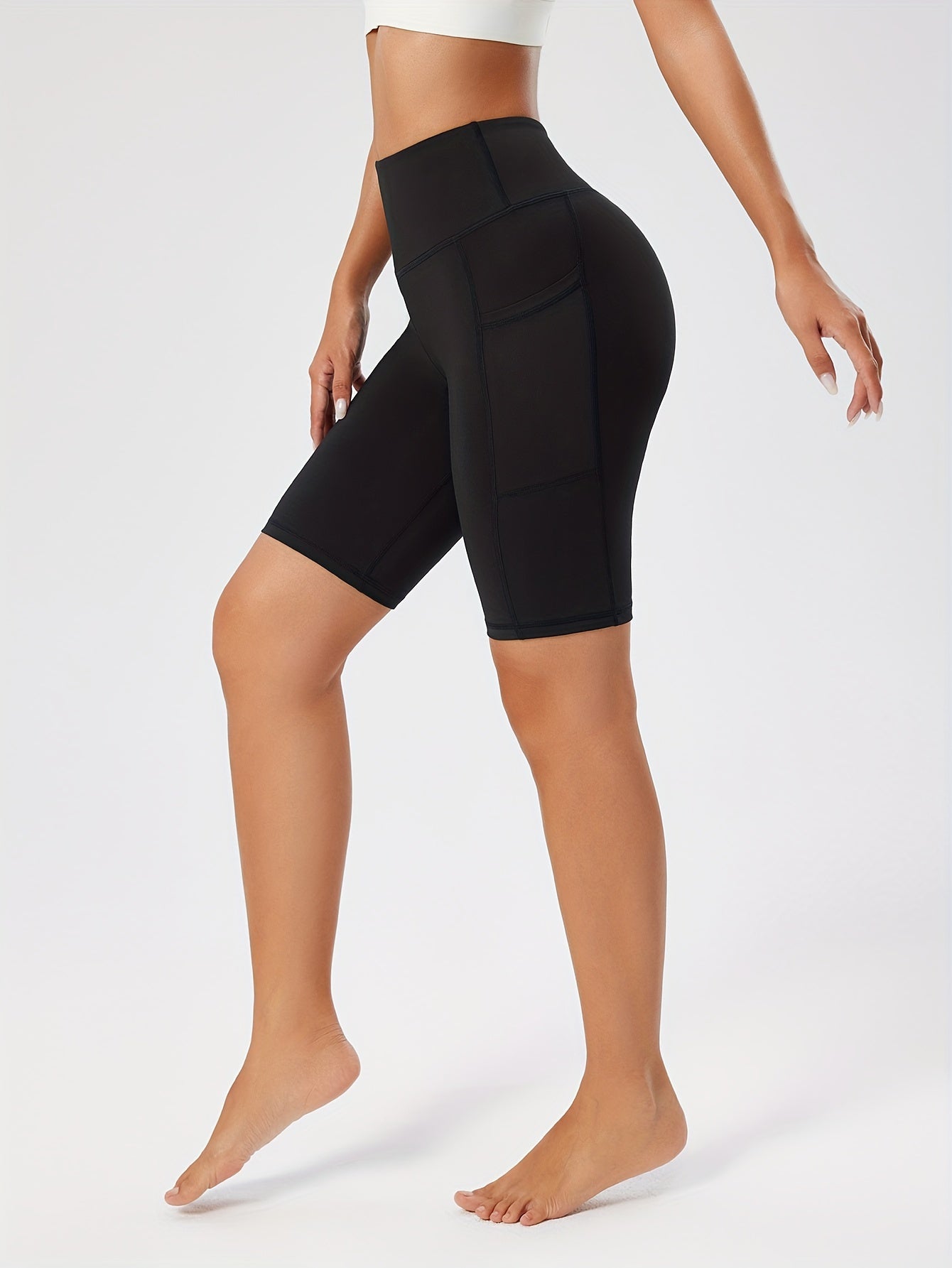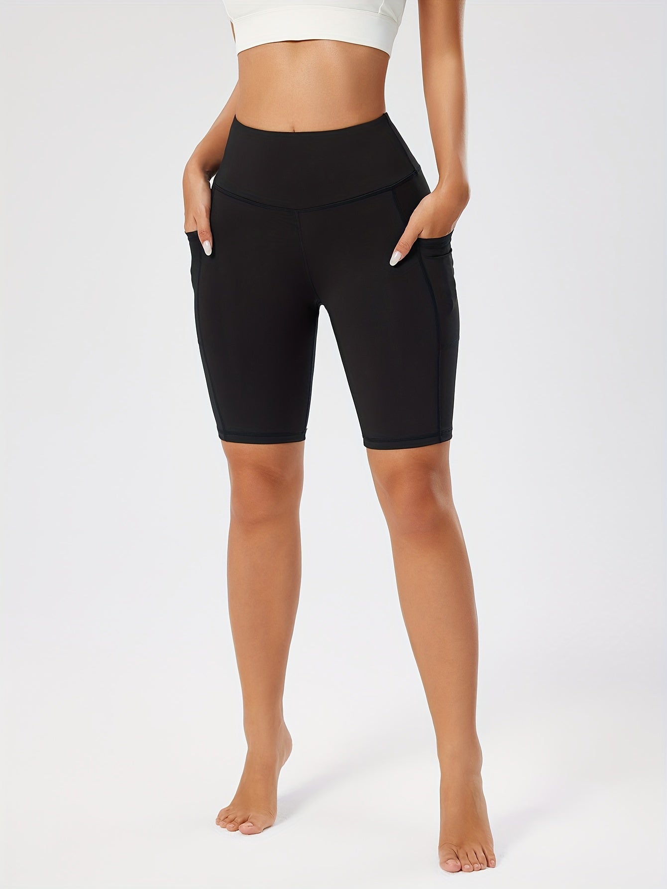 Կանացի բարձր գոտկատեղով սև յոգայի շորտեր գրպաններով - որովայնի հսկողություն, վազքի և մարզման ձգվող լեգինսներ, դիմացկուն պոլիեսթեր/սպանդեքս խառնուրդ, նրբագեղ դիզայն