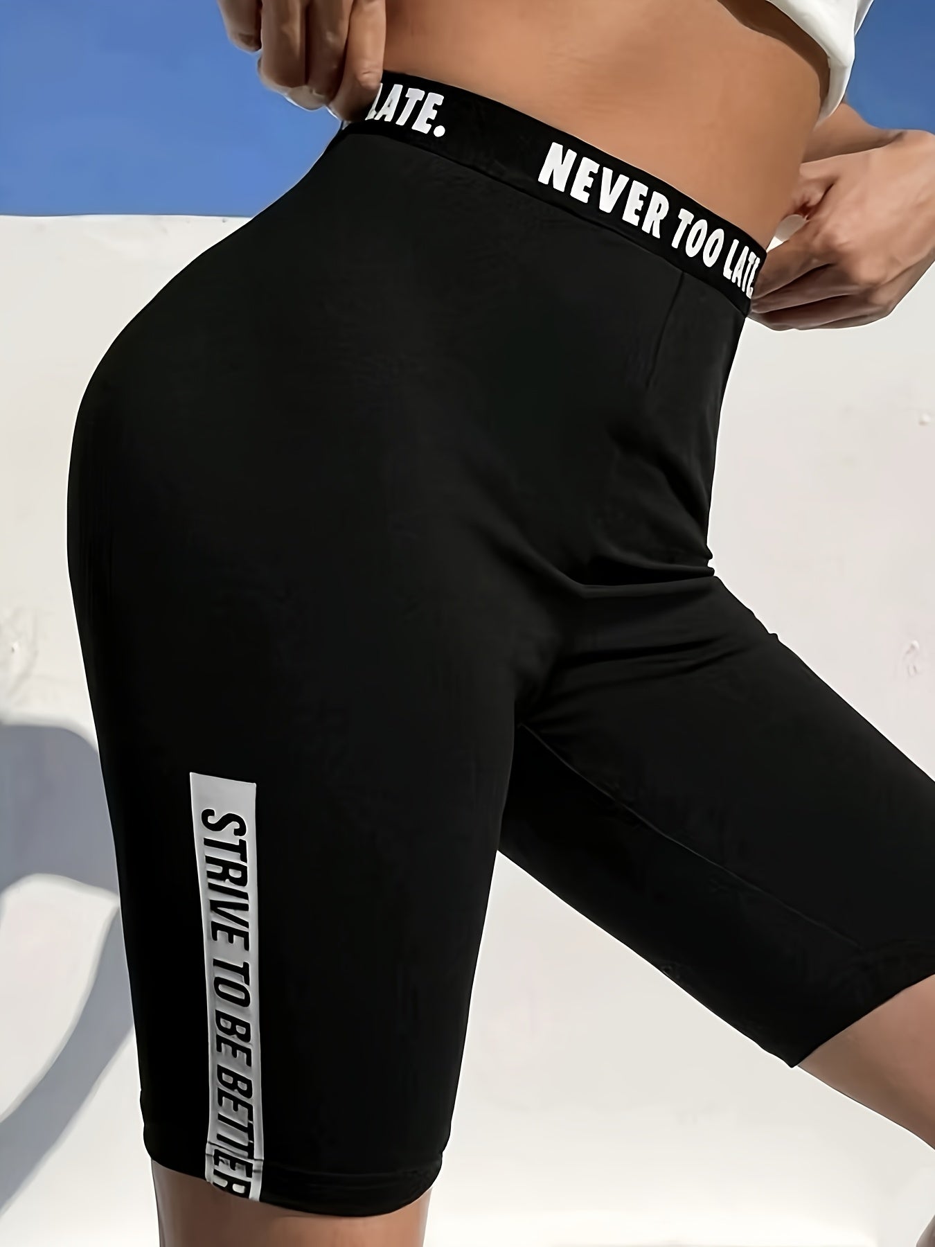 Կանացի բարձր գոտկատեղով յոգայի շորտեր - ձգվող, հետույքը բարձրացնող, պատահական սպորտային հագուստ «NEVER GIVE UP» պրինտով, սև, մինչև ծնկները գարուն/ամառ/աշուն ձևավորում, մոտիվացիոն հագուստ | Ծնկների երկարությամբ շորտեր | Բրենդային սպորտային հագուստ