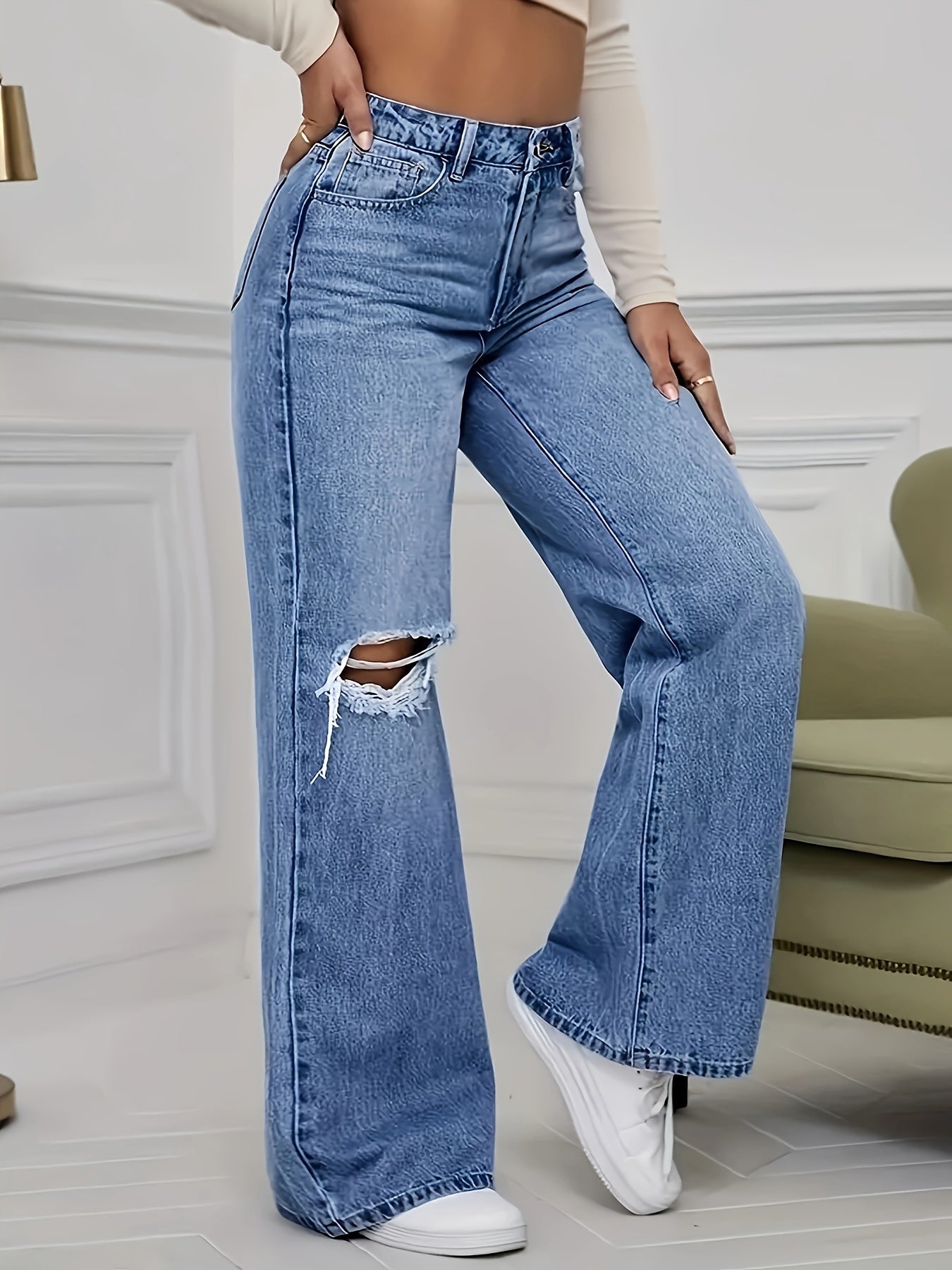 Կանացի բարձր գոտկատեղով հանգստացնող ջինսեր՝ պատռված դետալներով, գործվածքի և պոլիեսթերի խառնուրդ, դասական ոճ, լվացվող մեքենայում