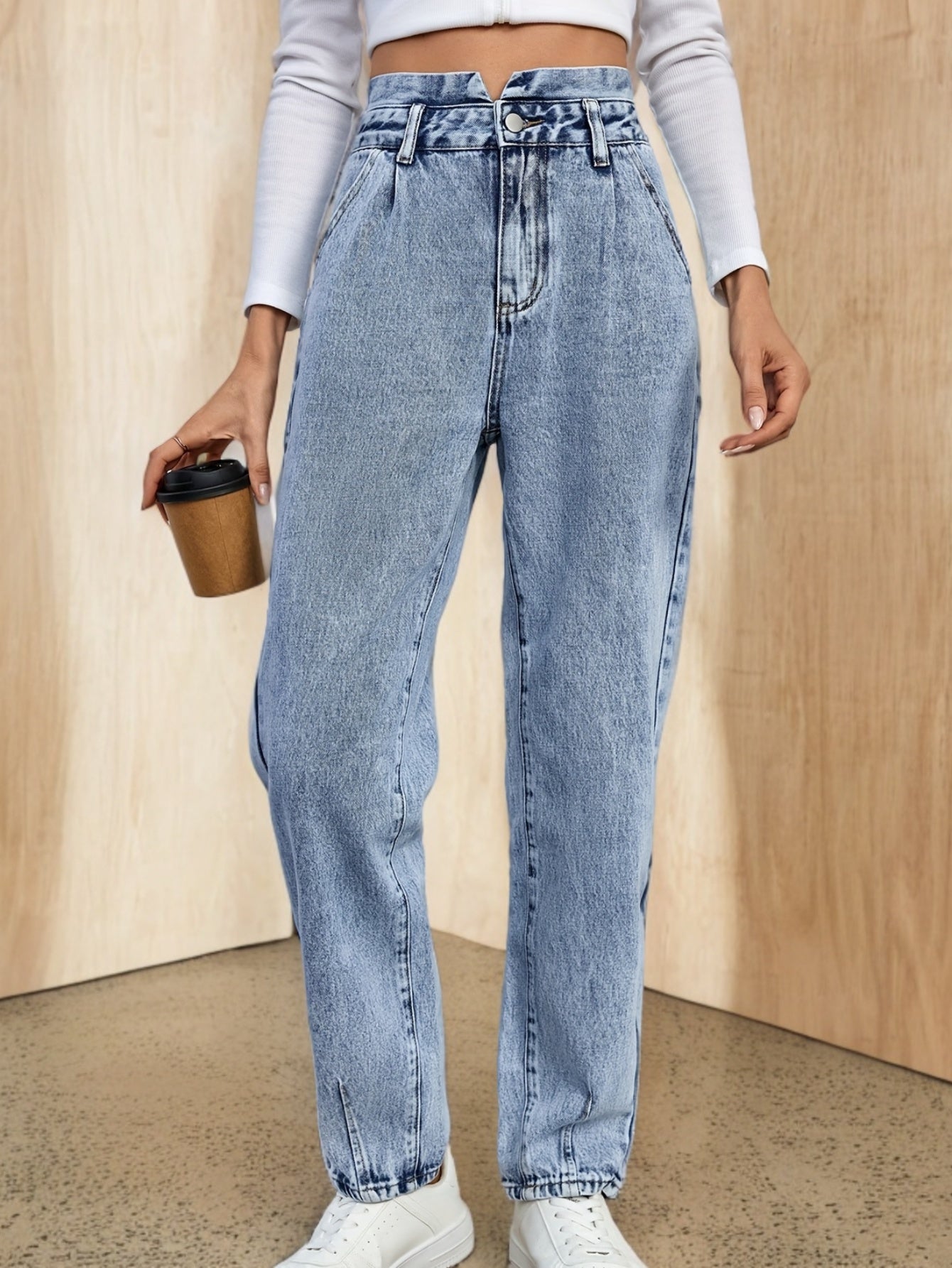 Կանացի բարձր գոտկատեղով ուղիղ ջինսե ջինսեր՝ բաց կապույտ, կտրատած գրպաններ, փակվող կոճակներով, չձգվող բամբակ, ամենօրյա հագուստ՝ գարուն/աշուն