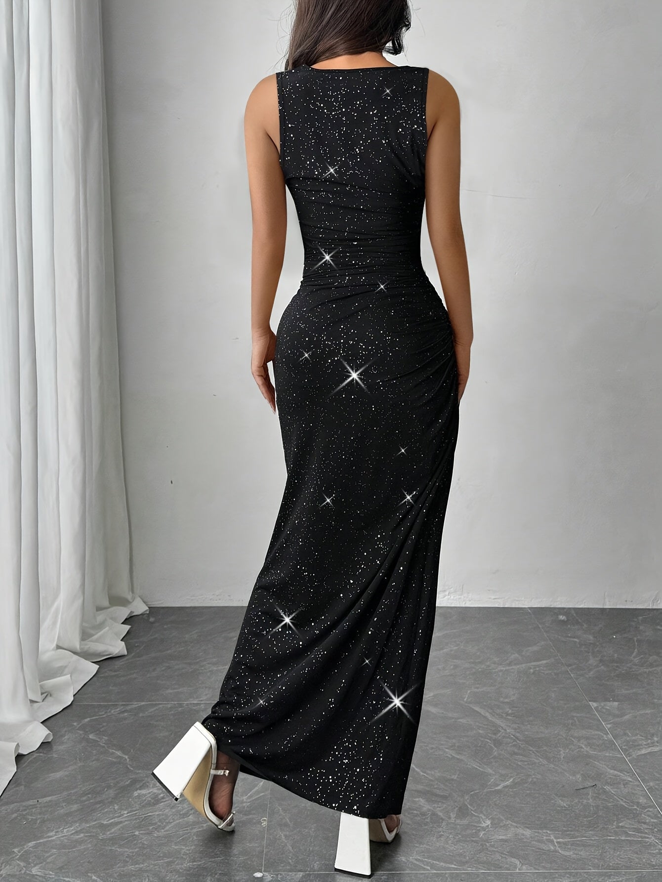 Կանացի երկար զգեստ՝ կլոր վզով, փայլուն ծալքավոր դիզայնով, հարմար է գարնանը, ամռանը և աշնանը։