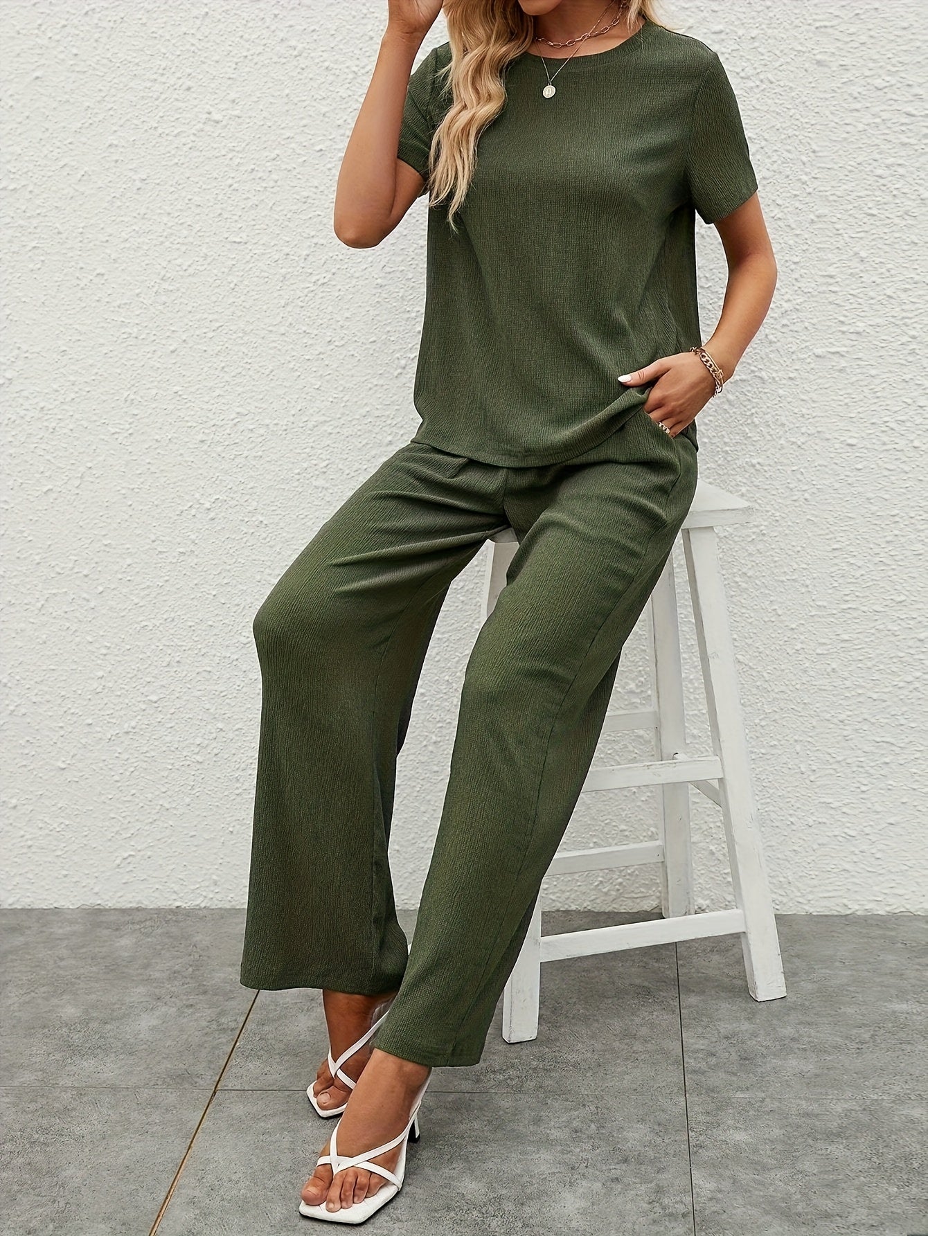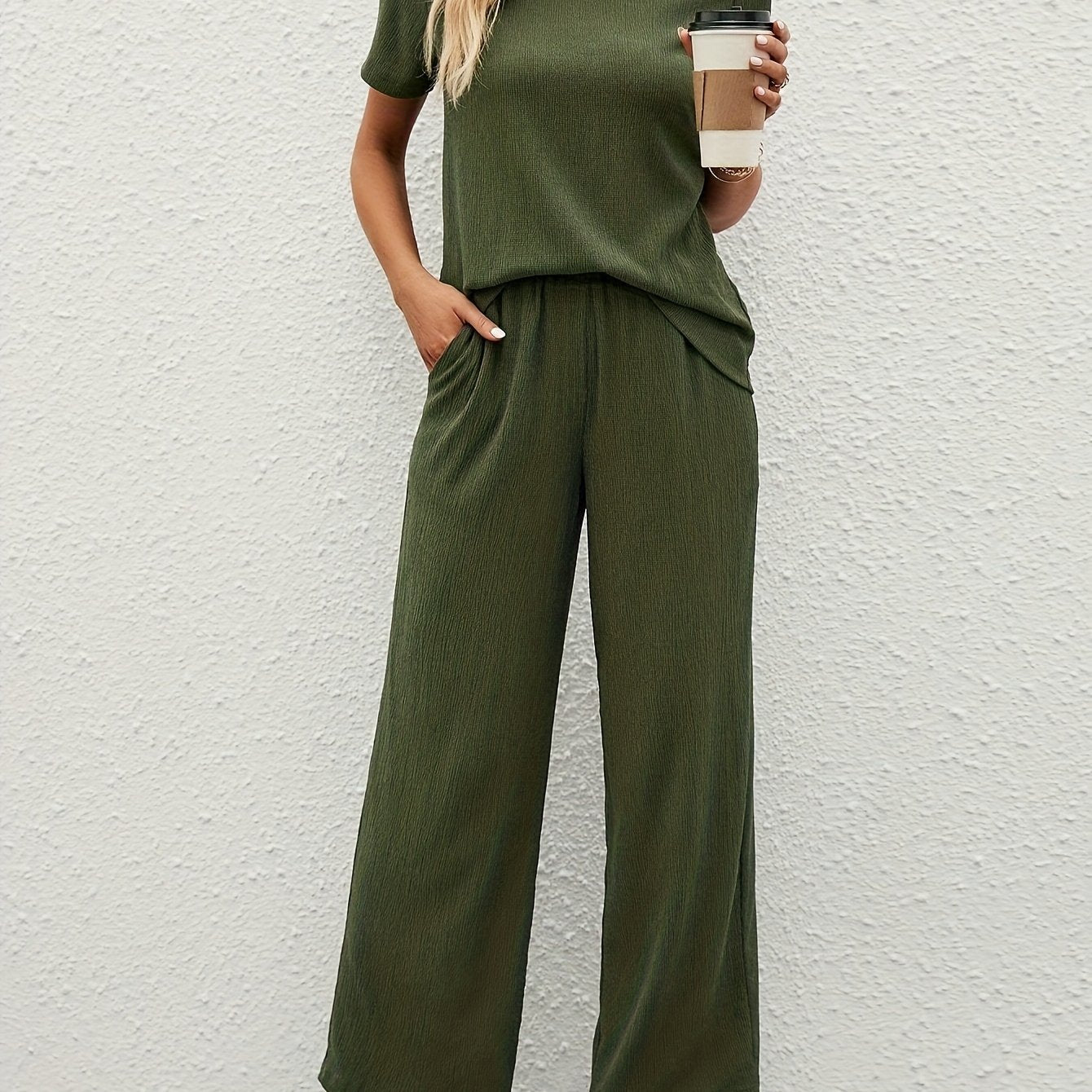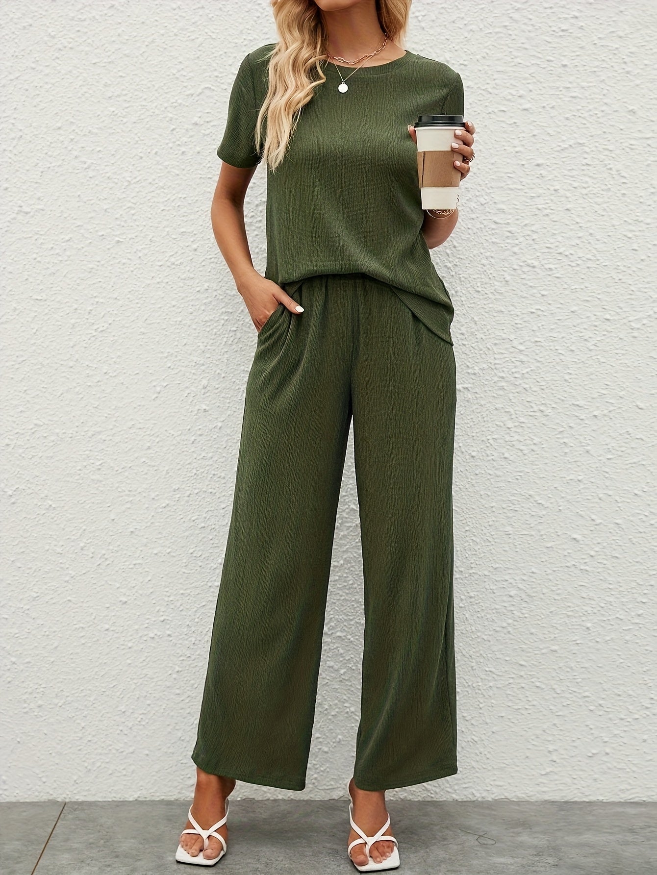 Women'S Olive Green Casual T-Shirt and Wide-Leg Pants Set - Solid Color, Loose Fit, Short Sleeve Top with Ruched Detail, High-Waisted Wide-Leg Pants, Perfect for Spring/Summer, Casual Attire|Ruched Detail Top|Comfortable Fit