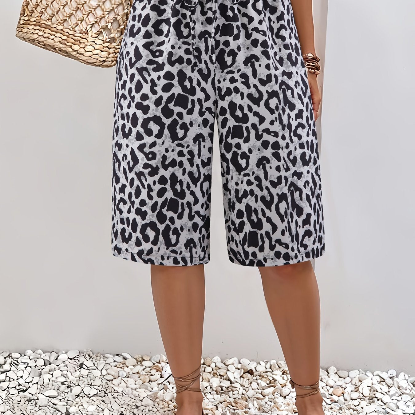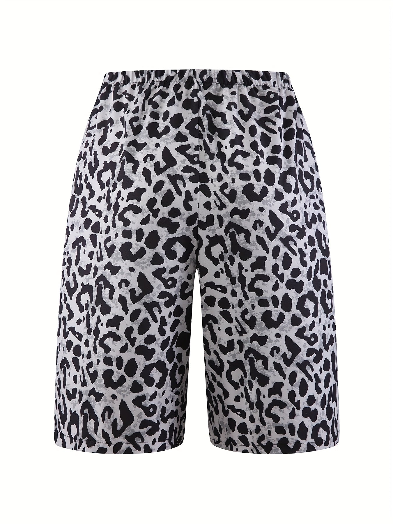 Կանացի Plus Size Leopard Print լայնածավալ լողափնյա շորտեր - պատահական արձակուրդային ոճ, բարձրահարկ արհեստական թելերով, թեթև պոլիեսթեր, սև և մոխրագույն կենդանիների նախշ, կատարյալ ամառային զբոսանքների համար, ծովափնյա շորտեր | Արևադարձային Վակատի