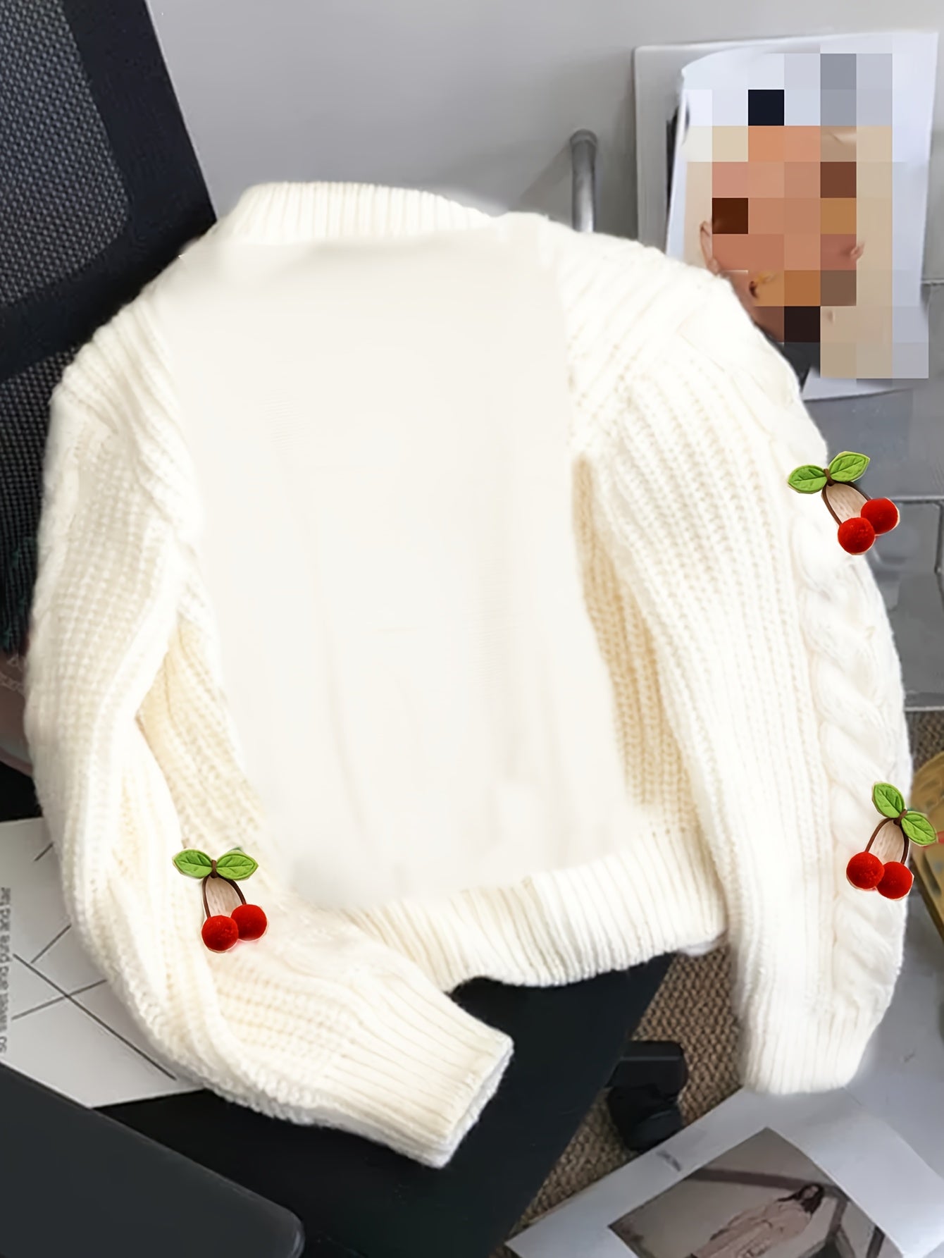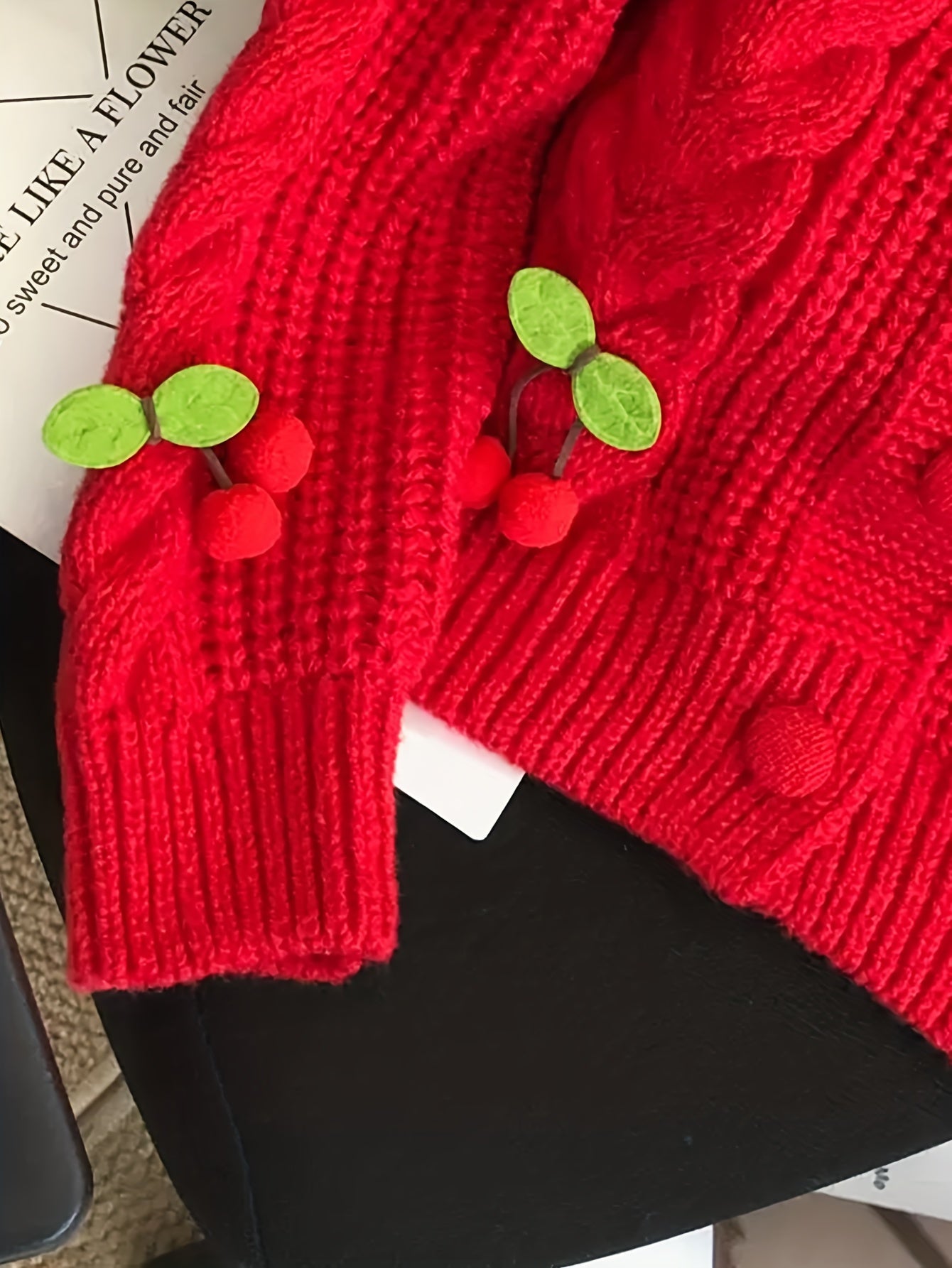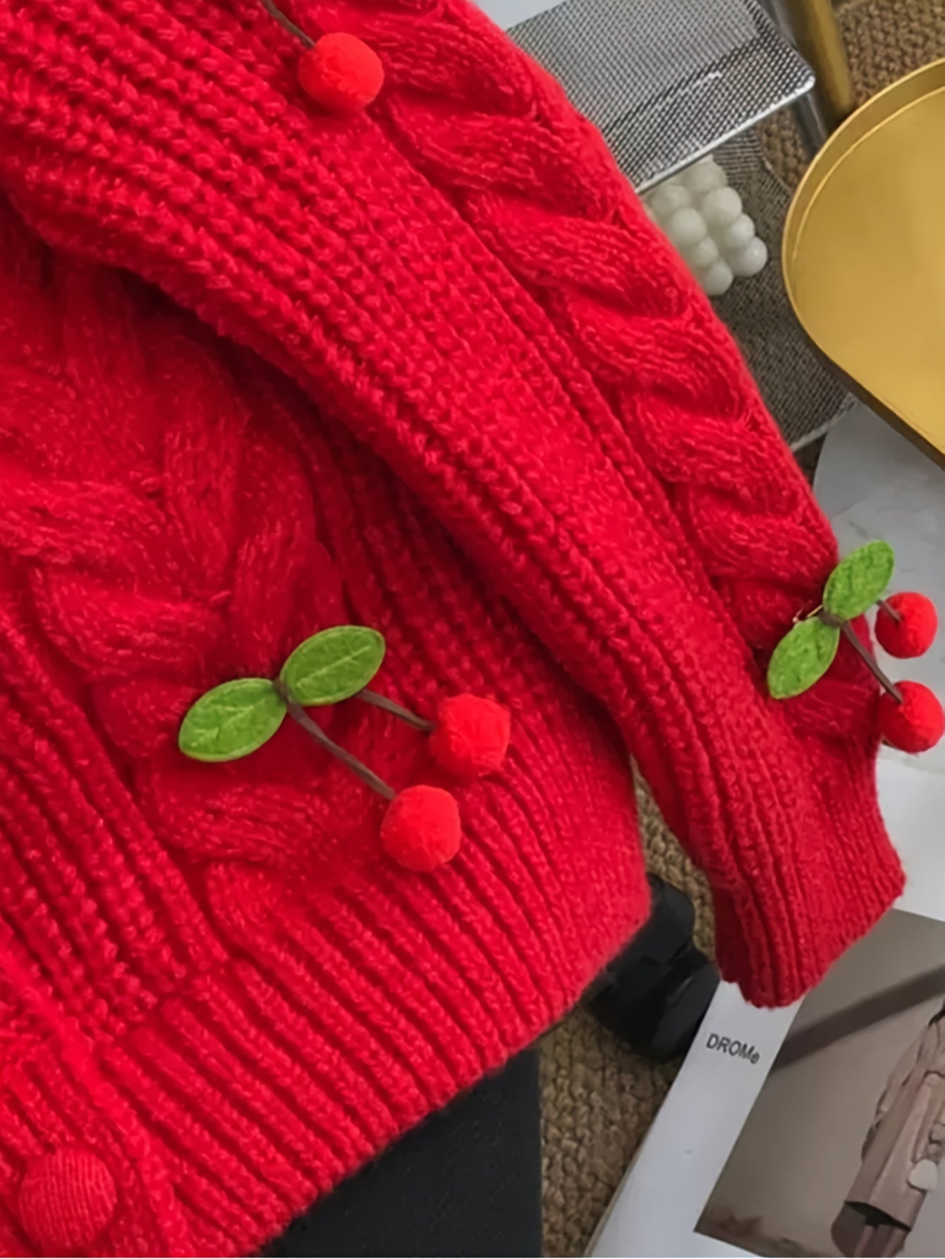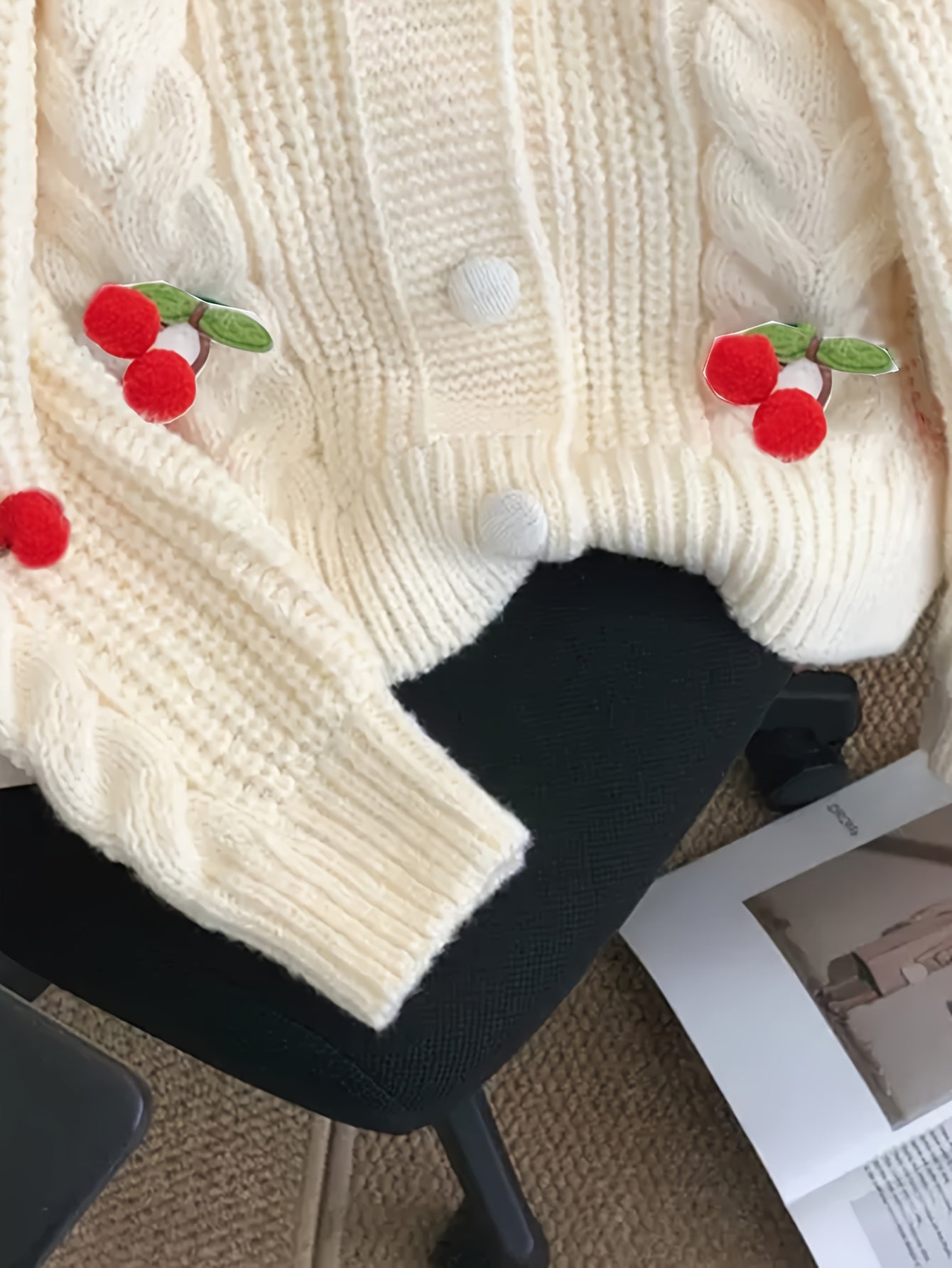 Women'S Purple Cable Cardigan with Cherry & Leaf Embellishments - Cozy Button-Up Sweater for Fall & Winter, Soft & Stylish Design, Perfect for Casual or Holiday Outfits, Winter Cardigan | Cable Cardigan | Buttoned Closure, Sw