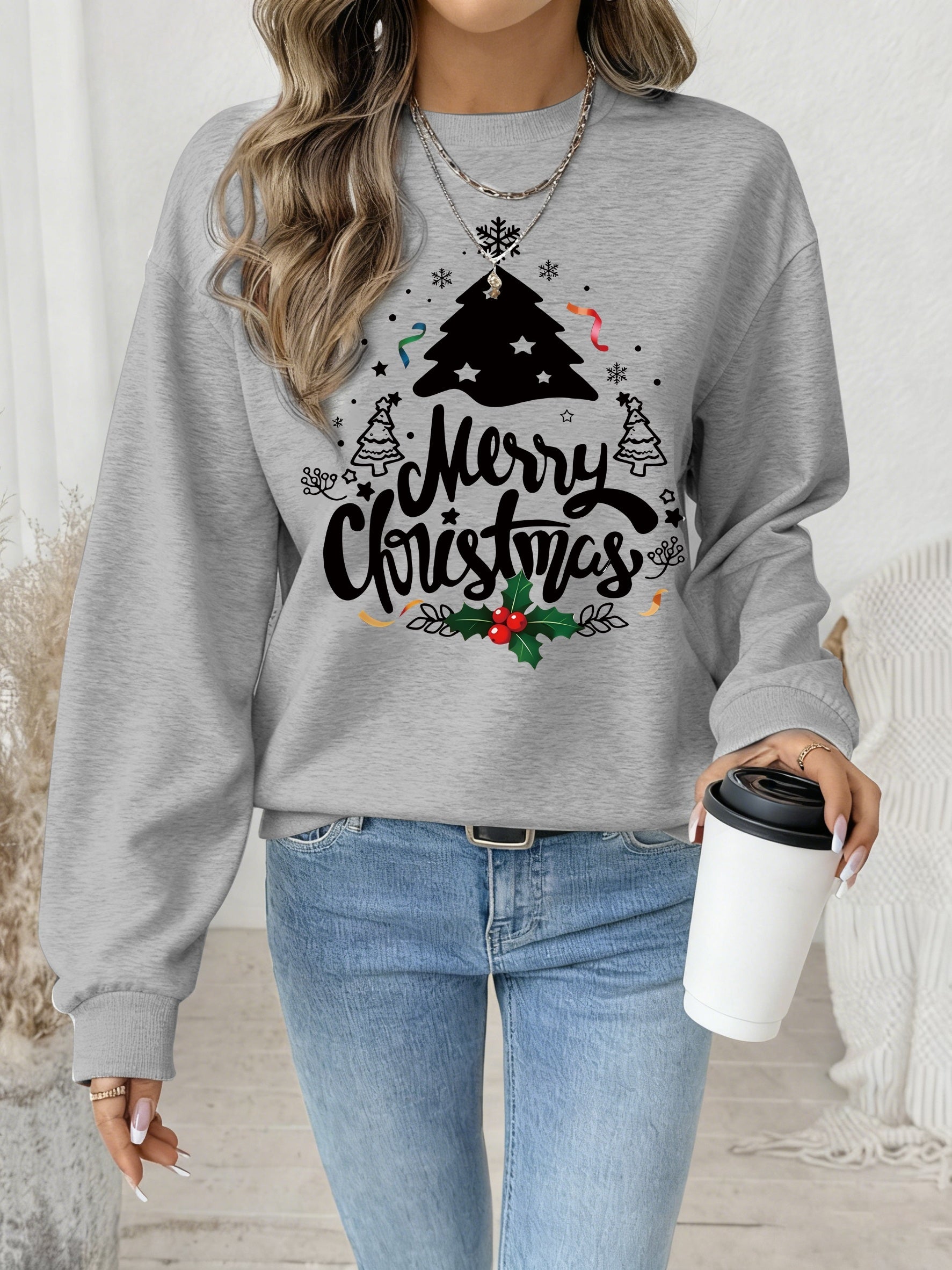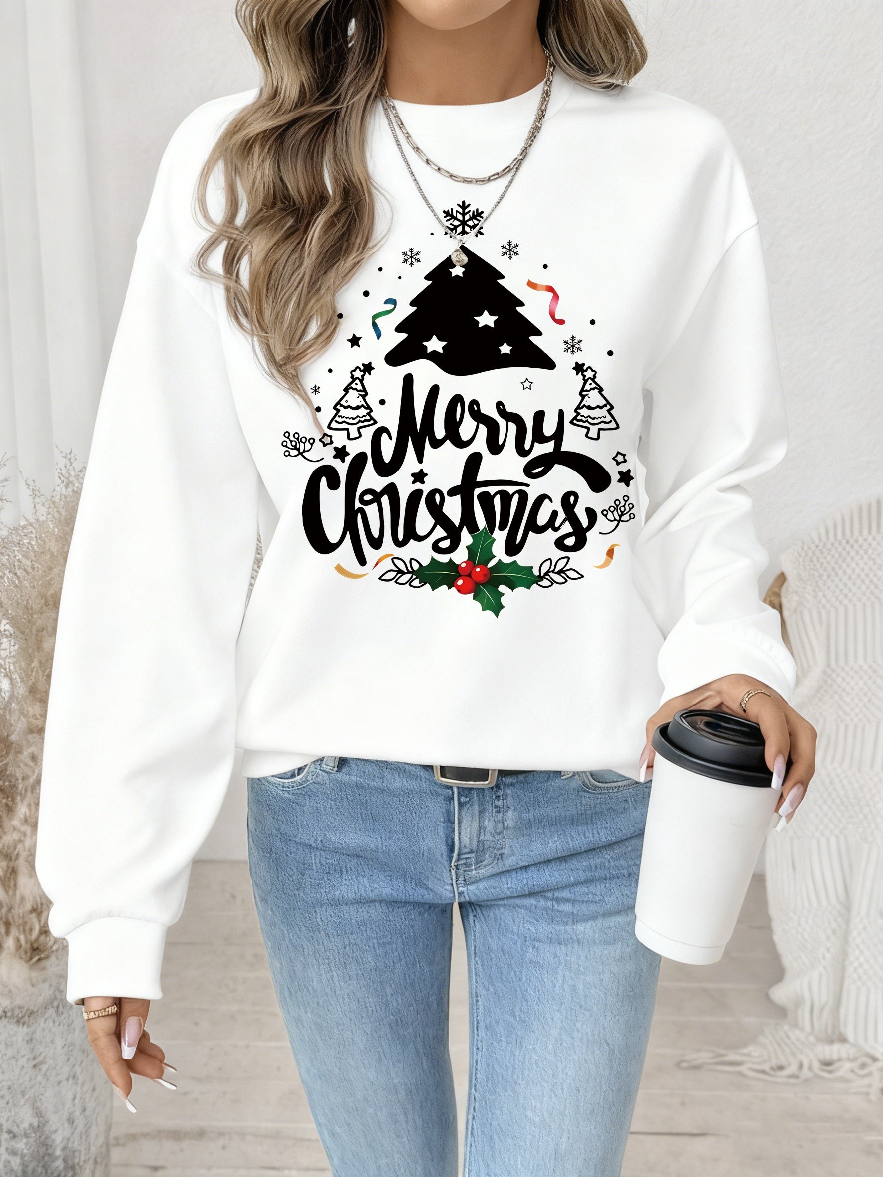 Women's Red Christmas Tree & Lettering Sweater - Cozy Winter Pullover with Round Neck Long Sleeve, Thickened Sweating-Reducing Blouse for Xmas Party Outfits, Family Gatherings (Machine Washable, Autumn/Winter Clothing)