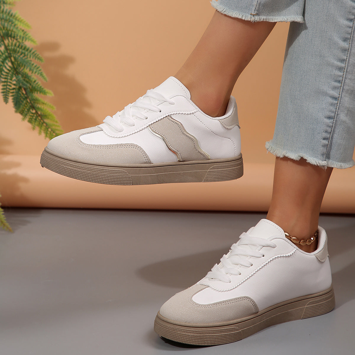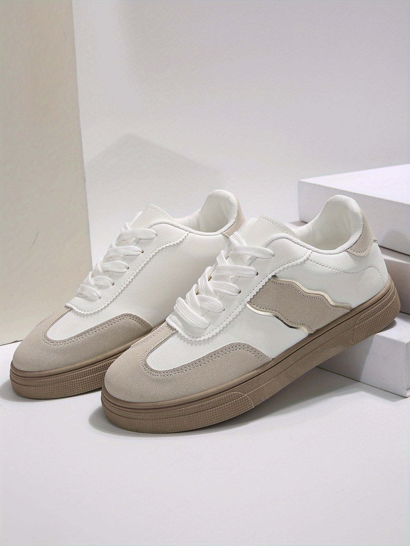 Կանացի ռետրո ոճի սպորտային կոշիկներ - սպիտակ և բեժ ցածր, կապած կոշիկներ՝ ռետինե ներբանով, հարմարավետ, բոլոր եղանակների համար նախատեսված գործվածքային դիզայնով, բազմակողմանի կոշիկներ | Ռետրո ոճի սպորտային կոշիկներ | Երկարակյաց կոշիկներ