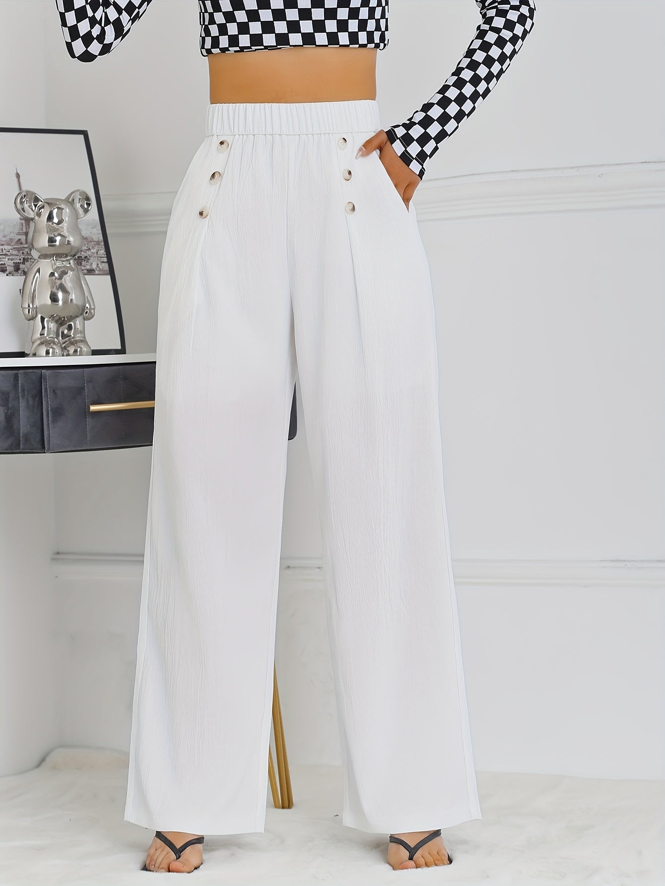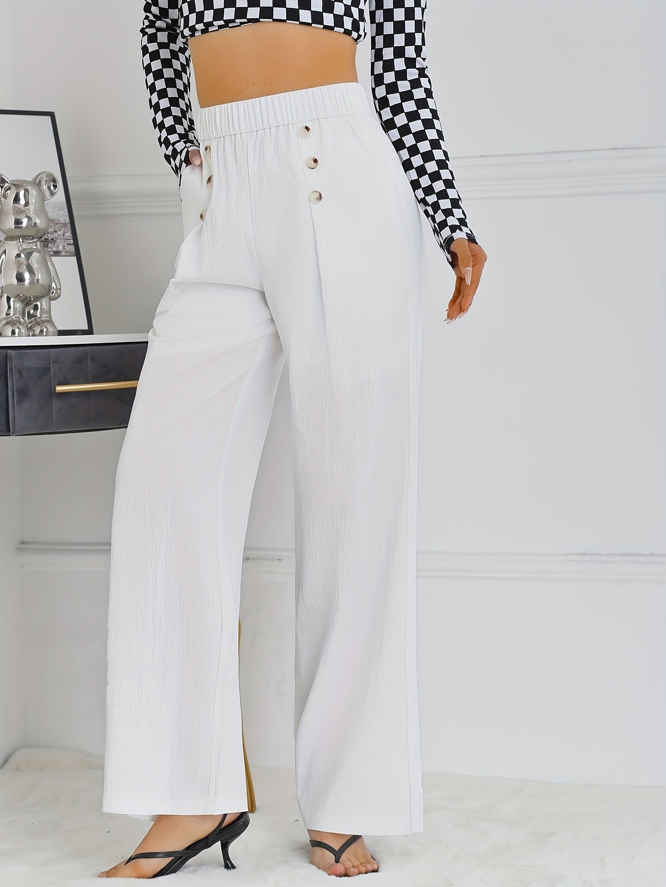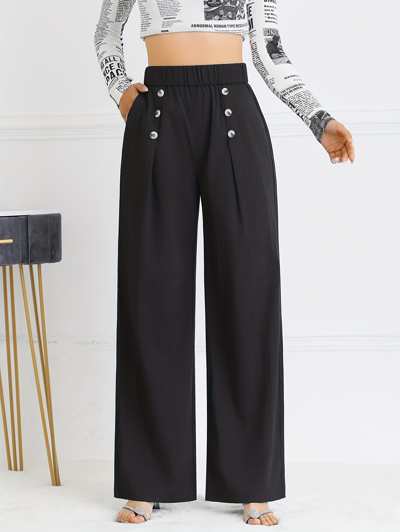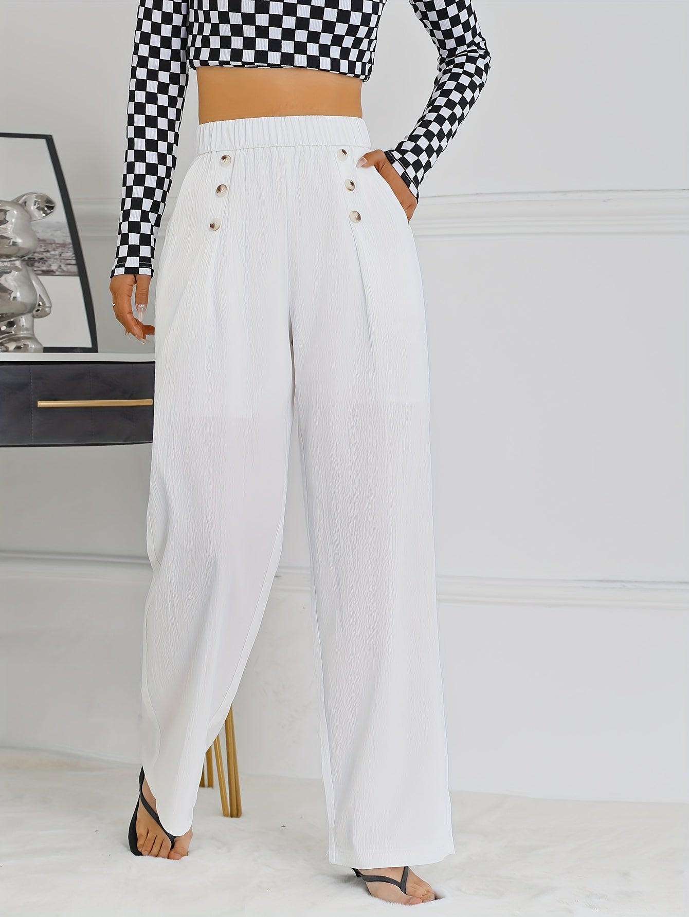 Կանացի պարզ բարձր գոտկատեղով ուղիղ տաբատ, երկար երկարությամբ, միաձույլ գույնի, պոլիեսթեր, էլաստիկ գոտկատեղով, կոճակներով փակվող, սովորական, հանգստյան օրերի առօրյա, գարուն/ամառ