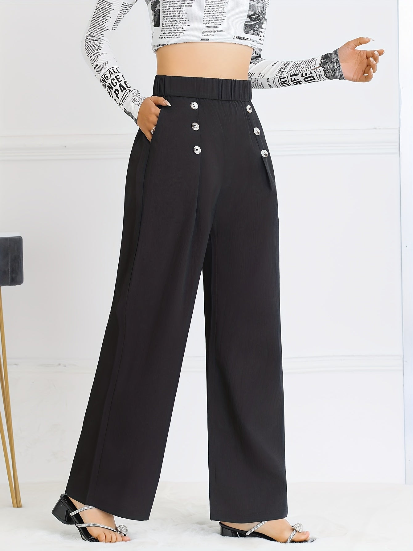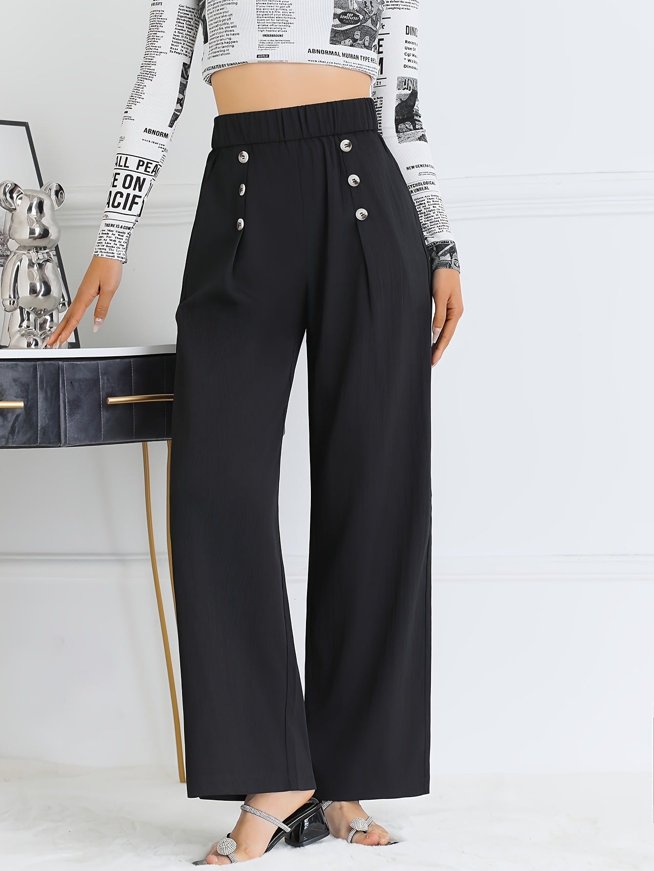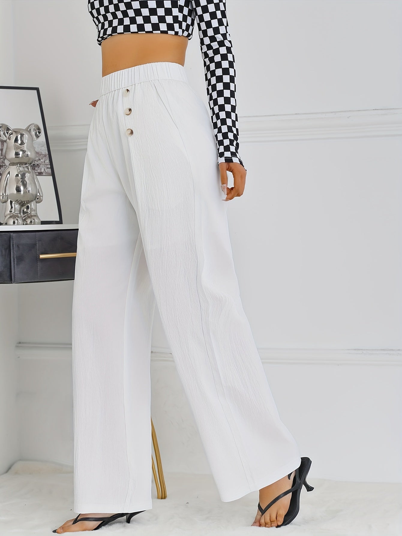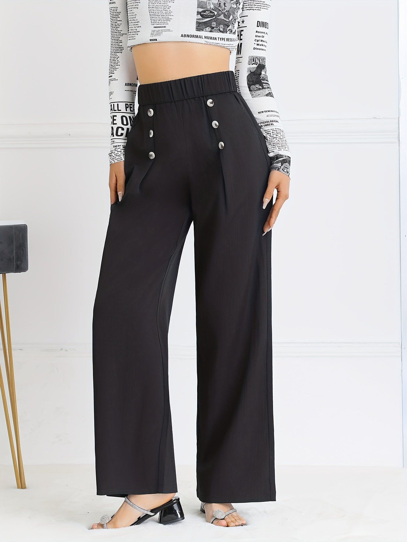 Կանացի պարզ բարձր գոտկատեղով ուղիղ տաբատ, երկար երկարությամբ, միաձույլ գույնի, պոլիեսթեր, էլաստիկ գոտկատեղով, կոճակներով փակվող, սովորական, հանգստյան օրերի առօրյա, գարուն/ամառ